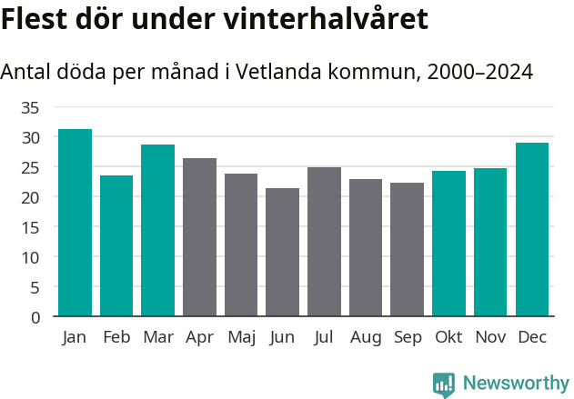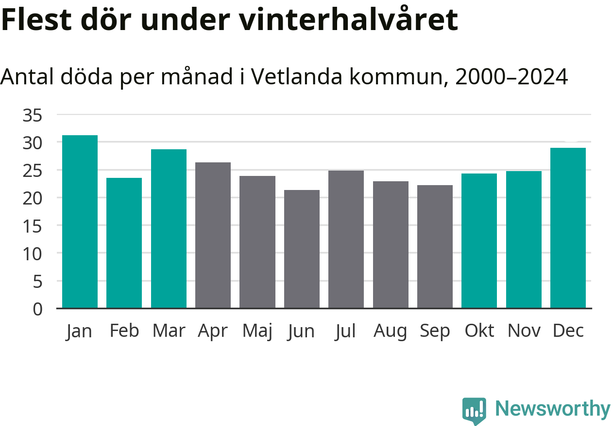 Så är det även i Vetlanda. Under de senaste 25 åren har 4 017 personer dött i kommunen under vinterhalvåret, jämfört med 3 453 personer under sommarhalvåret – alltså 16 procent fler.