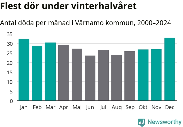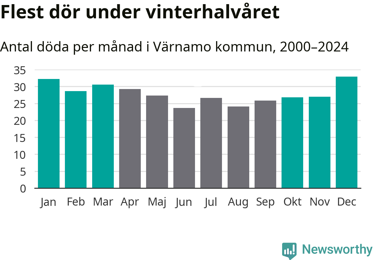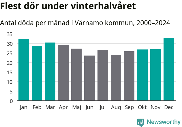 Så är det även i Värnamo. Under de senaste 25 åren har 4 457 personer dött i kommunen under vinterhalvåret, jämfört med 3 806 personer under sommarhalvåret – alltså 17 procent fler.