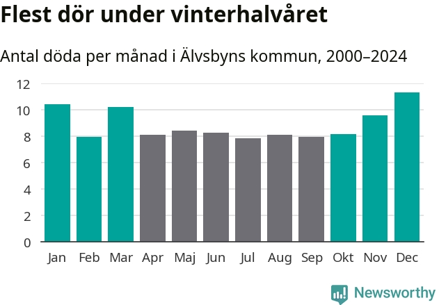 Så är det även i Älvsbyn. Under de senaste 25 åren har 1 432 personer dött i kommunen under vinterhalvåret, jämfört med 1 202 personer under sommarhalvåret – alltså 19 procent fler.