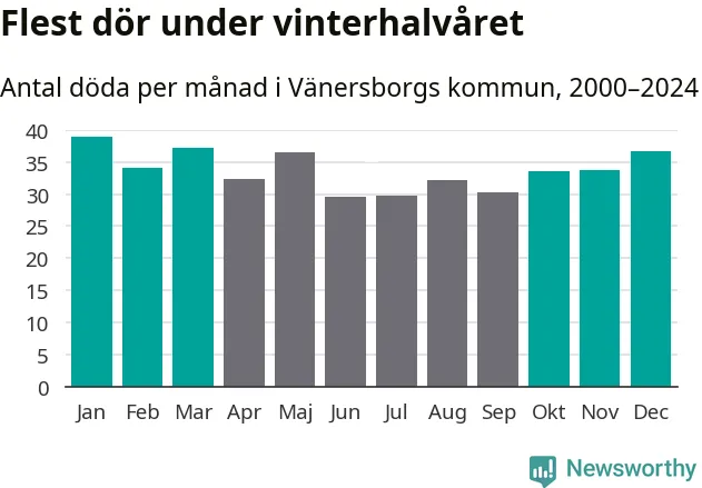 Så är det även i Vänersborg. Under de senaste 25 åren har 5 252 personer dött i kommunen under vinterhalvåret, jämfört med 4 687 personer under sommarhalvåret – alltså tolv procent fler.