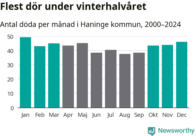 Så är det även i Haninge. Under de senaste 25 åren har 6 659 personer dött i kommunen under vinterhalvåret, jämfört med 6 038 personer under sommarhalvåret – alltså tio procent fler.