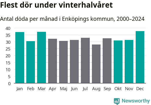 Så är det även i Enköping. Under de senaste 25 åren har 5 070 personer dött i kommunen under vinterhalvåret, jämfört med 4 568 personer under sommarhalvåret – alltså elva procent fler.