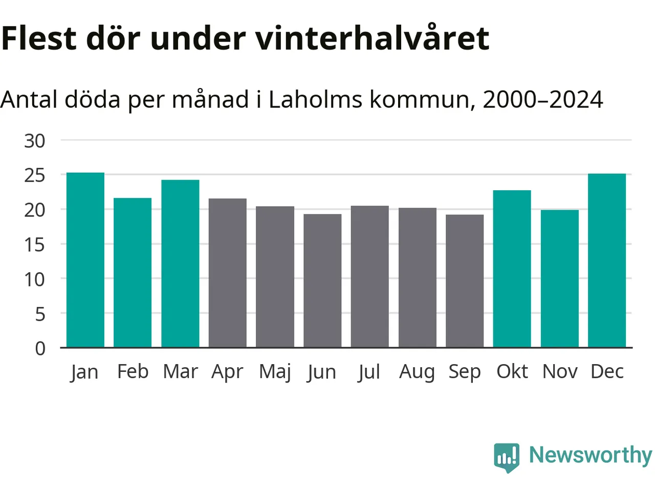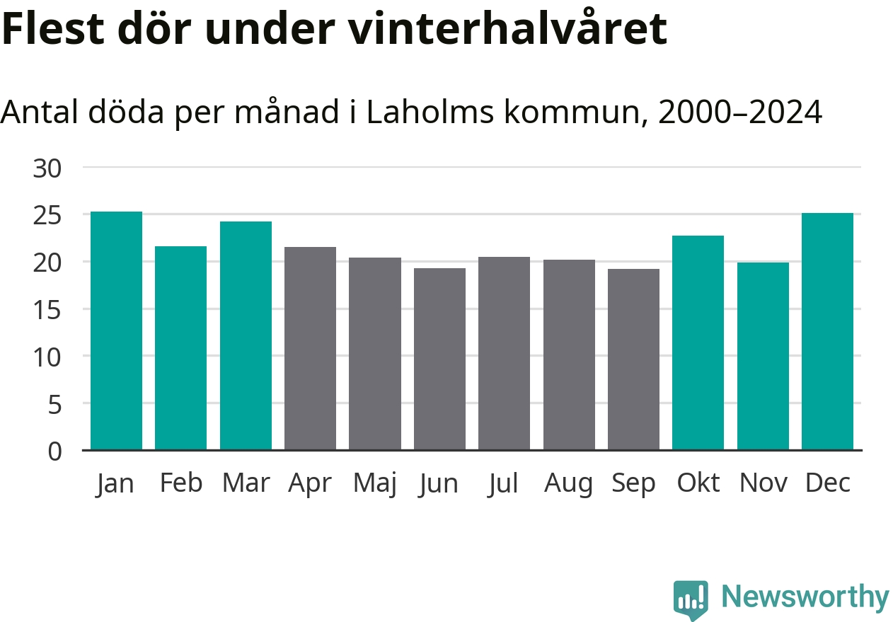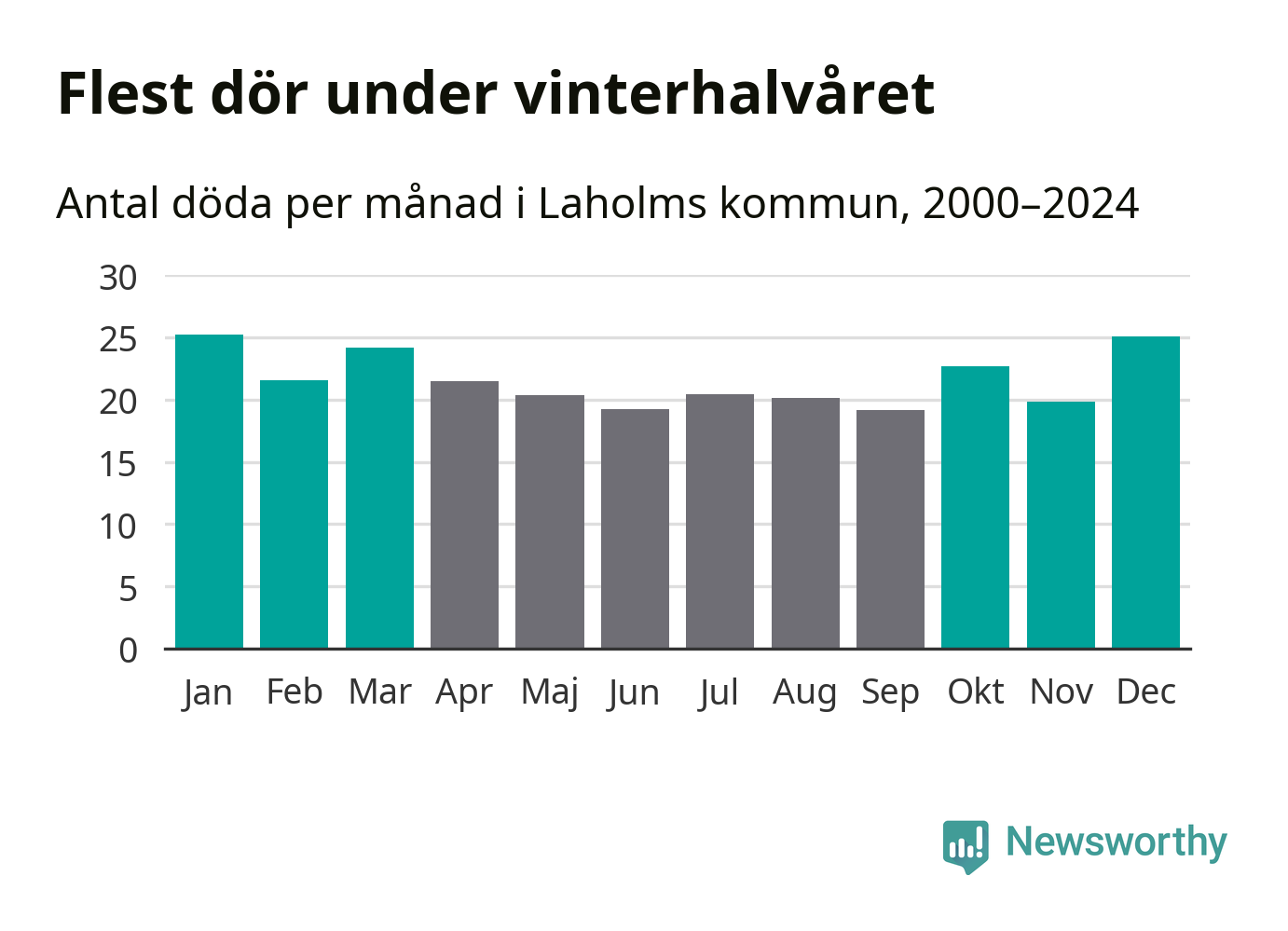 Så är det även i Laholm. Under de senaste 25 åren har 3 394 personer dött i kommunen under vinterhalvåret, jämfört med 3 008 personer under sommarhalvåret – alltså 13 procent fler.