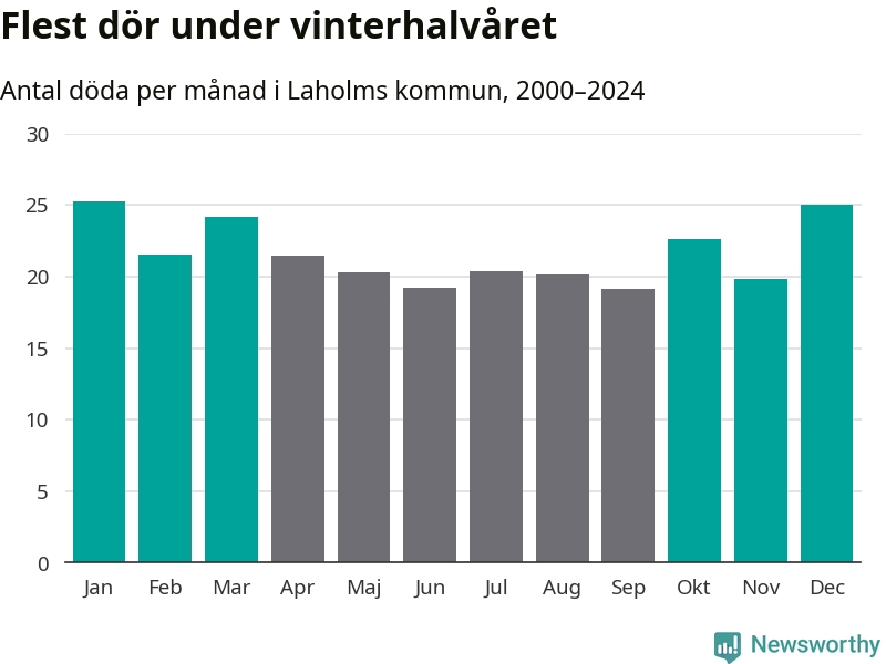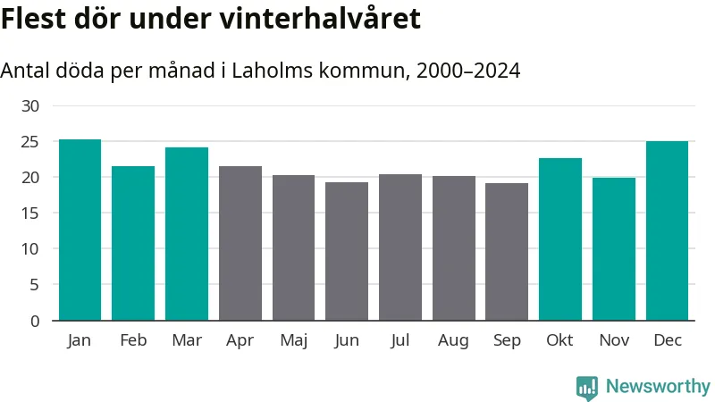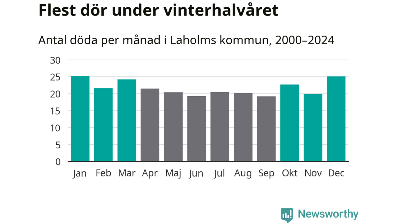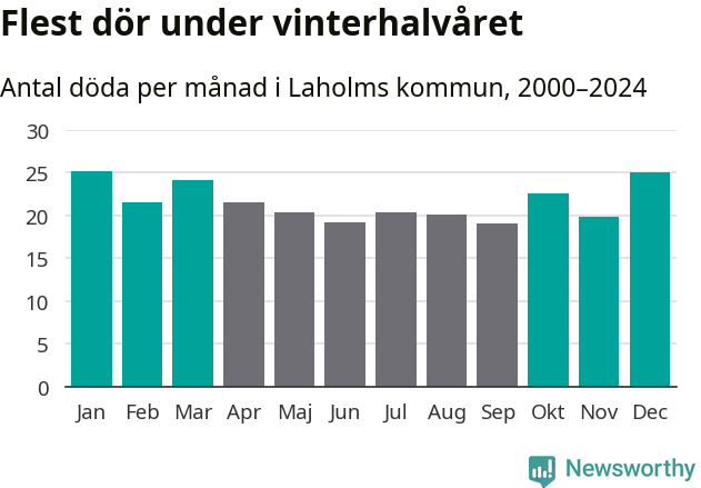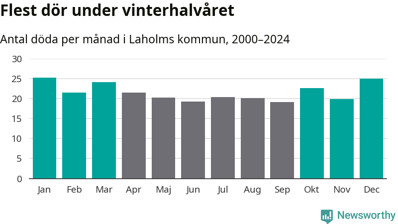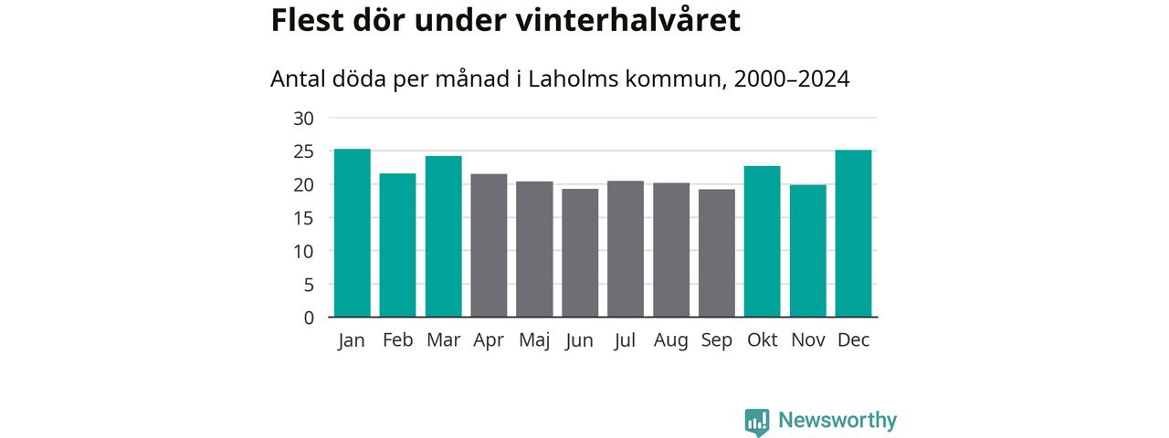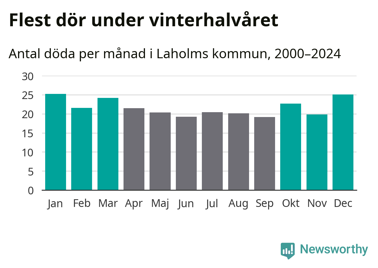Så är det även i Laholm. Under de senaste 25 åren har 3 394 personer dött i kommunen under vinterhalvåret, jämfört med 3 008 personer under sommarhalvåret – alltså 13 procent fler.