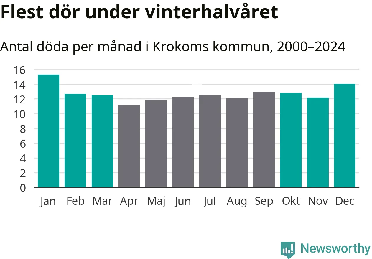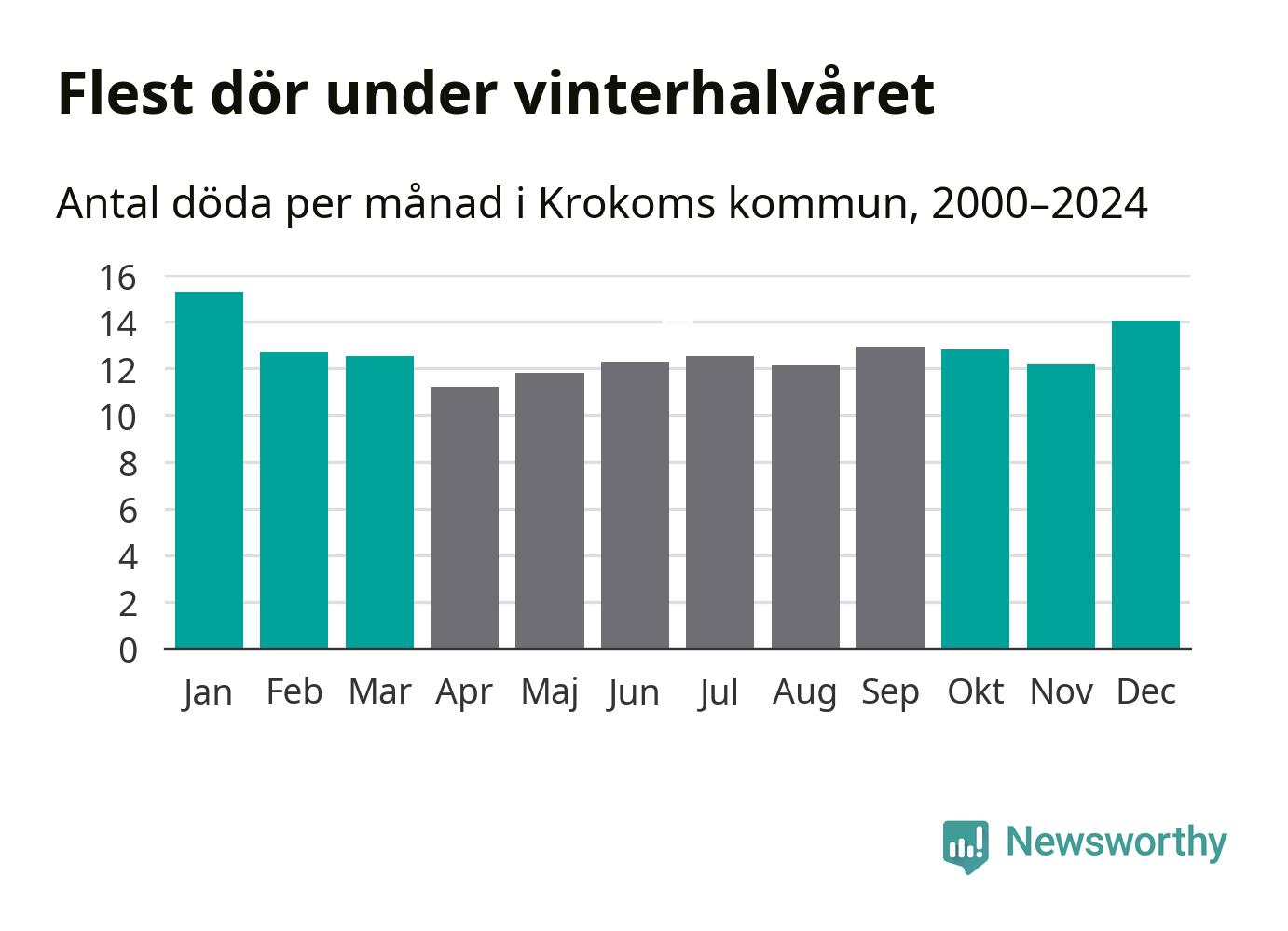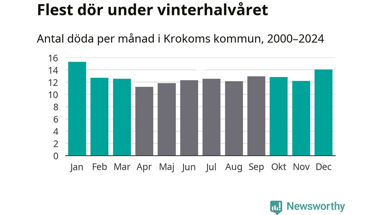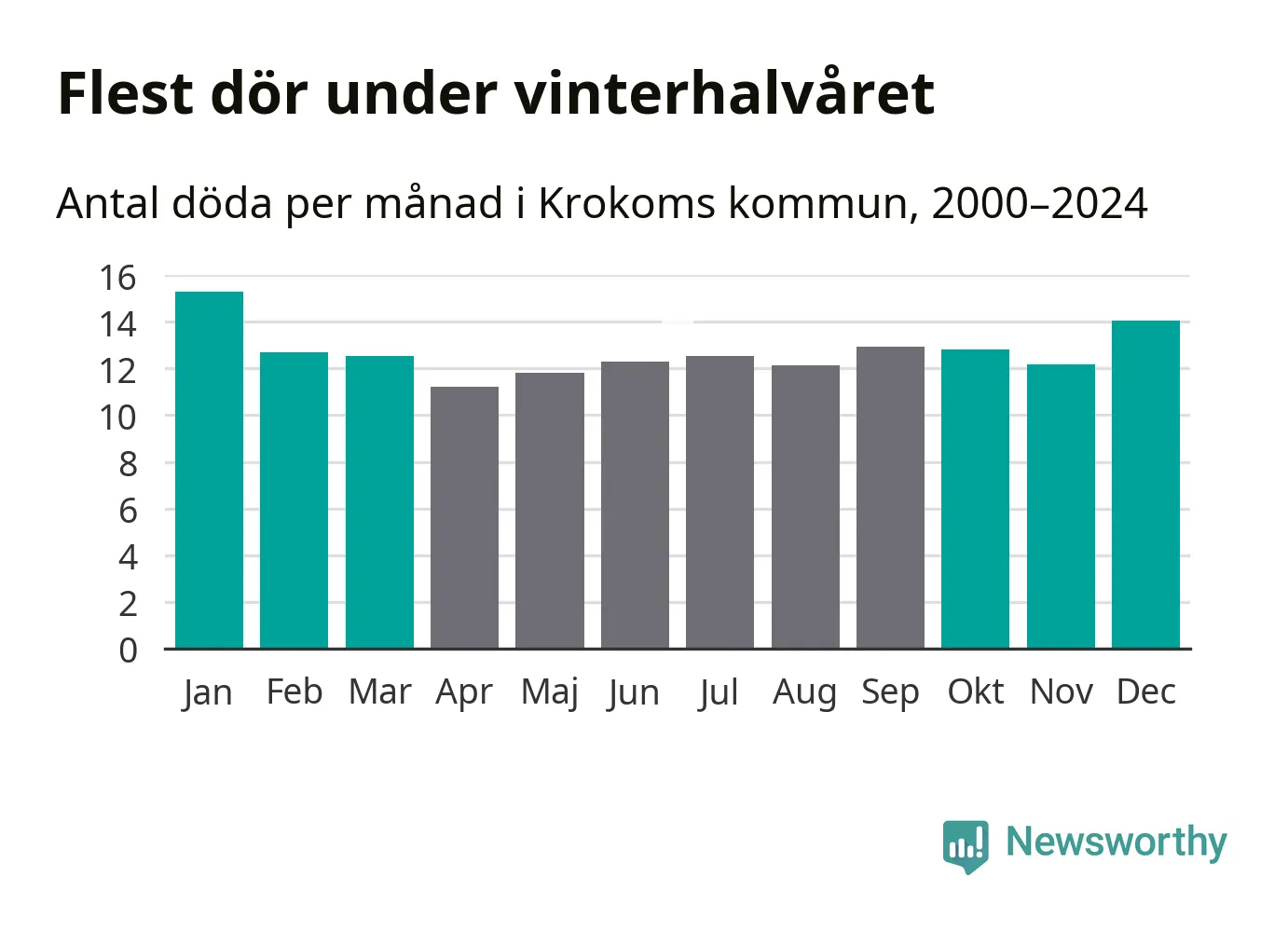 Så är det även i Krokom. Under de senaste 25 åren har 1 927 personer dött i kommunen under vinterhalvåret, jämfört med 1 846 personer under sommarhalvåret – alltså fyra procent fler.