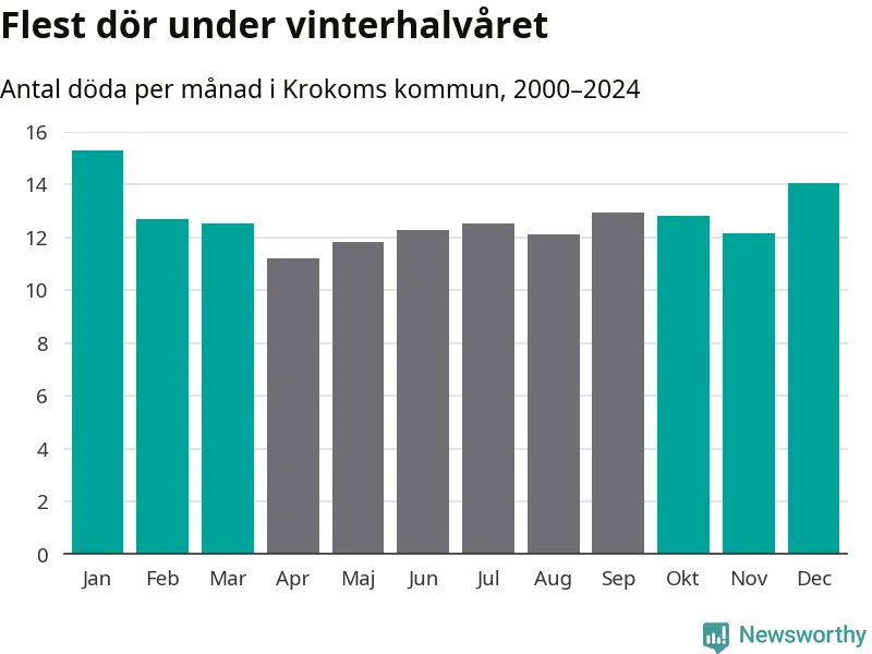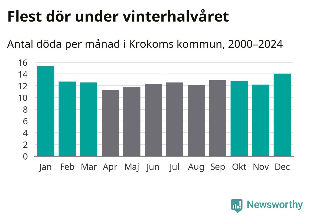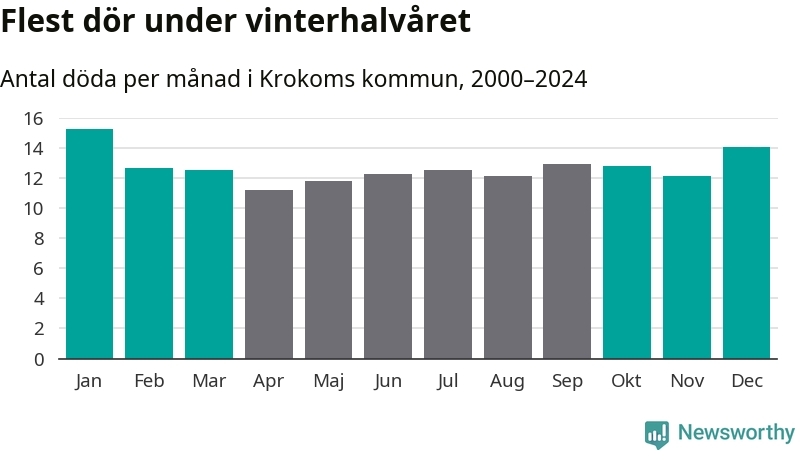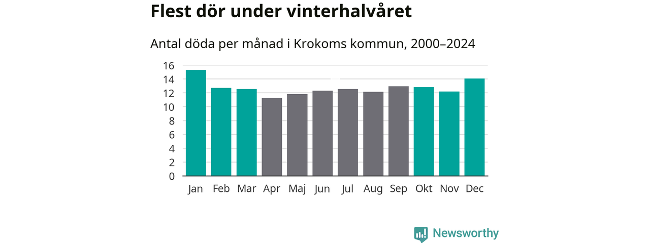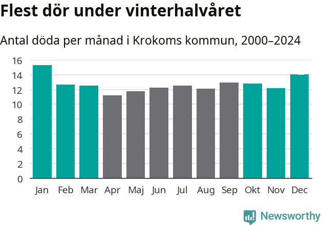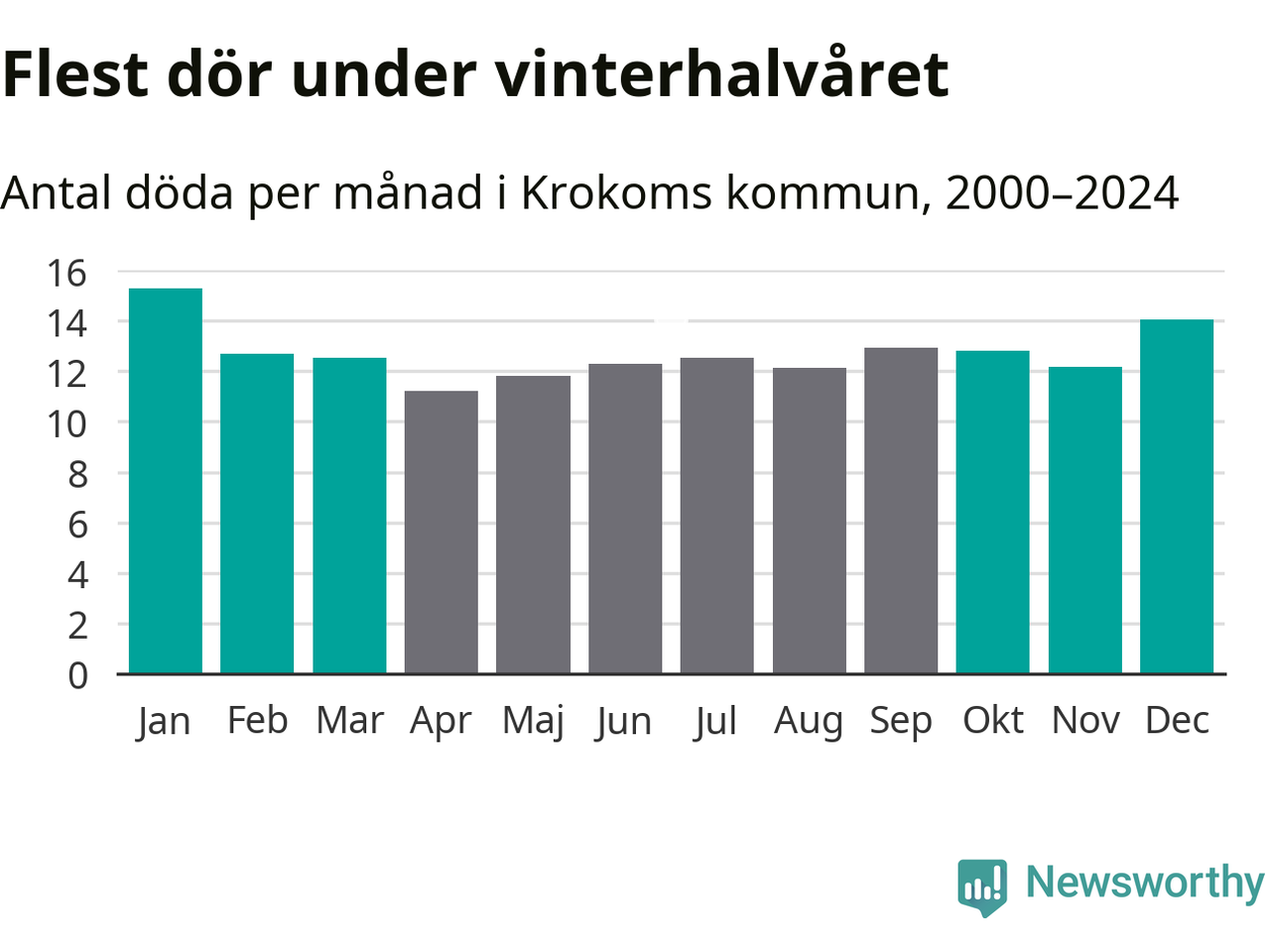 Så är det även i Krokom. Under de senaste 25 åren har 1 927 personer dött i kommunen under vinterhalvåret, jämfört med 1 846 personer under sommarhalvåret – alltså fyra procent fler.