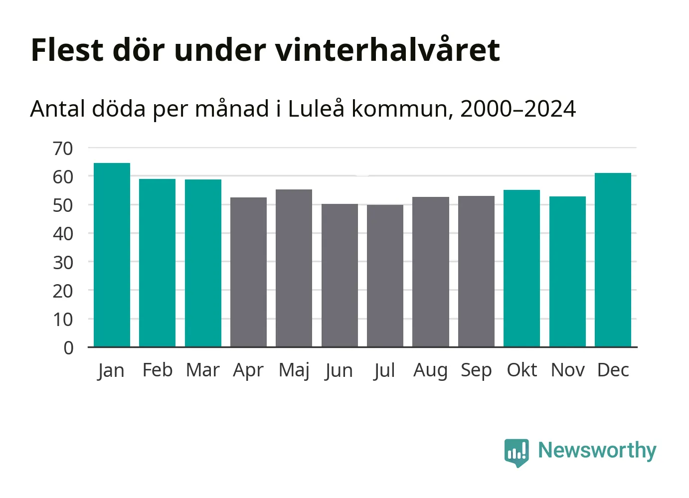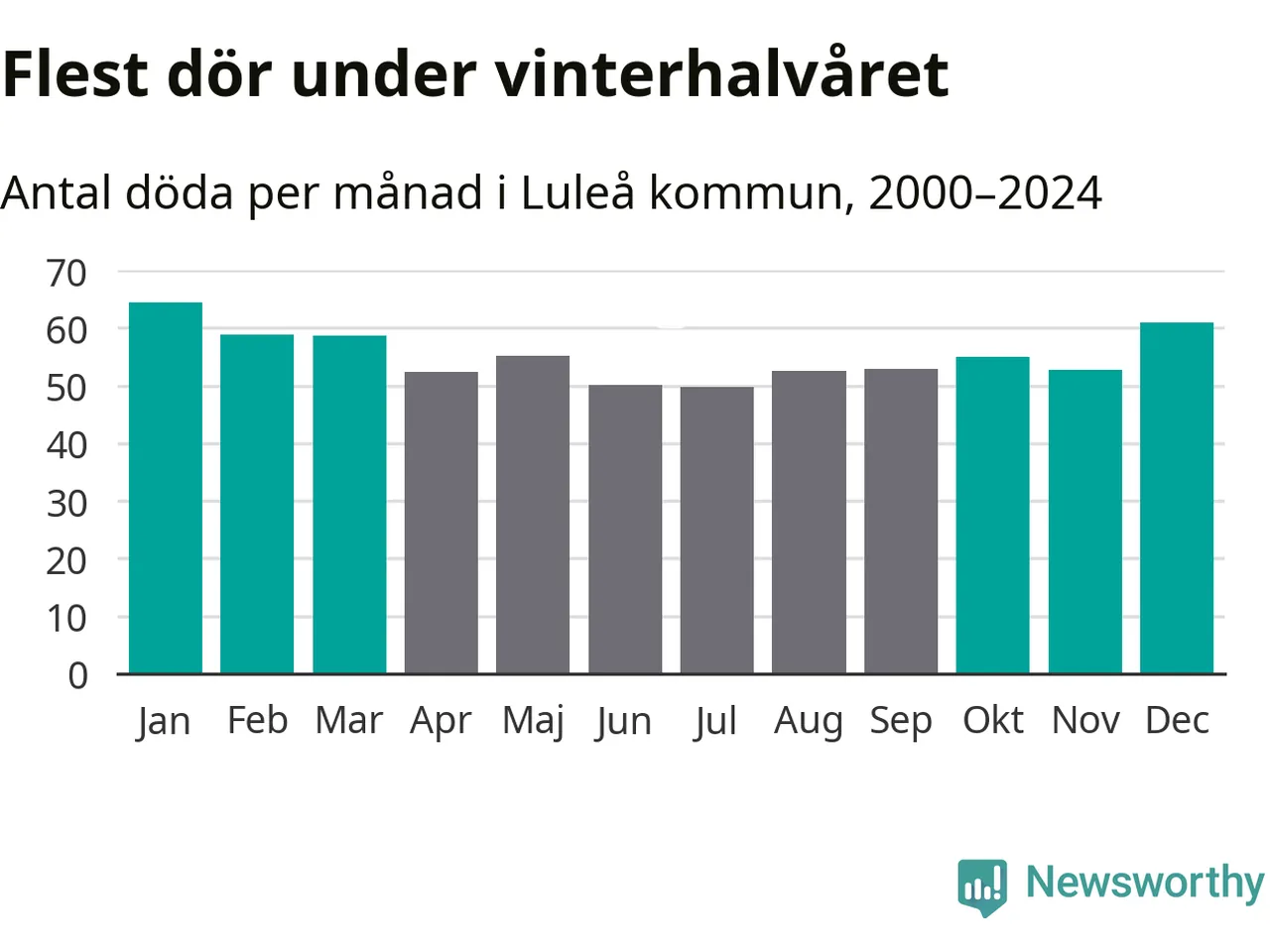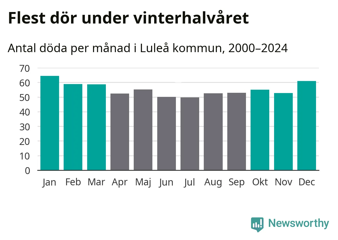 Så är det även i Luleå. Under de senaste 25 åren har 8 571 personer dött i kommunen under vinterhalvåret, jämfört med 7 794 personer under sommarhalvåret – alltså tio procent fler.