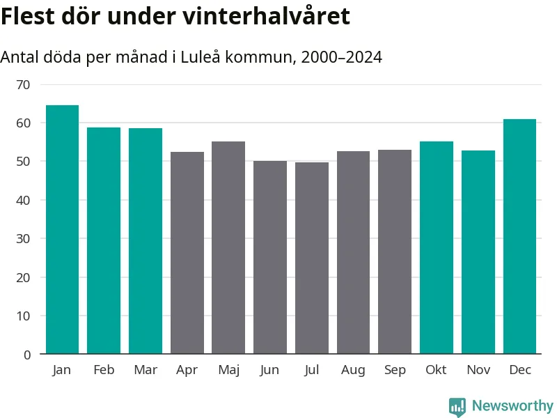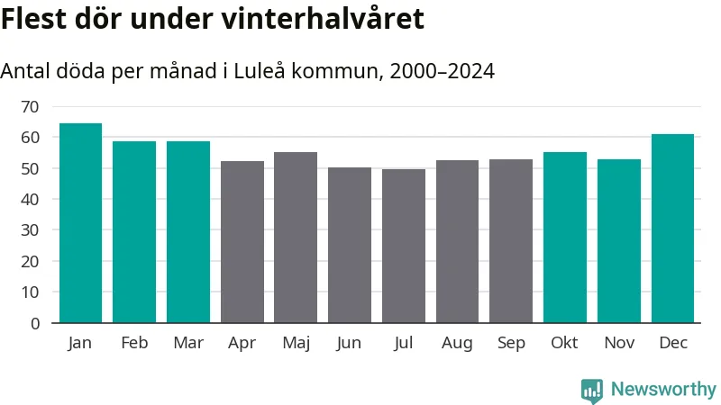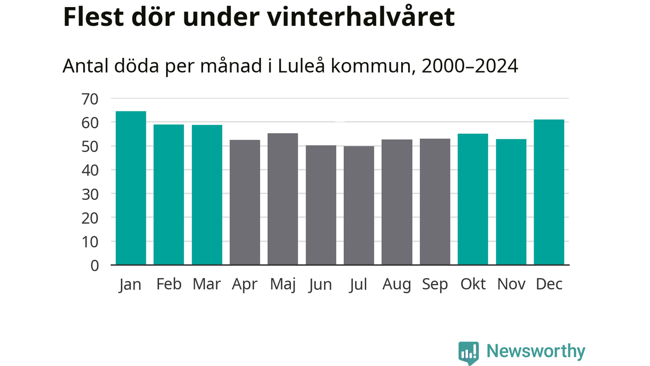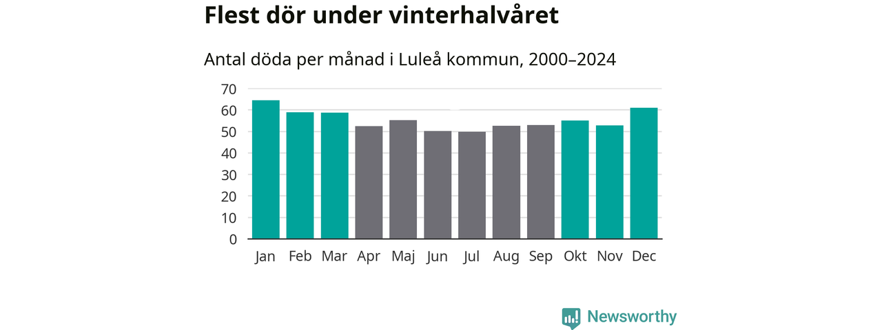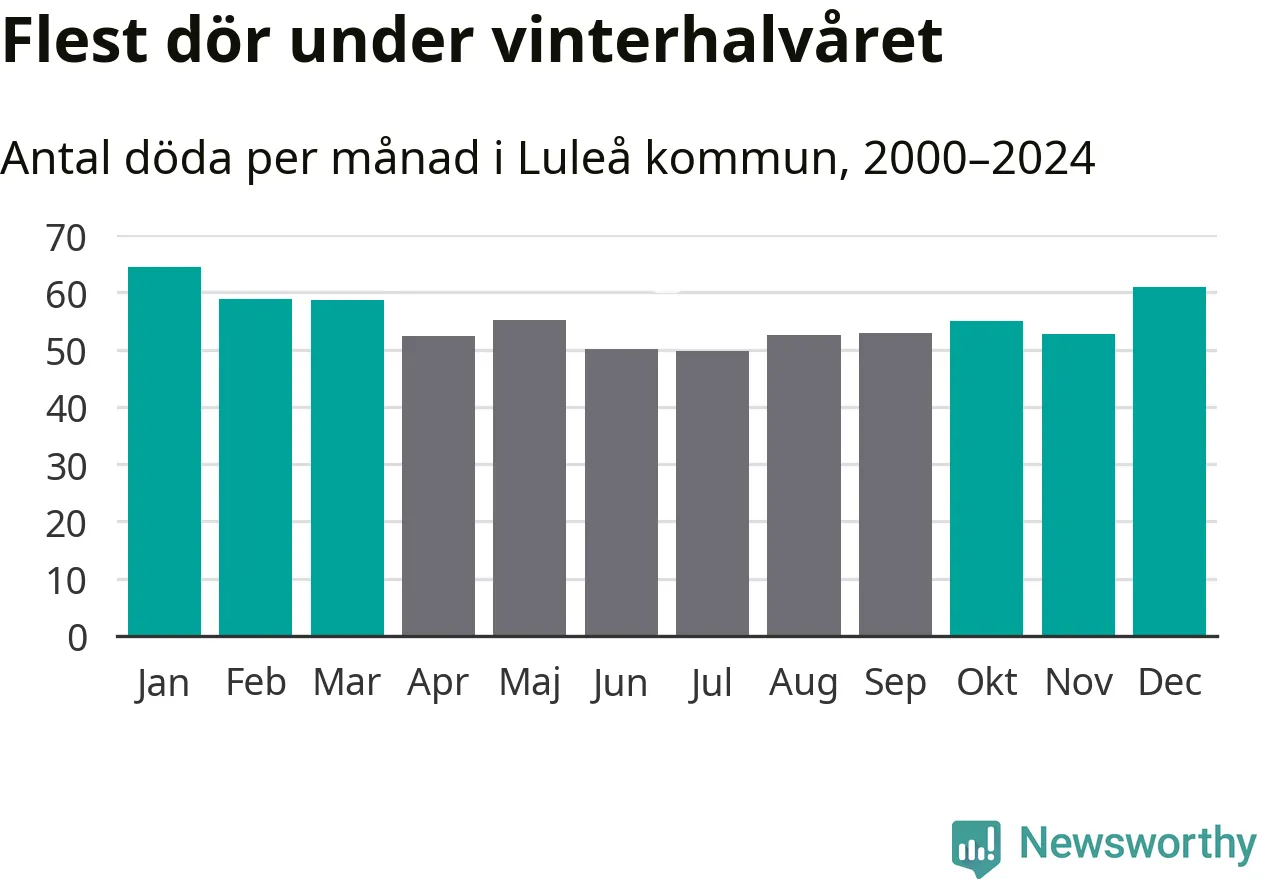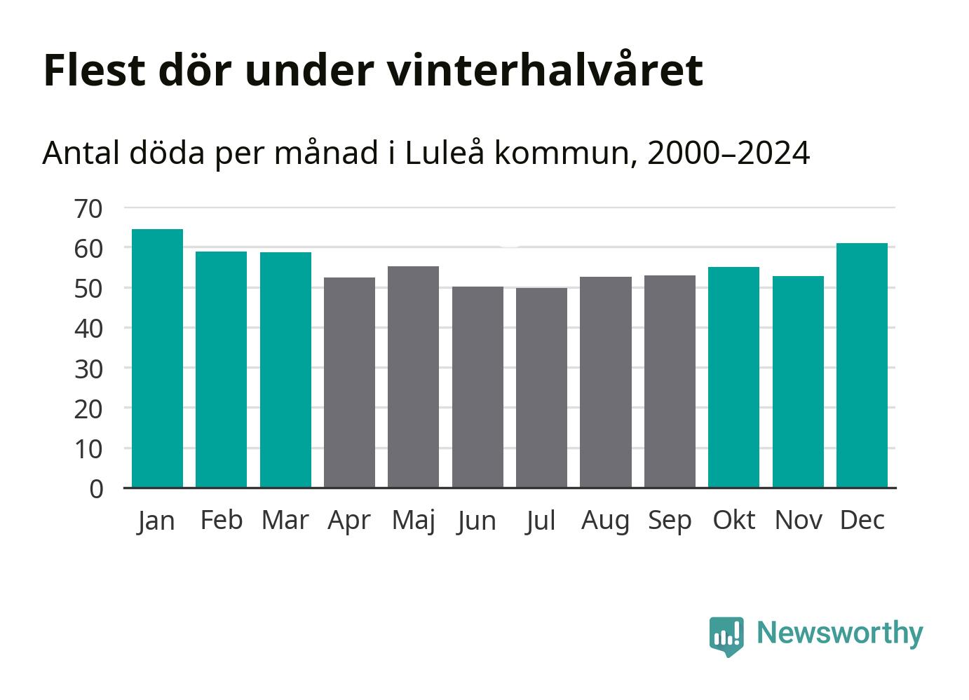 Så är det även i Luleå. Under de senaste 25 åren har 8 571 personer dött i kommunen under vinterhalvåret, jämfört med 7 794 personer under sommarhalvåret – alltså tio procent fler.