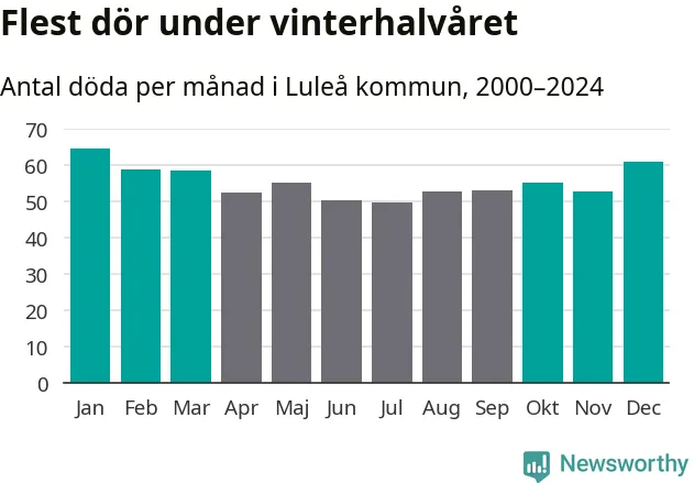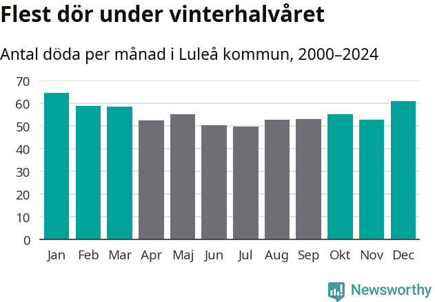 I Norrbottens län dör omkring 54 personer varje vecka. Nio procent fler dör under vintern jämfört med sommaren. Allra flest dör under vecka 52. Totalt 1 640 har gått bort under just den här veckan under de senaste 25 åren – ett genomsnitt på 66 personer varje år.