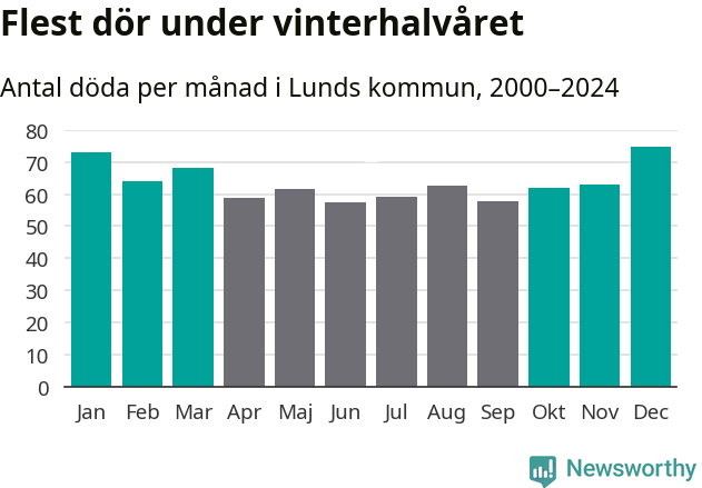 Så är det även i Lund. Under de senaste 25 åren har 9 808 personer dött i kommunen under vinterhalvåret, jämfört med 8 812 personer under sommarhalvåret – alltså elva procent fler.