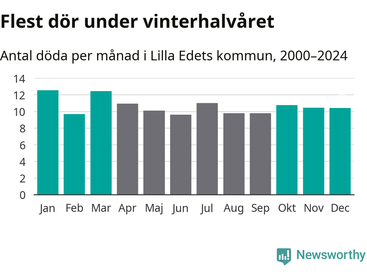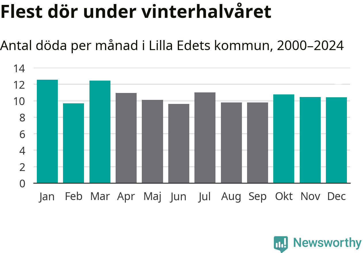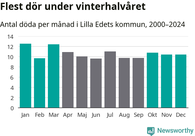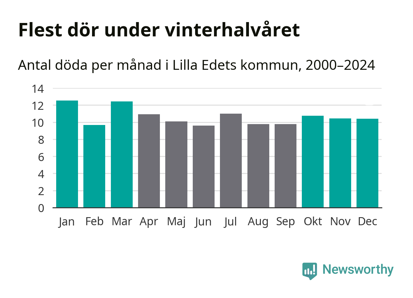 I landet som helhet är det veckorna kring årsskiftet som är de allra dödligaste. I Lilla Edet har flest istället dött vecka 12. Sammanlagt under de senaste 25 åren handlar det om 80 personer, vilket är 33 procent fler än snittet för resten av året.