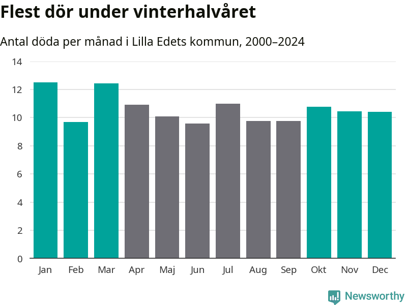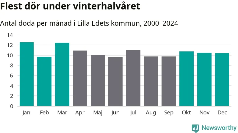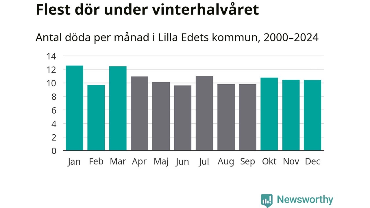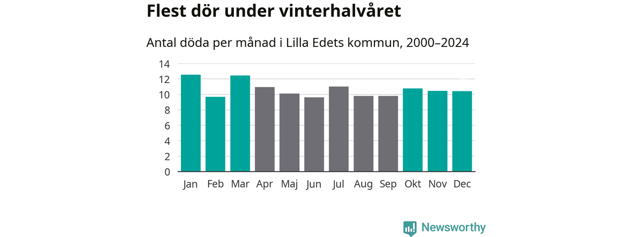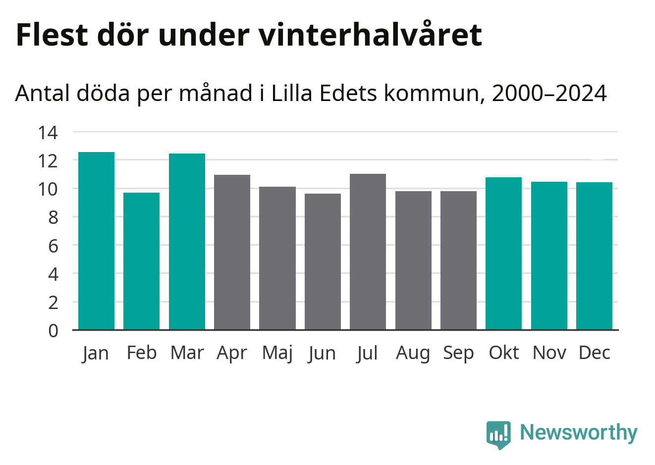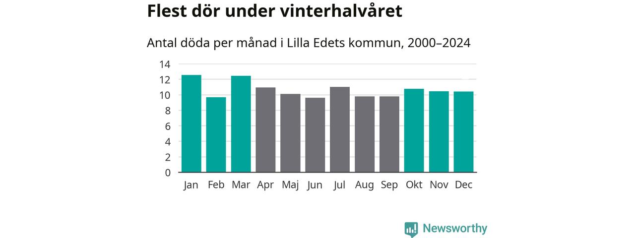 I landet som helhet är det veckorna kring årsskiftet som är de allra dödligaste. I Lilla Edet har flest istället dött vecka 12. Sammanlagt under de senaste 25 åren handlar det om 80 personer, vilket är 33 procent fler än snittet för resten av året.