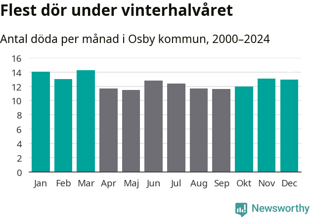Så är det även i Osby. Under de senaste 25 åren har 1 950 personer dött i kommunen under vinterhalvåret, jämfört med 1 761 personer under sommarhalvåret – alltså elva procent fler.