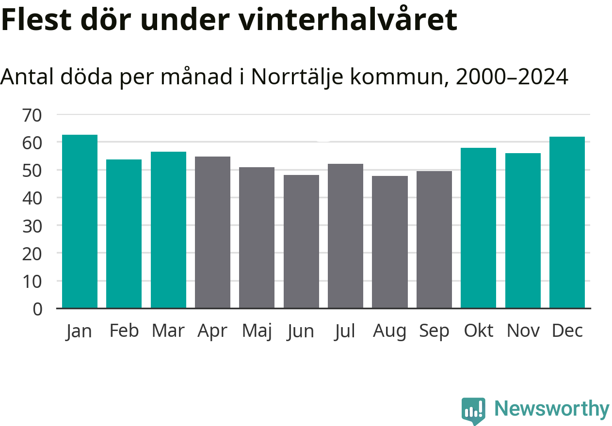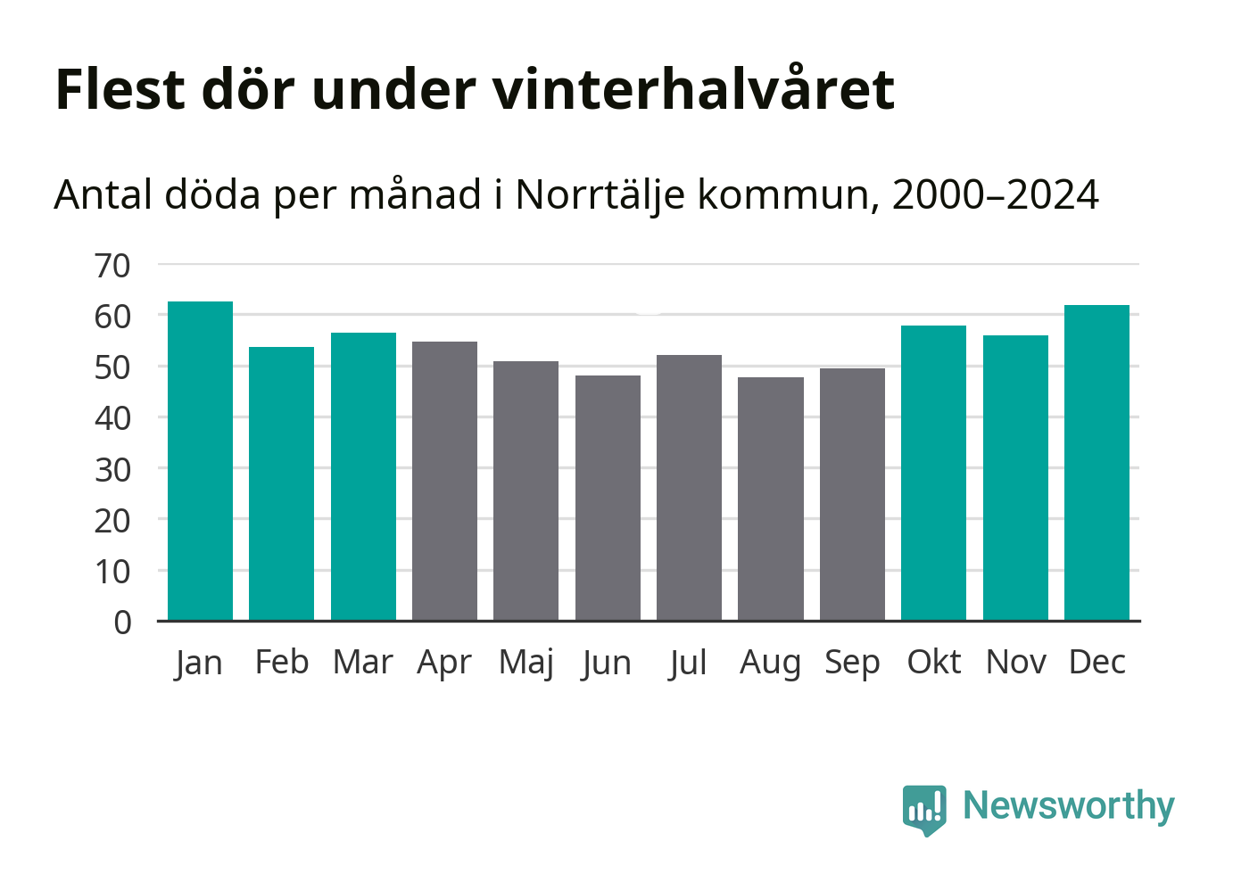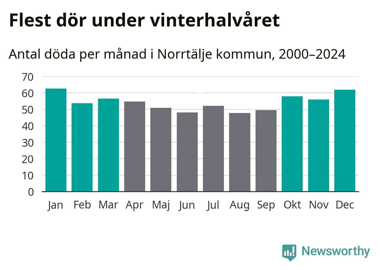 Så är det även i Norrtälje. Under de senaste 25 åren har 8 494 personer dött i kommunen under vinterhalvåret, jämfört med 7 635 personer under sommarhalvåret – alltså elva procent fler.
