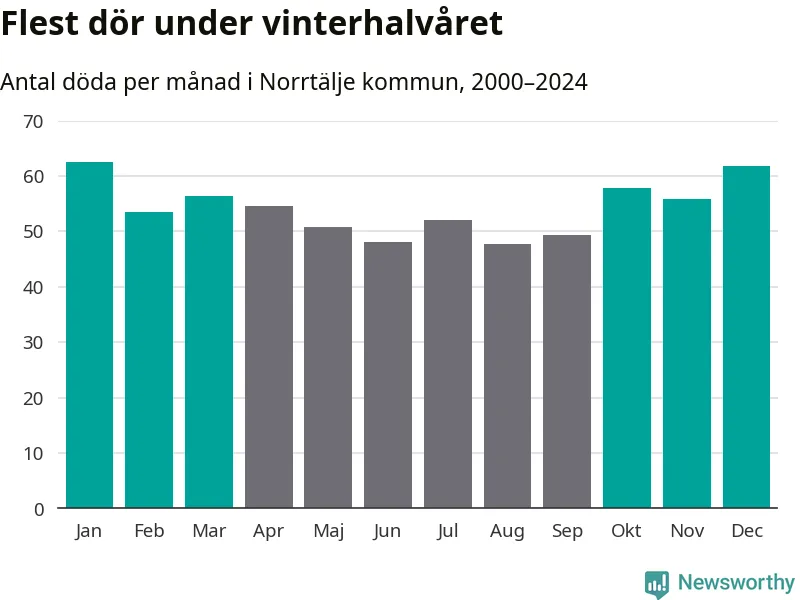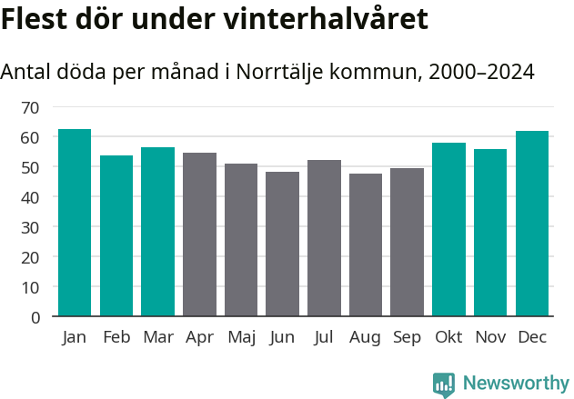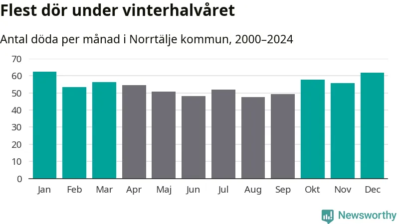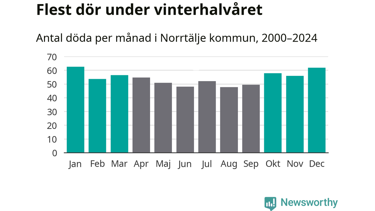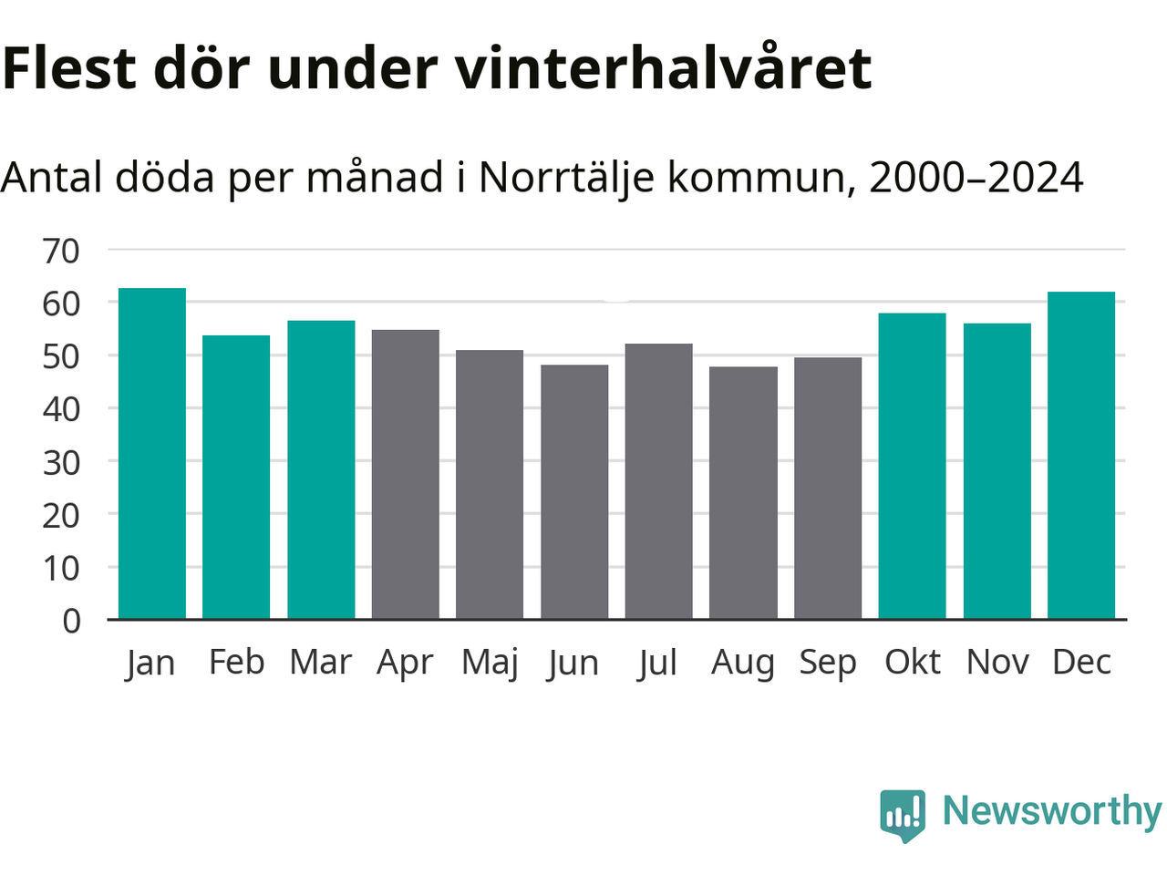 Så är det även i Norrtälje. Under de senaste 25 åren har 8 494 personer dött i kommunen under vinterhalvåret, jämfört med 7 635 personer under sommarhalvåret – alltså elva procent fler.