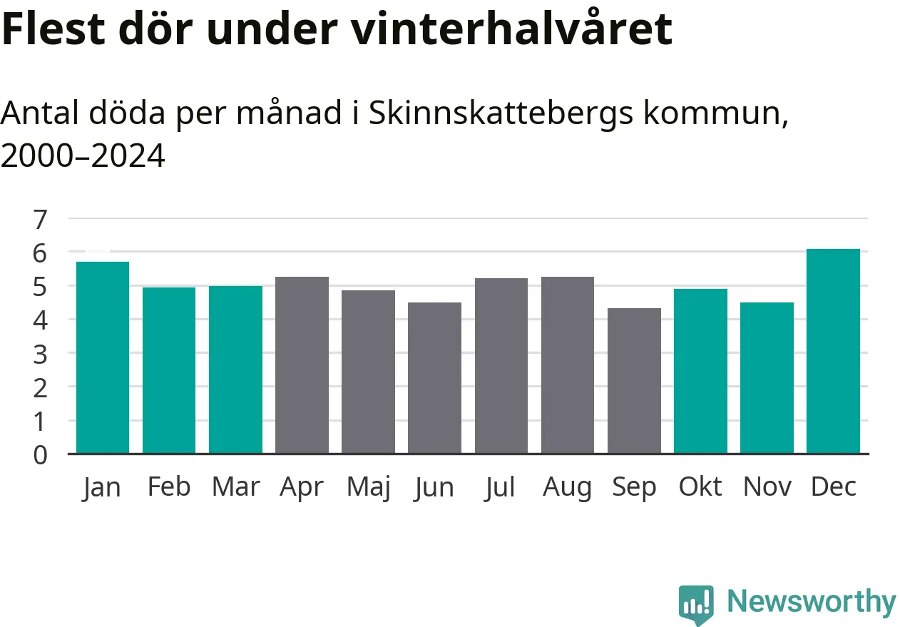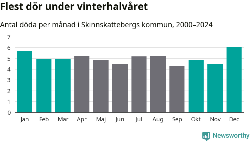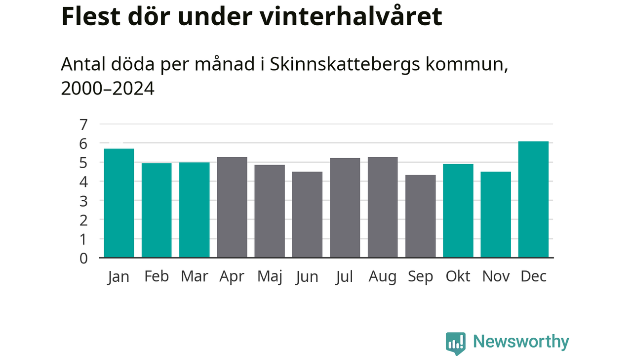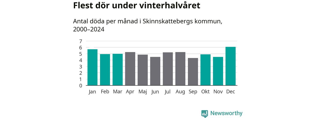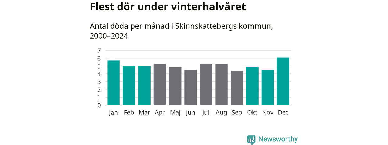 Så är det även i Skinnskatteberg. Under de senaste 25 åren har 767 personer dött i kommunen under vinterhalvåret, jämfört med 719 personer under sommarhalvåret – alltså sju procent fler.