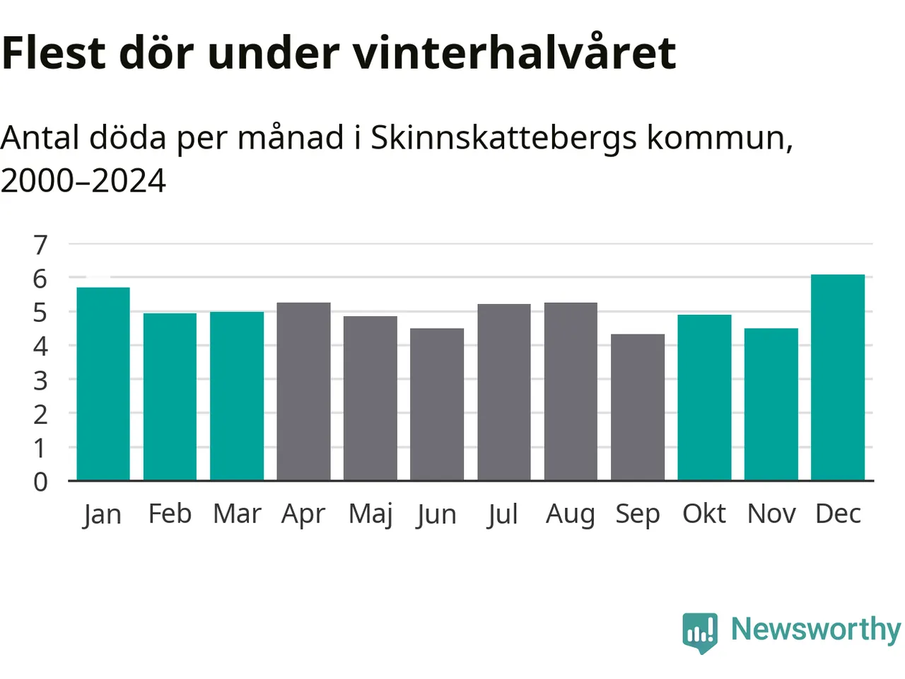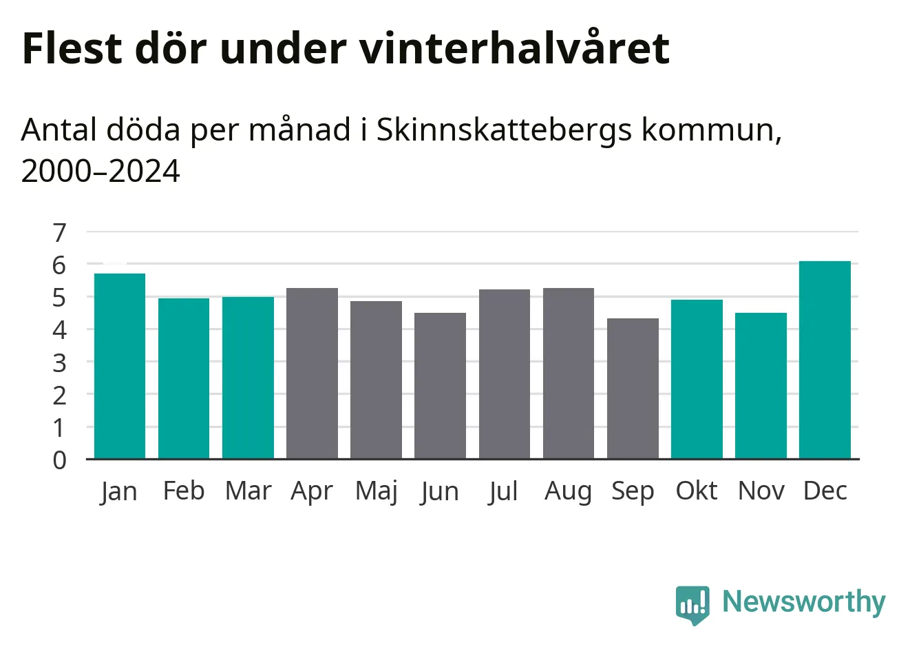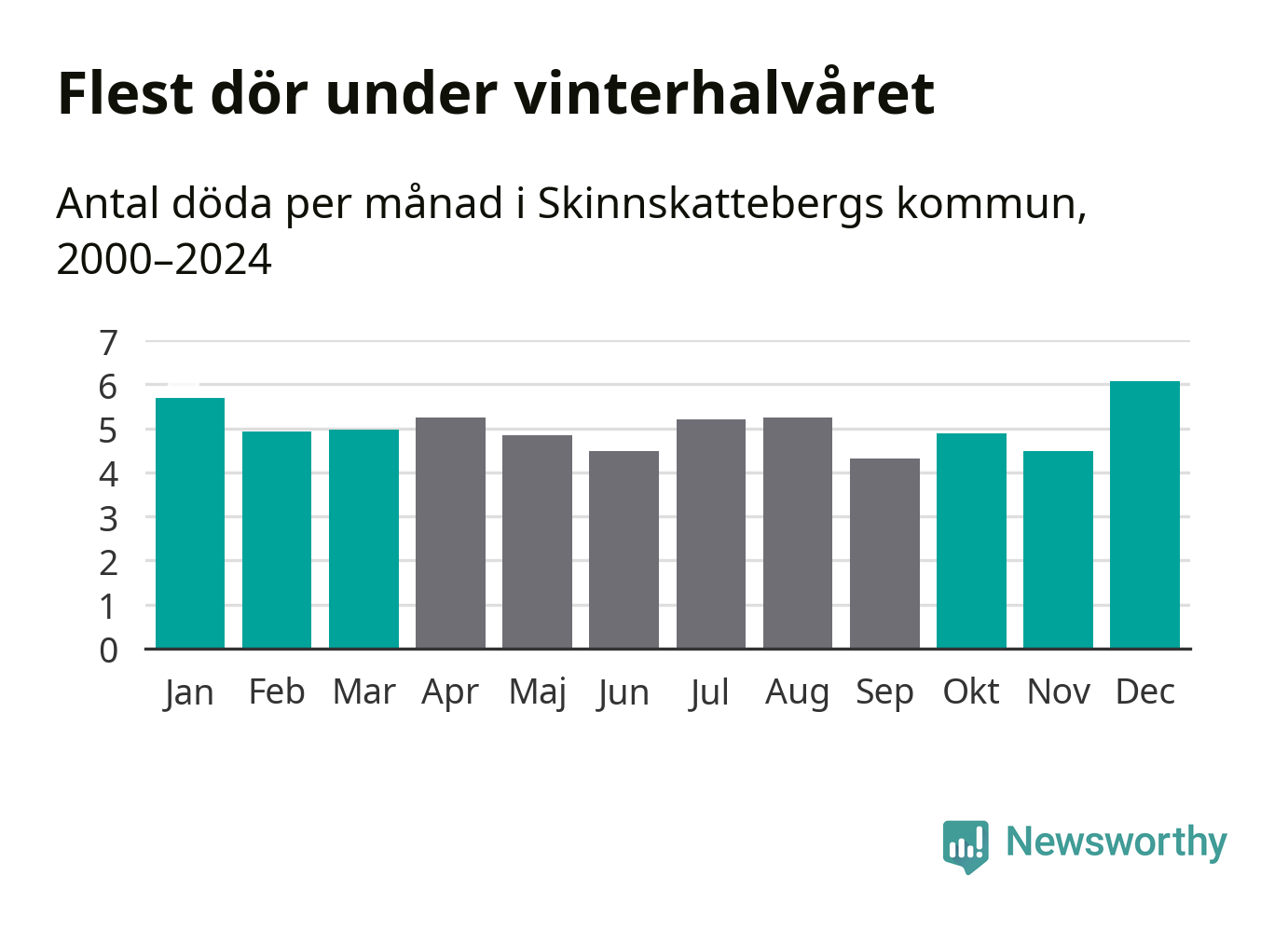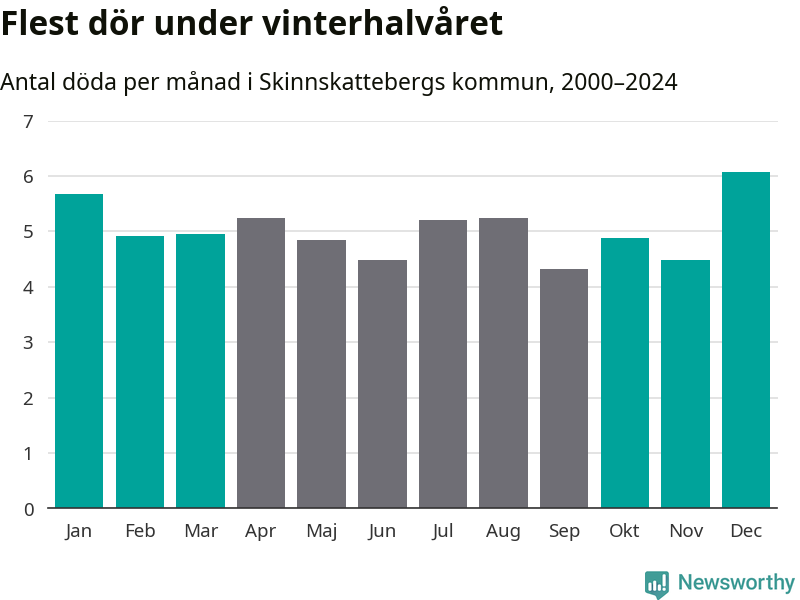 Så är det även i Skinnskatteberg. Under de senaste 25 åren har 767 personer dött i kommunen under vinterhalvåret, jämfört med 719 personer under sommarhalvåret – alltså sju procent fler.