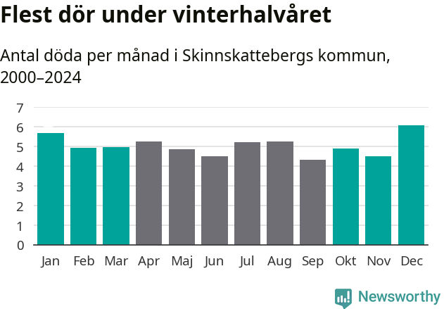 I landet som helhet är det veckorna kring årsskiftet som är de allra dödligaste. I Skinnskatteberg har flest istället dött vecka 4. Sammanlagt under de senaste 25 åren handlar det om 40 personer, vilket är 40 procent fler än snittet för resten av året.