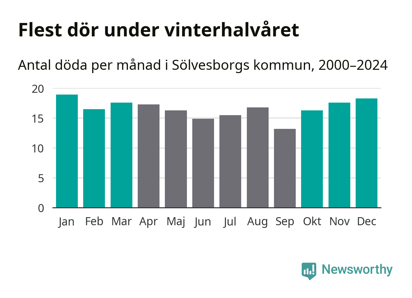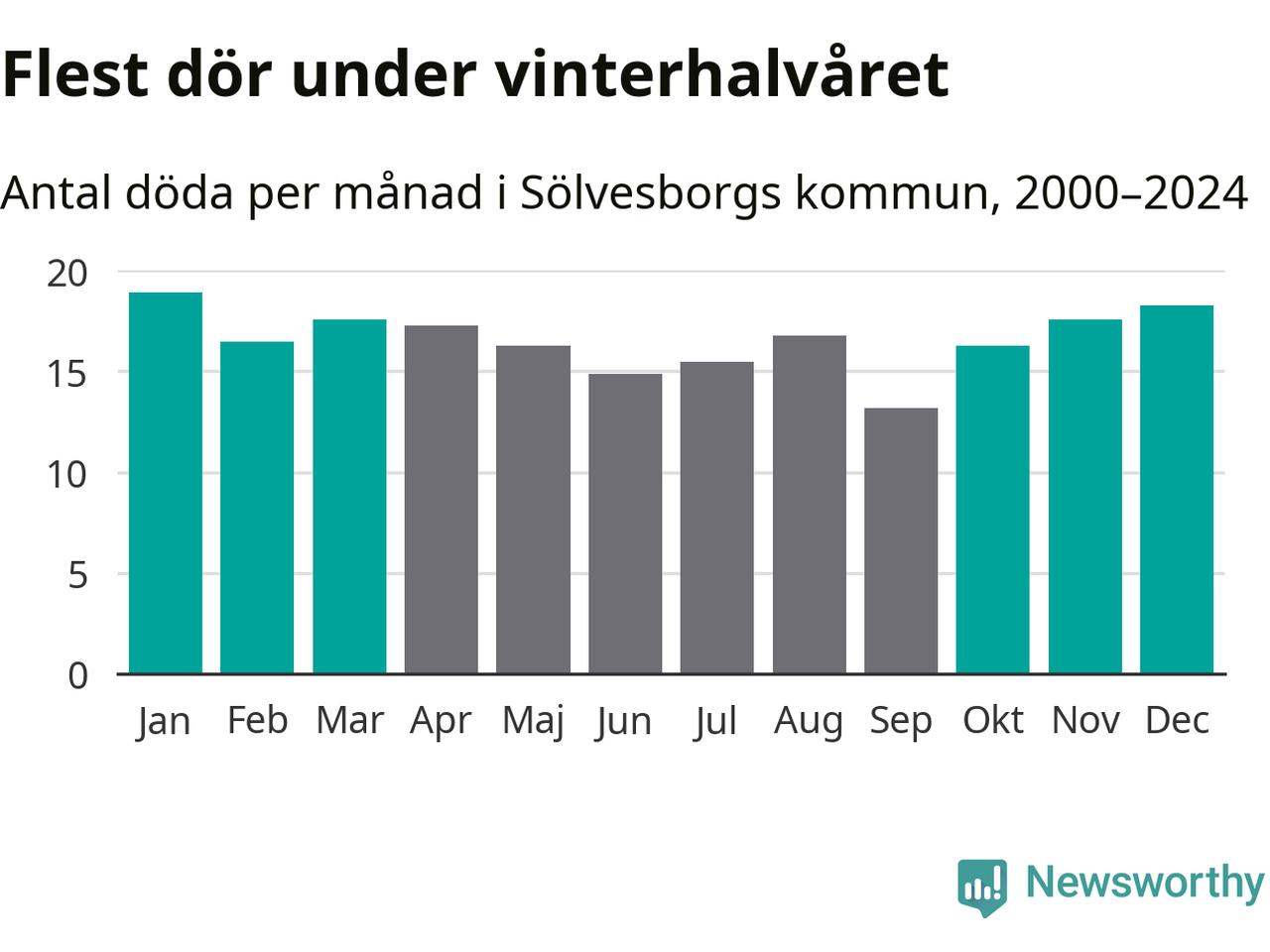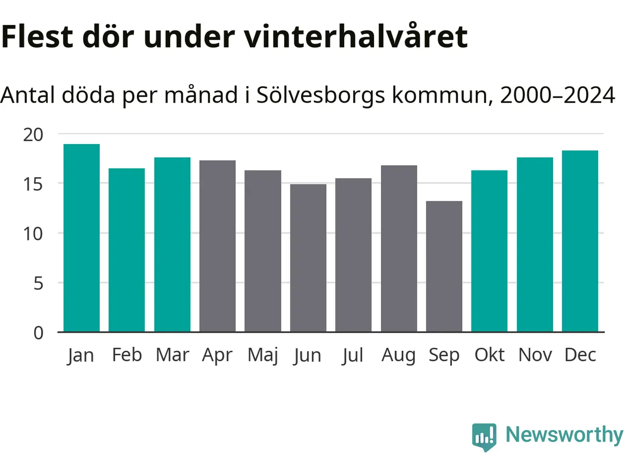 Så är det även i Sölvesborg. Under de senaste 25 åren har 2 606 personer dött i kommunen under vinterhalvåret, jämfört med 2 298 personer under sommarhalvåret – alltså 13 procent fler.