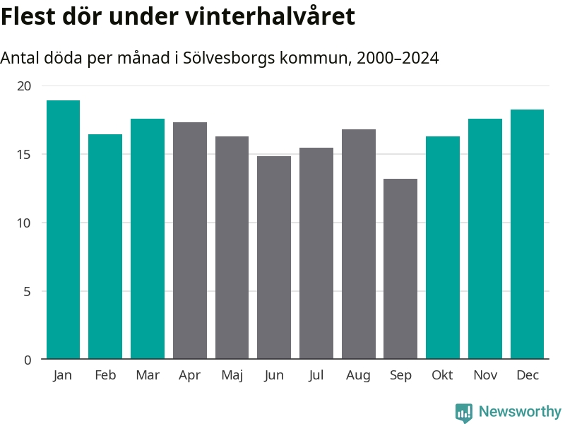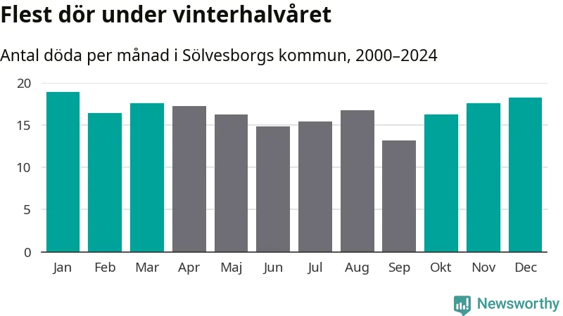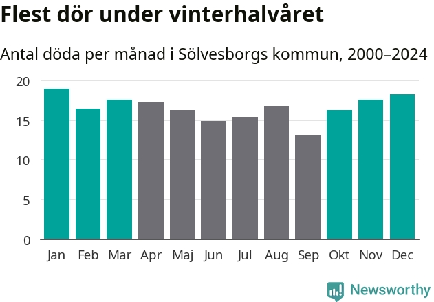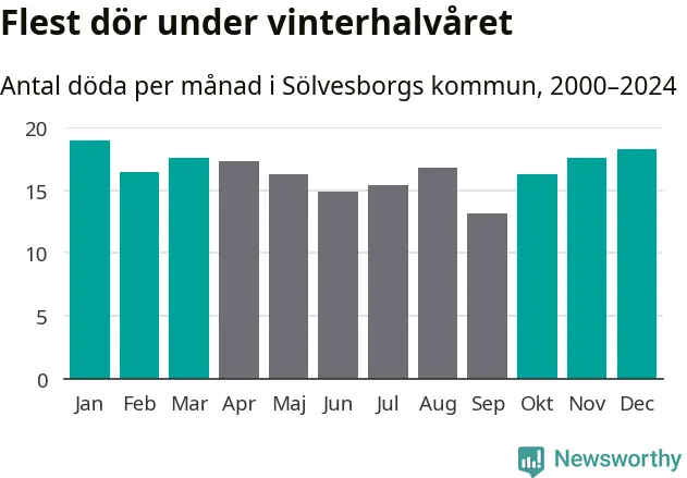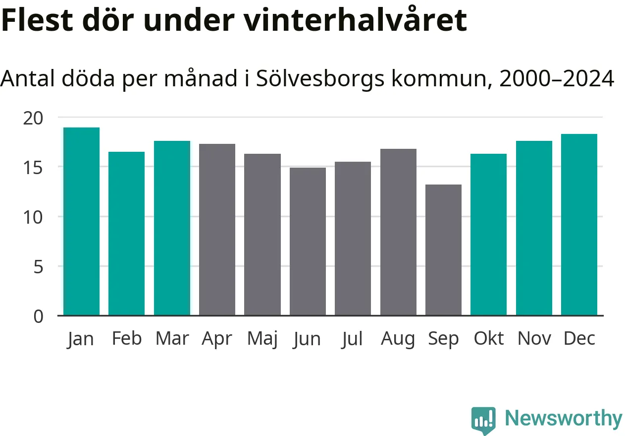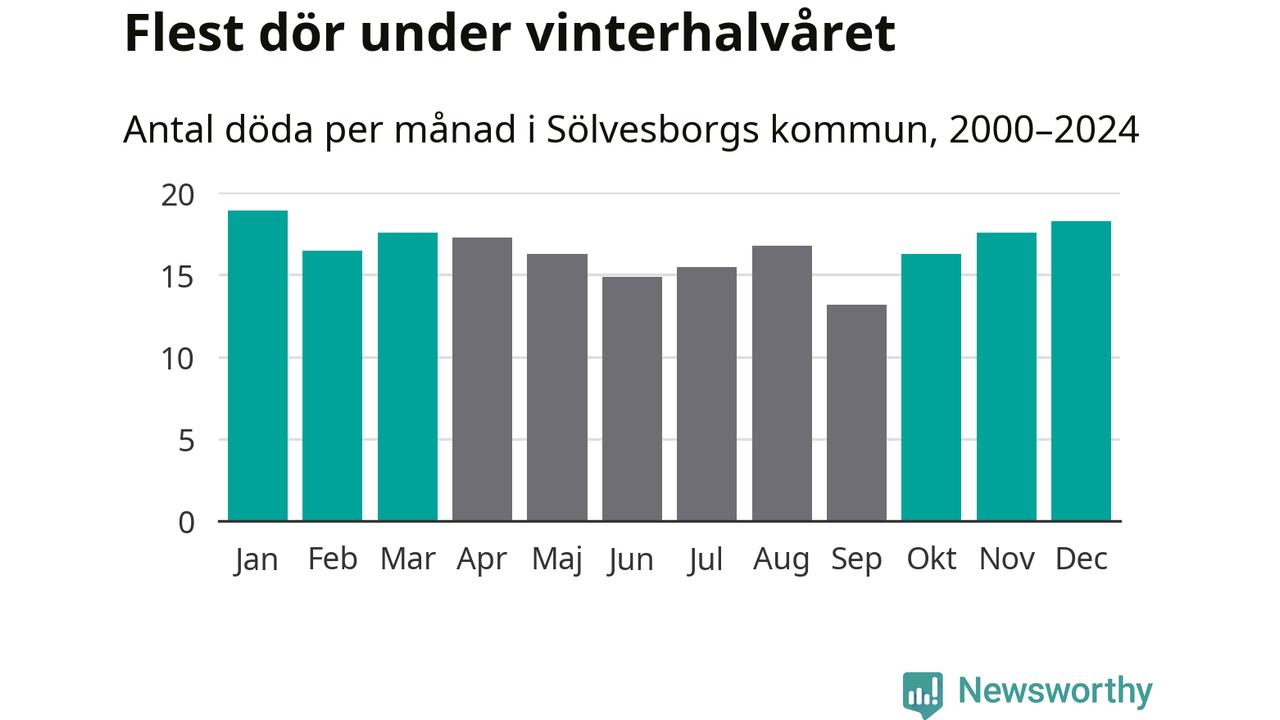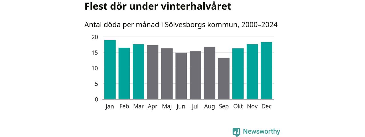 Så är det även i Sölvesborg. Under de senaste 25 åren har 2 606 personer dött i kommunen under vinterhalvåret, jämfört med 2 298 personer under sommarhalvåret – alltså 13 procent fler.