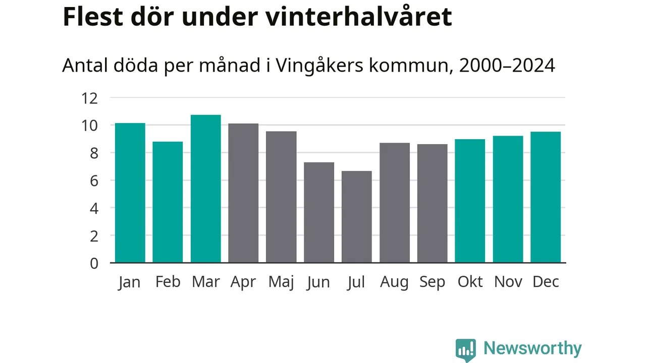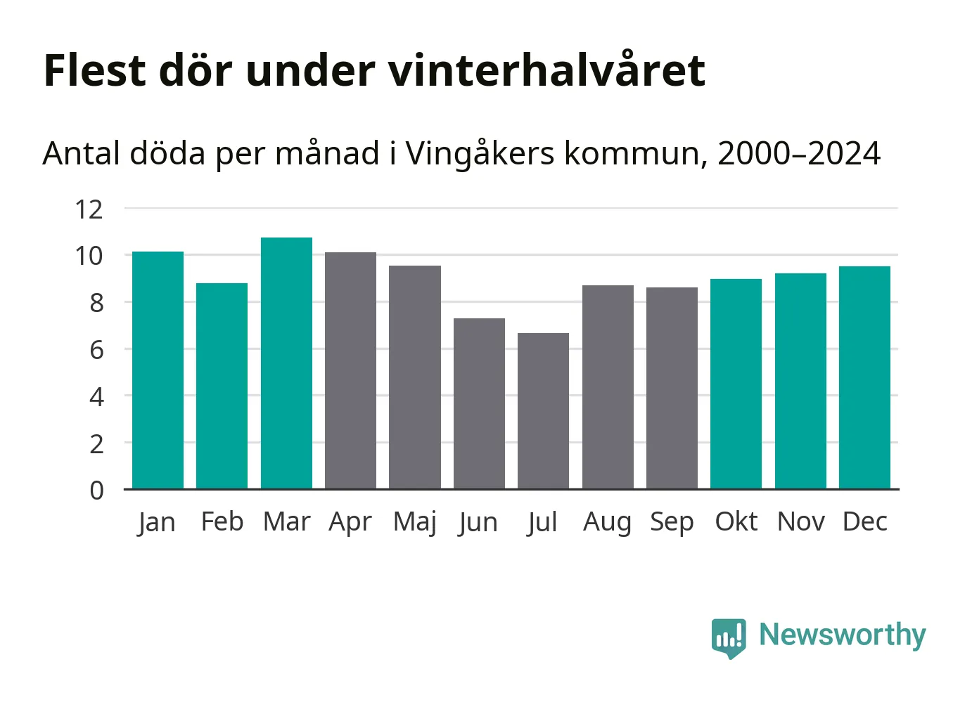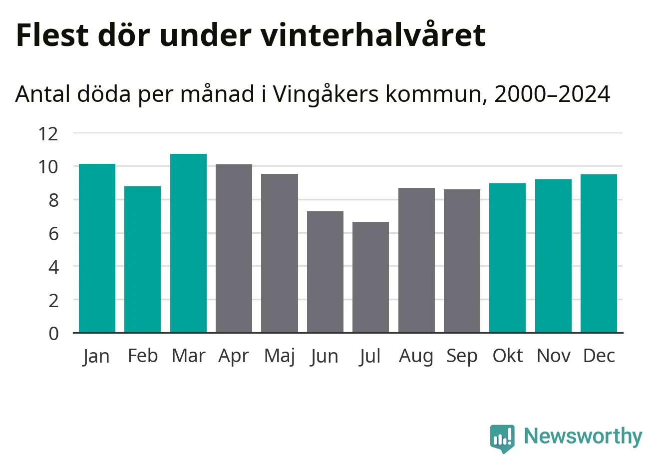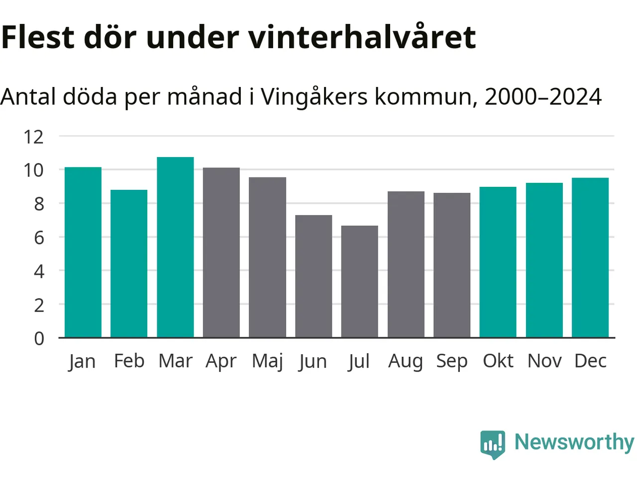 Så är det även i Vingåker. Under de senaste 25 åren har 1 455 personer dött i kommunen under vinterhalvåret, jämfört med 1 222 personer under sommarhalvåret – alltså 19 procent fler.