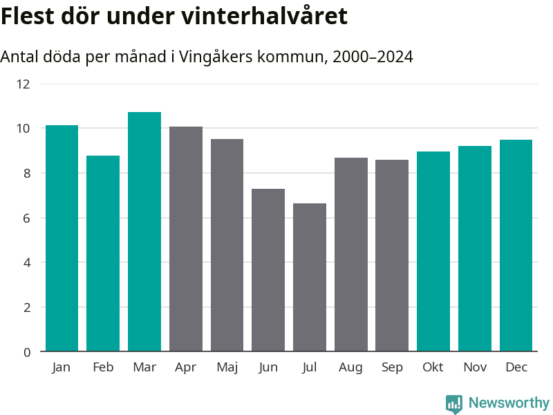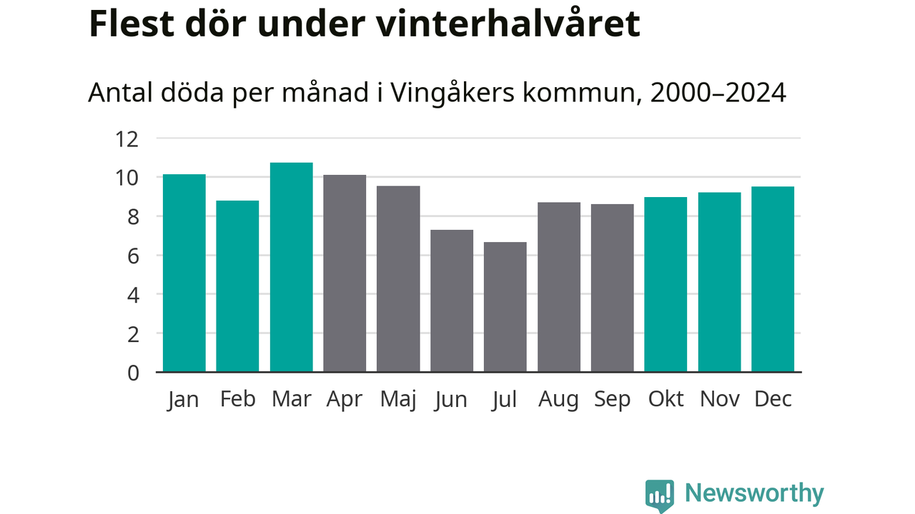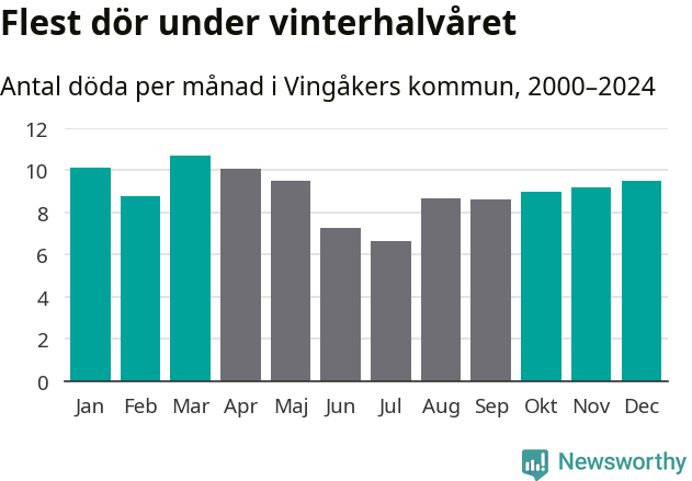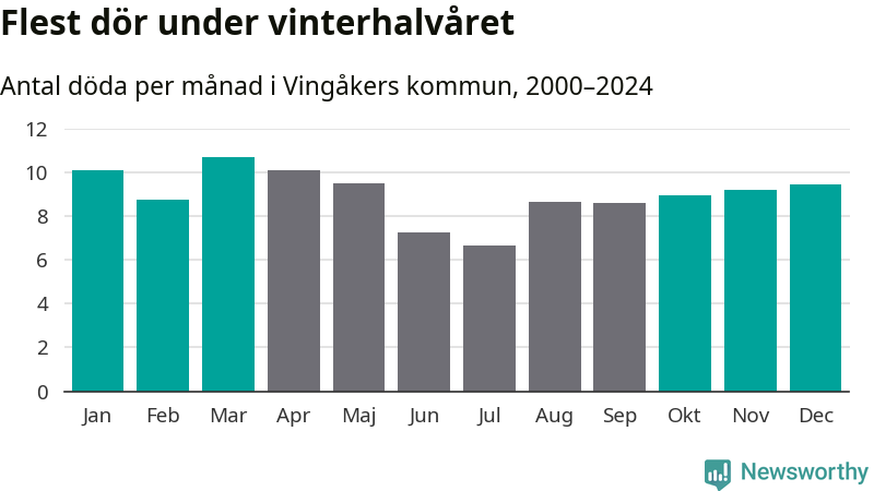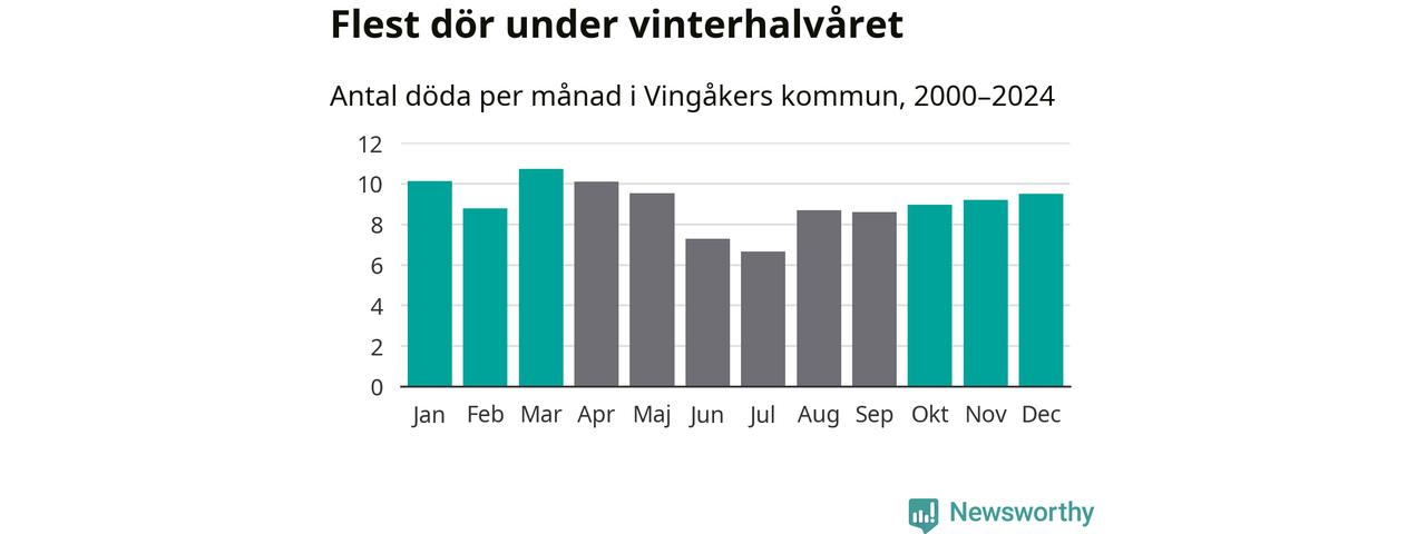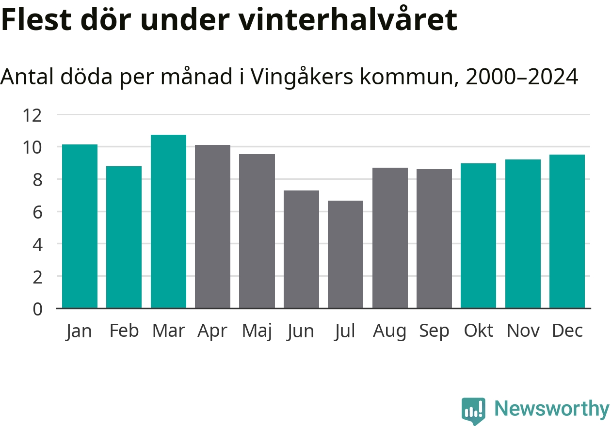 Så är det även i Vingåker. Under de senaste 25 åren har 1 455 personer dött i kommunen under vinterhalvåret, jämfört med 1 222 personer under sommarhalvåret – alltså 19 procent fler.