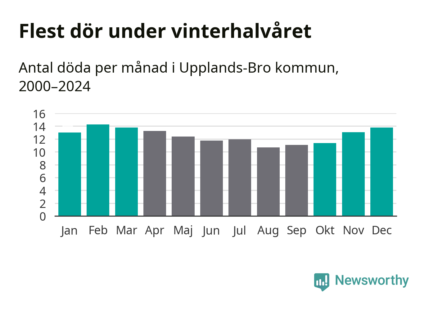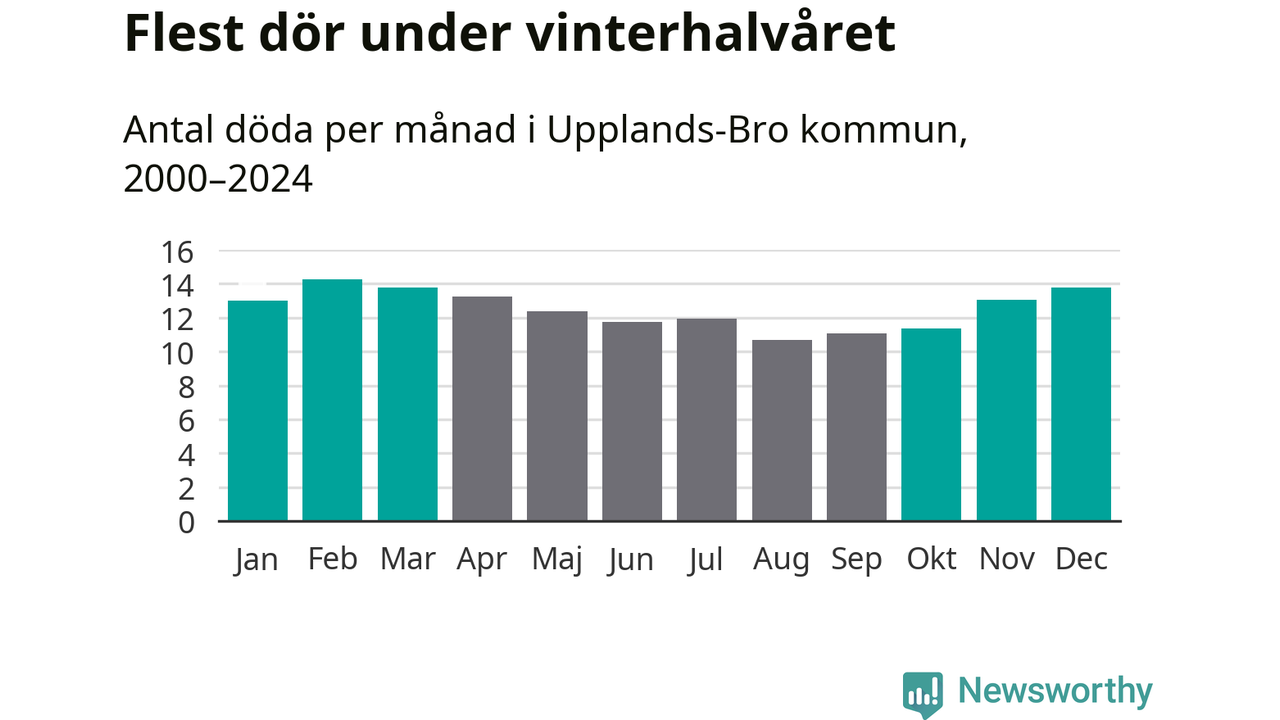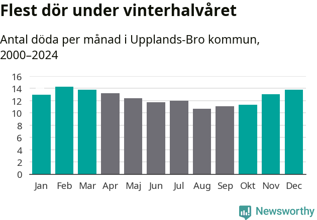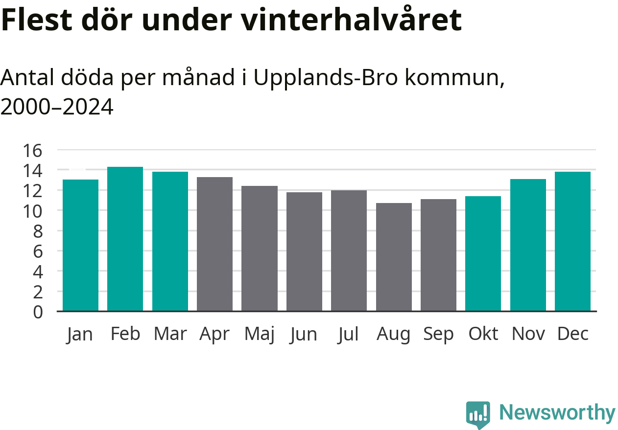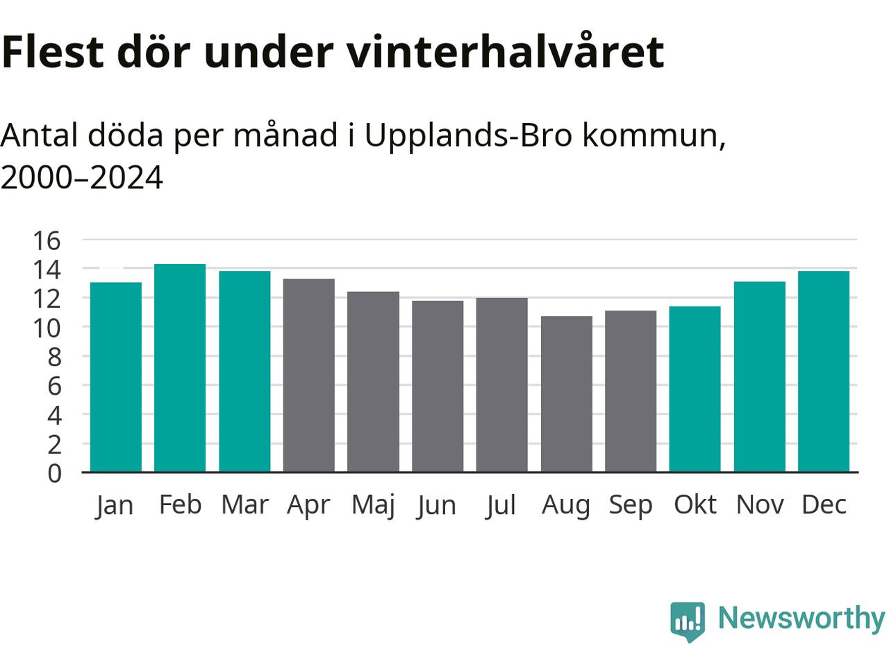 Så är det även i Upplands-Bro. Under de senaste 25 åren har 1 995 personer dött i kommunen under vinterhalvåret, jämfört med 1 719 personer under sommarhalvåret – alltså 16 procent fler.