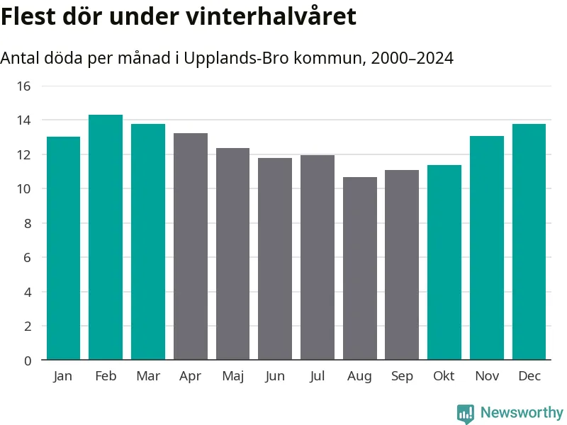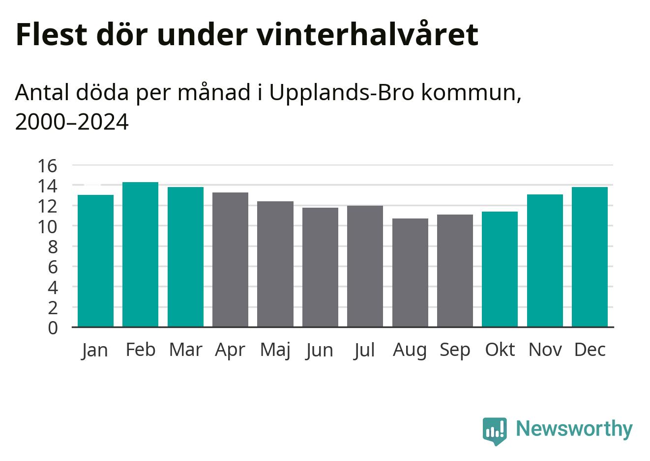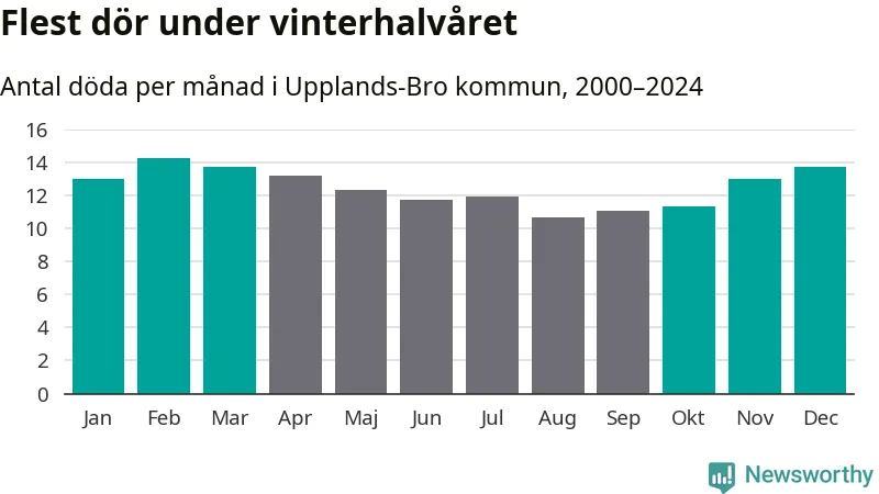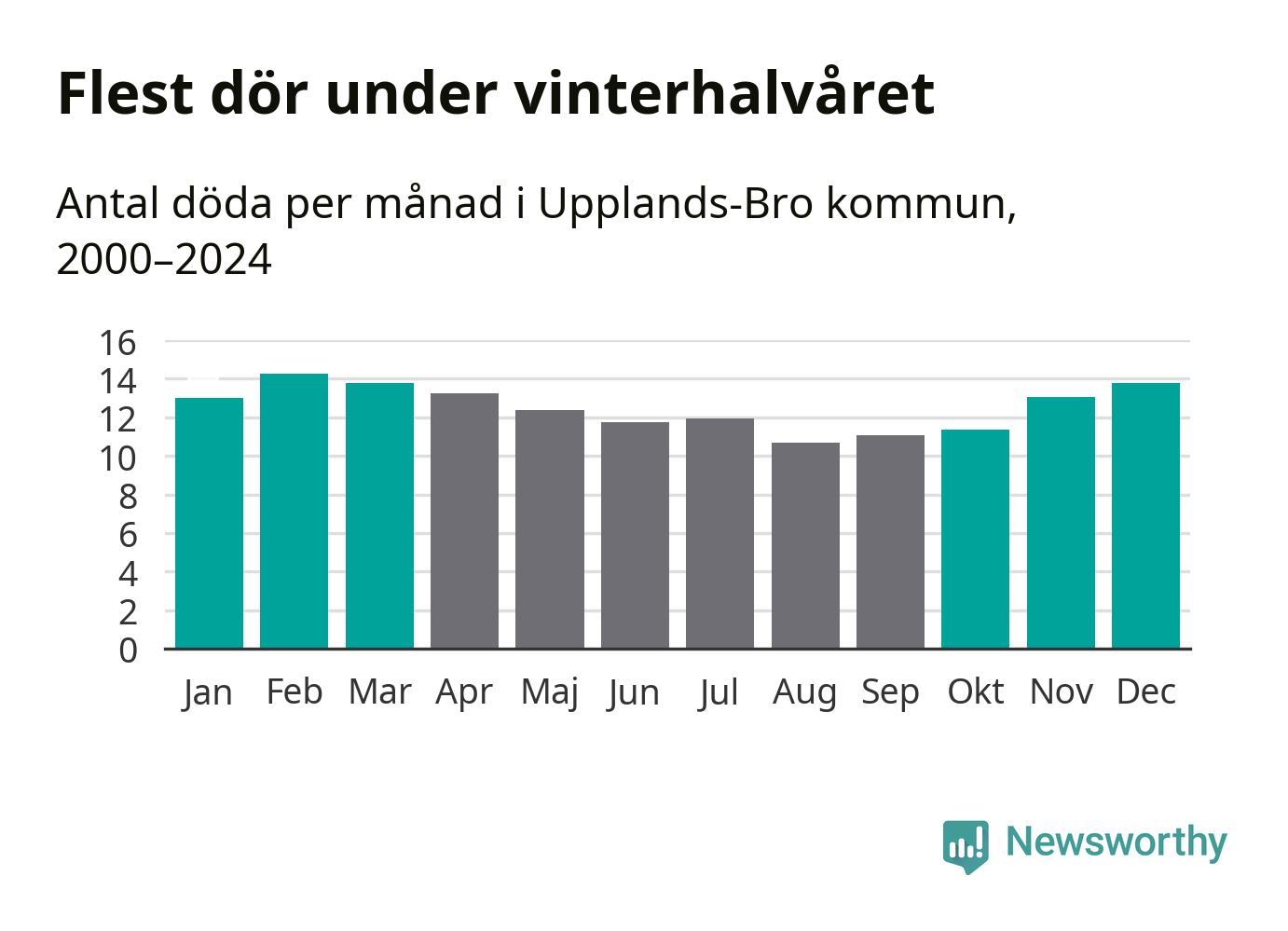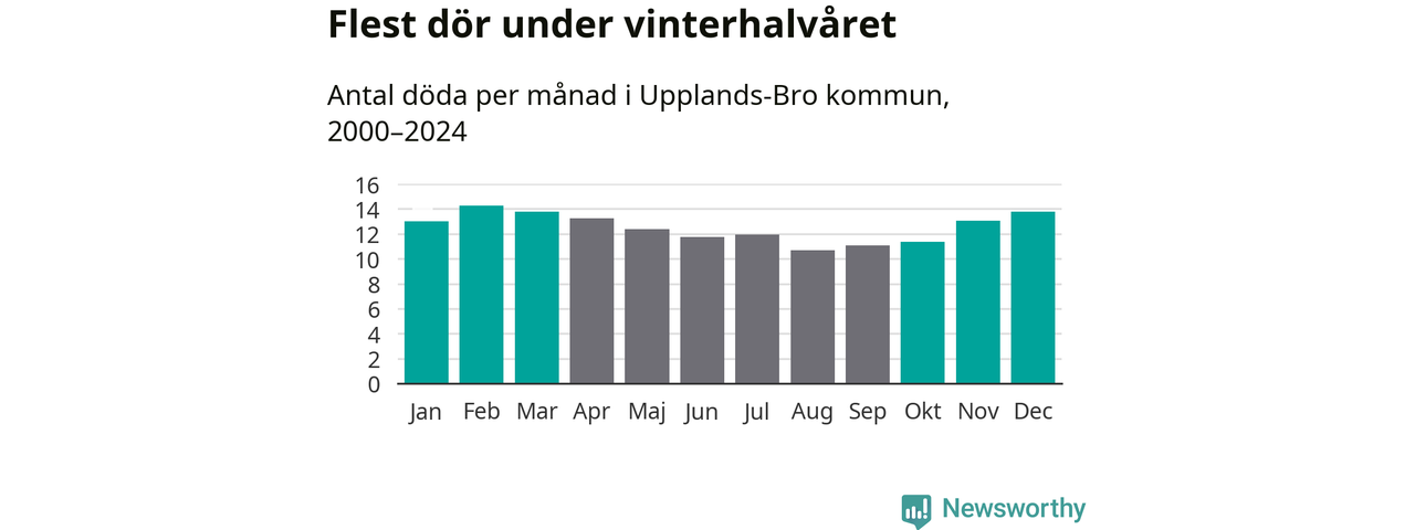 Så är det även i Upplands-Bro. Under de senaste 25 åren har 1 995 personer dött i kommunen under vinterhalvåret, jämfört med 1 719 personer under sommarhalvåret – alltså 16 procent fler.