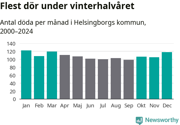 Så är det även i Helsingborg. Under de senaste 25 åren har 16 653 personer dött i kommunen under vinterhalvåret, jämfört med 14 996 personer under sommarhalvåret – alltså elva procent fler.