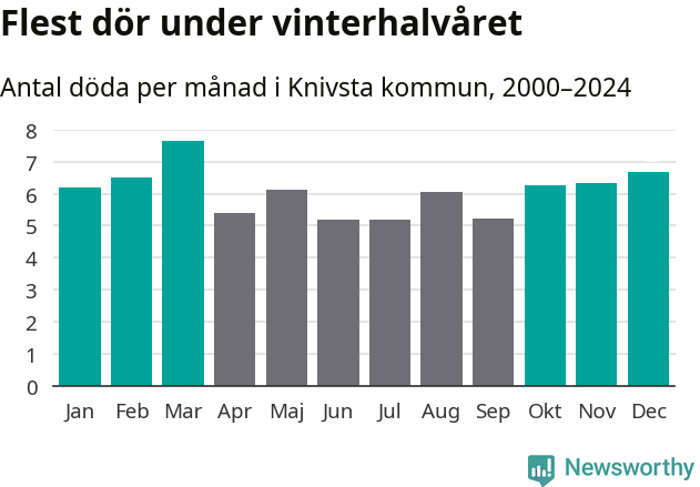 Så är det även i Knivsta. Under de senaste 25 åren har 955 personer dött i kommunen under vinterhalvåret, jämfört med 831 personer under sommarhalvåret – alltså 15 procent fler.