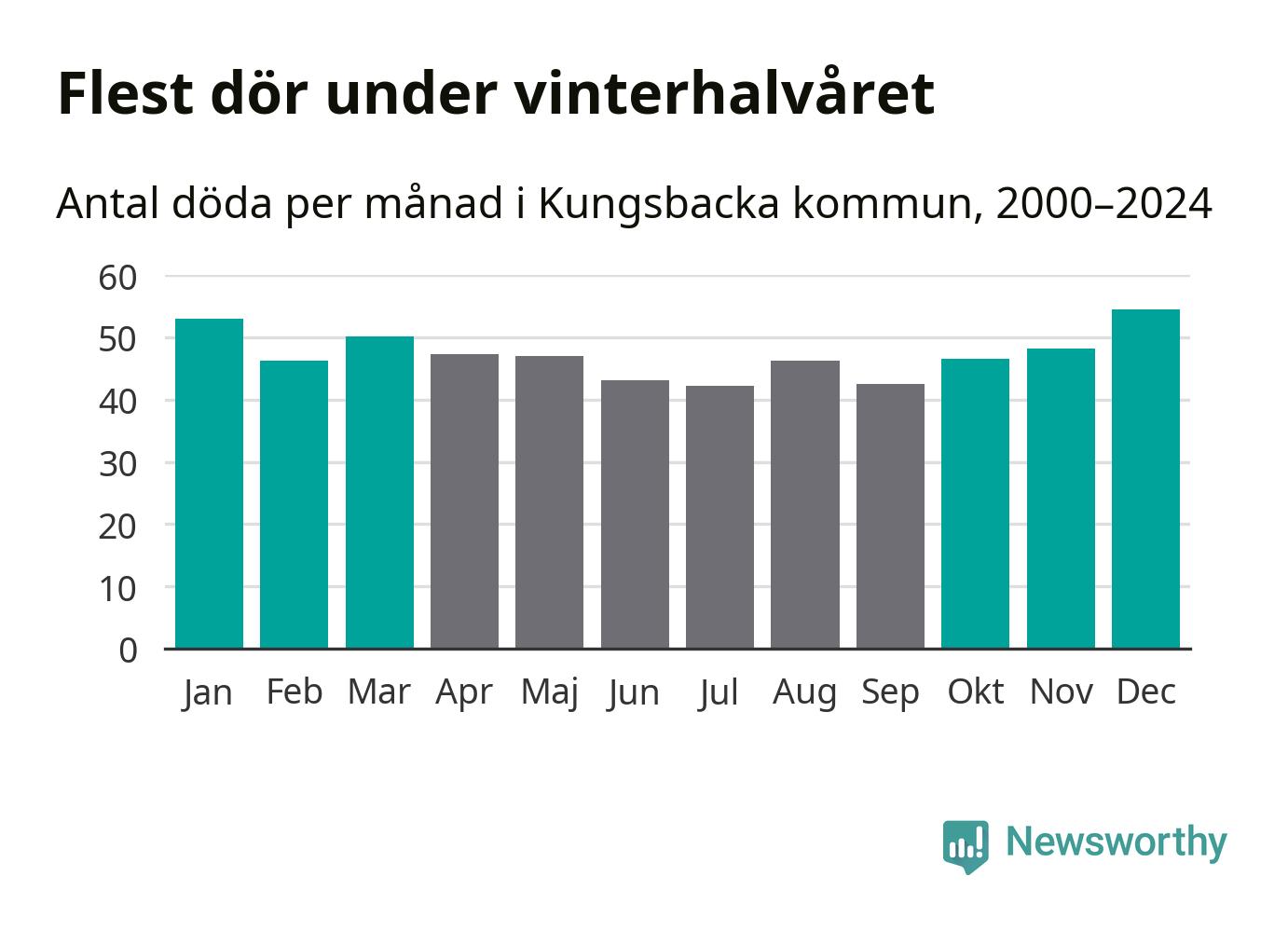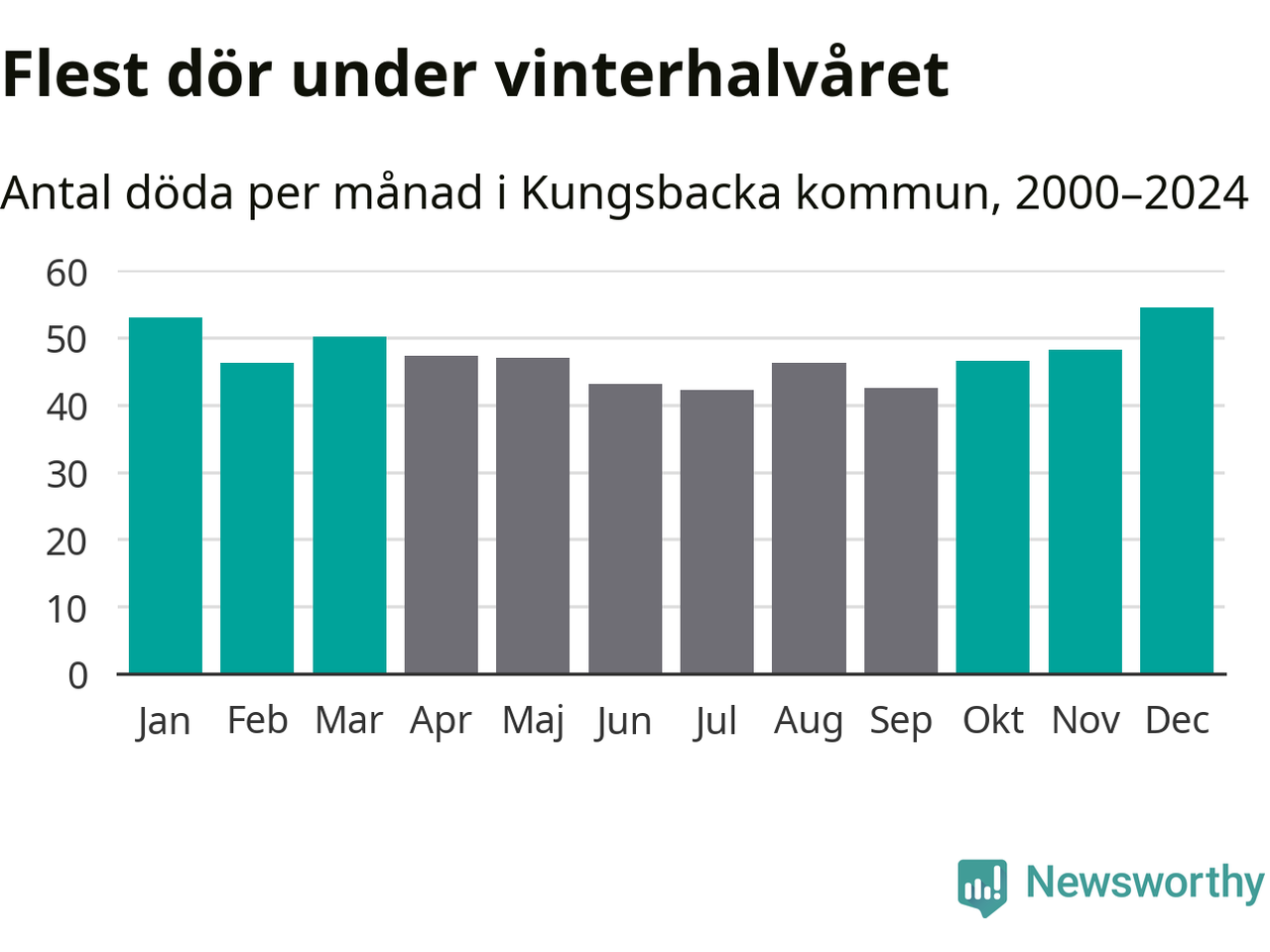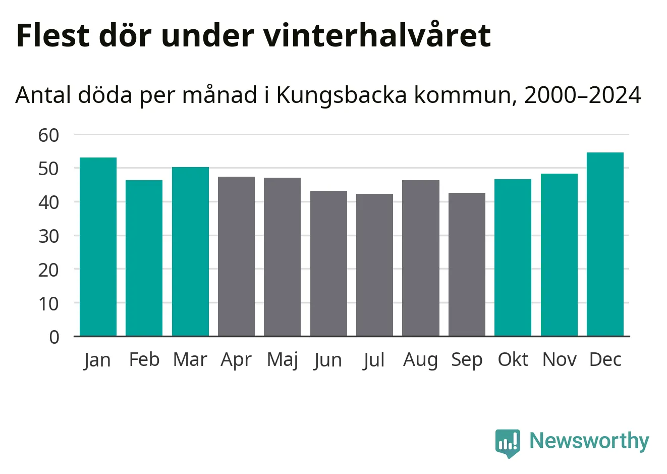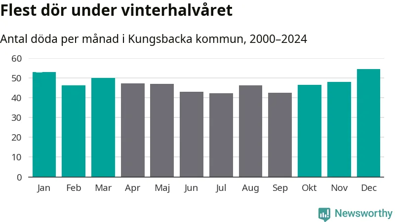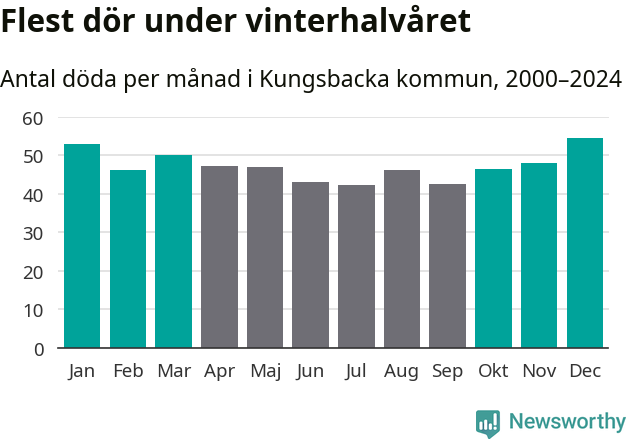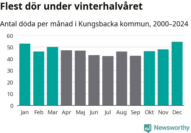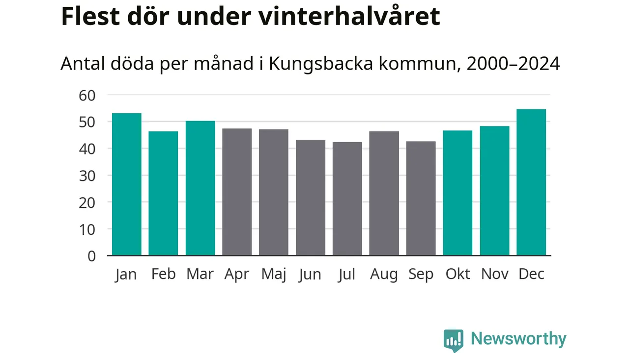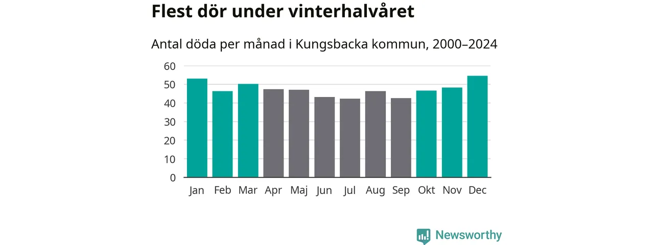Så är det även i Kungsbacka. Under de senaste 25 åren har 7 355 personer dött i kommunen under vinterhalvåret, jämfört med 6 596 personer under sommarhalvåret – alltså tolv procent fler.