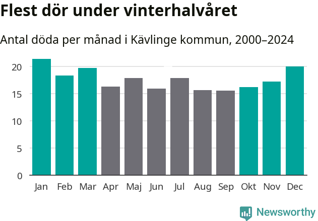 Så är det även i Kävlinge. Under de senaste 25 åren har 2 772 personer dött i kommunen under vinterhalvåret, jämfört med 2 421 personer under sommarhalvåret – alltså 14 procent fler.