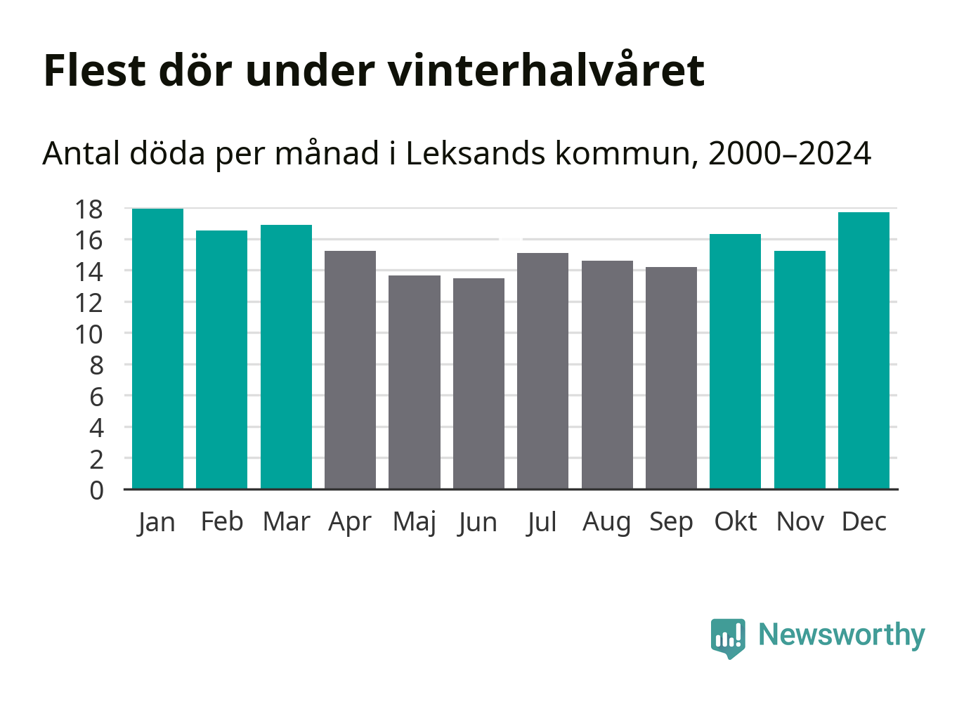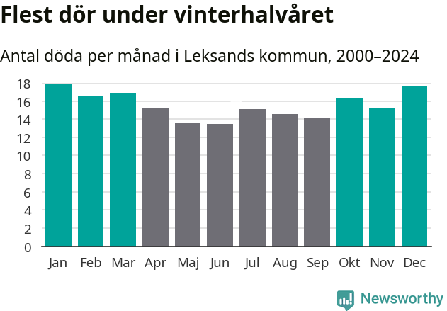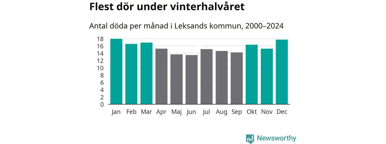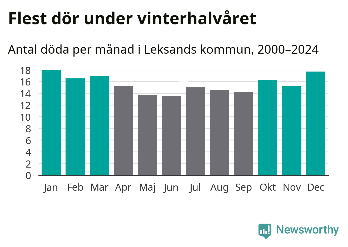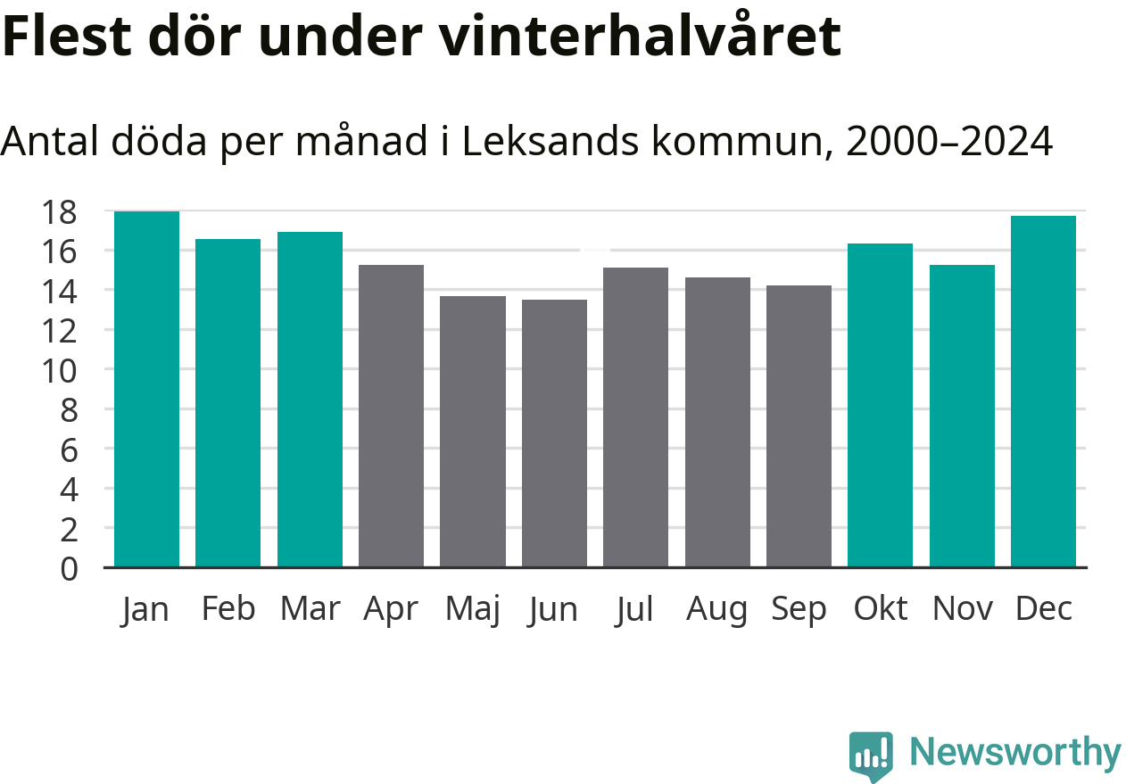 Så är det även i Leksand. Under de senaste 25 åren har 2 450 personer dött i kommunen under vinterhalvåret, jämfört med 2 163 personer under sommarhalvåret – alltså 13 procent fler.