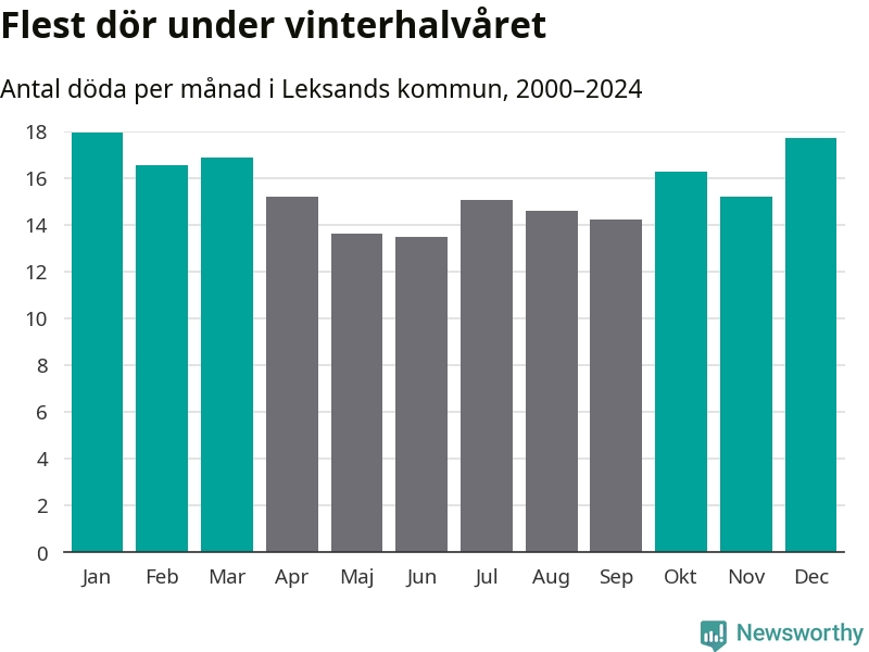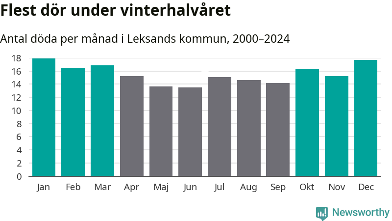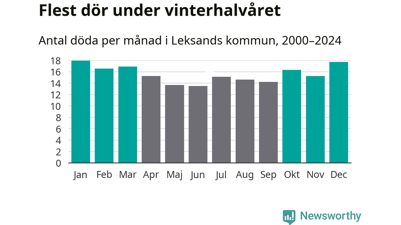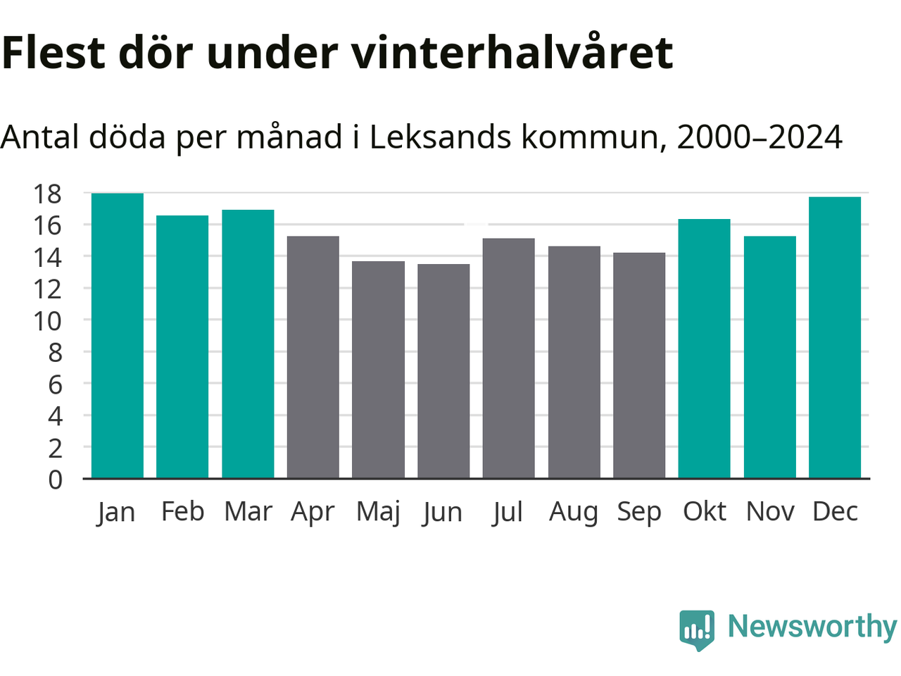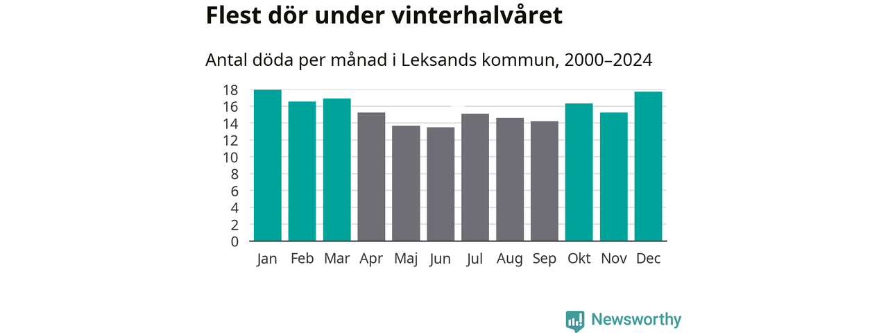 Så är det även i Leksand. Under de senaste 25 åren har 2 450 personer dött i kommunen under vinterhalvåret, jämfört med 2 163 personer under sommarhalvåret – alltså 13 procent fler.