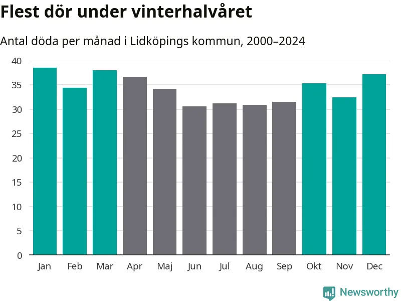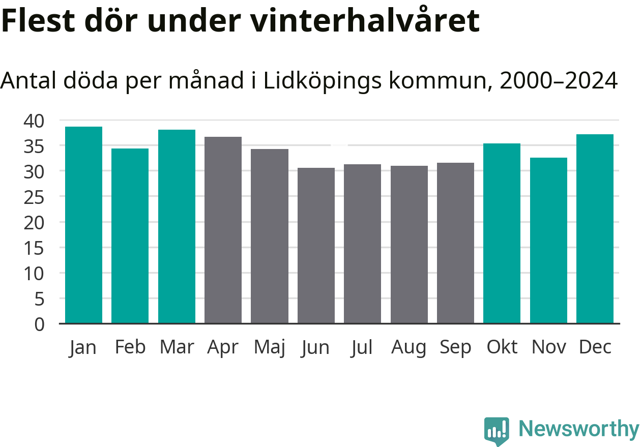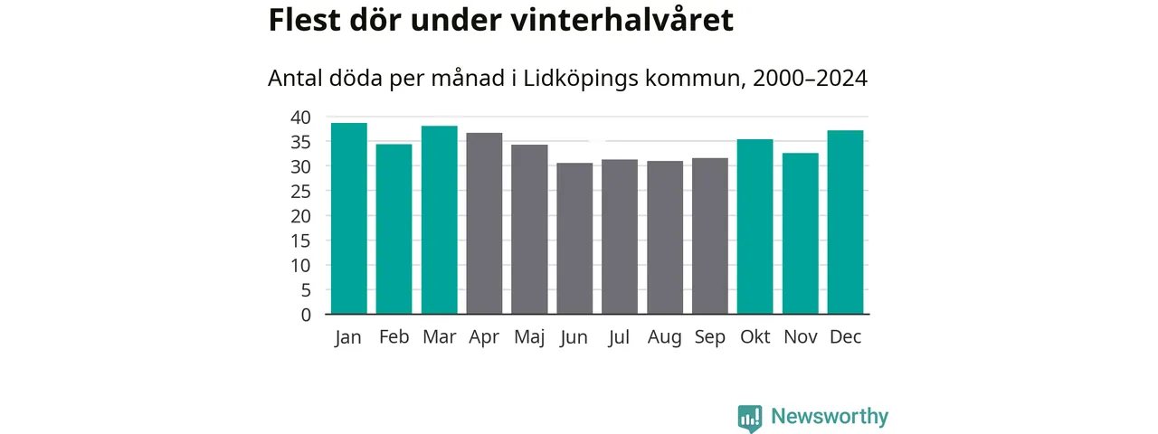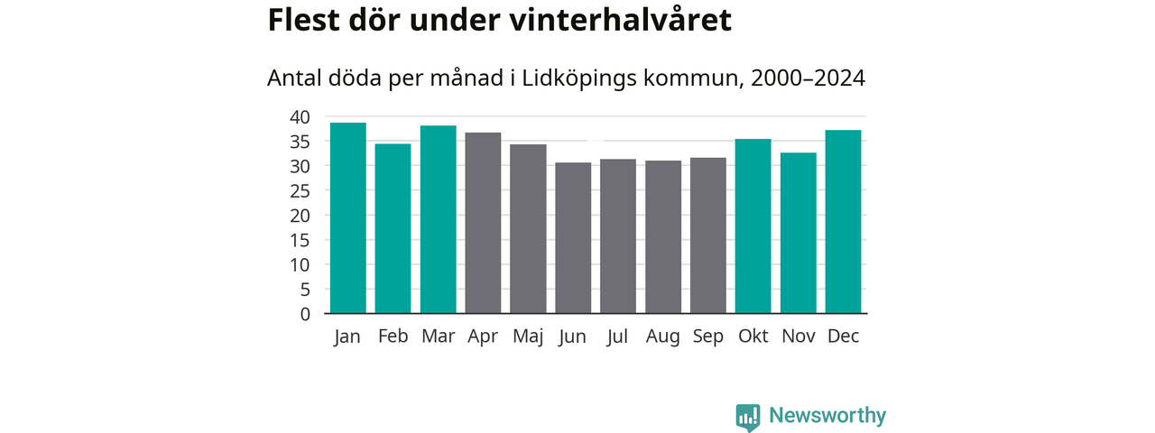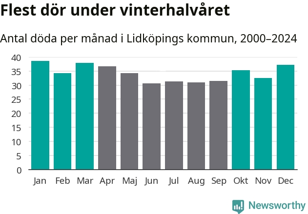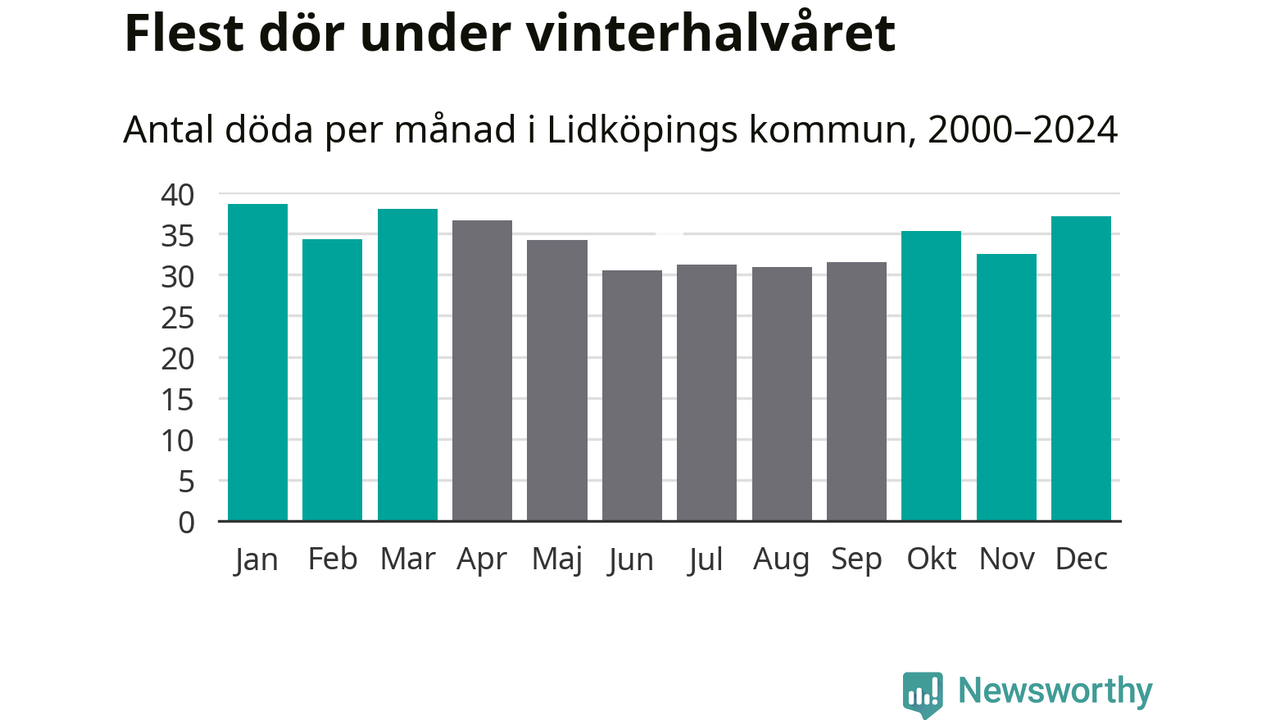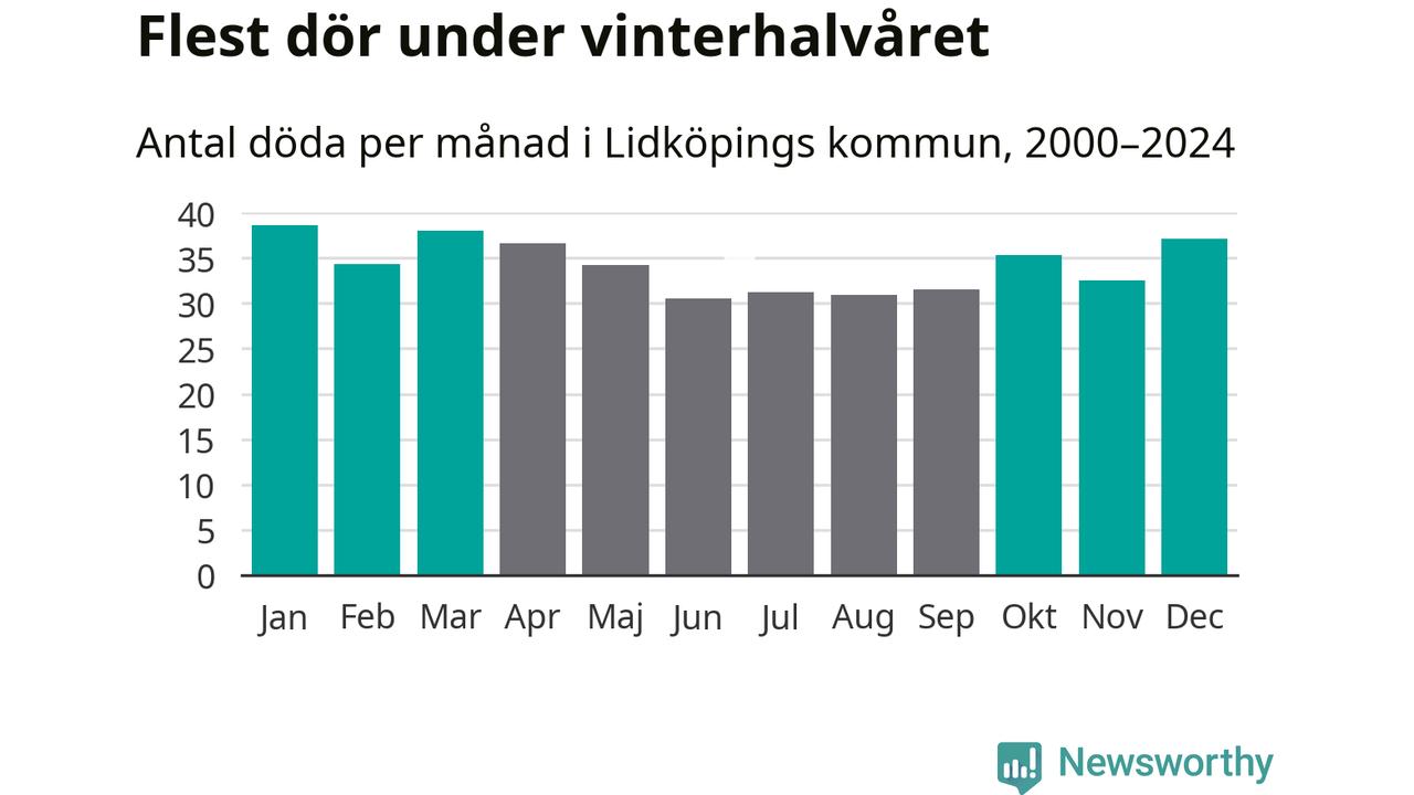 Så är det även i Lidköping. Under de senaste 25 åren har 5 380 personer dött i kommunen under vinterhalvåret, jämfört med 4 770 personer under sommarhalvåret – alltså 13 procent fler.