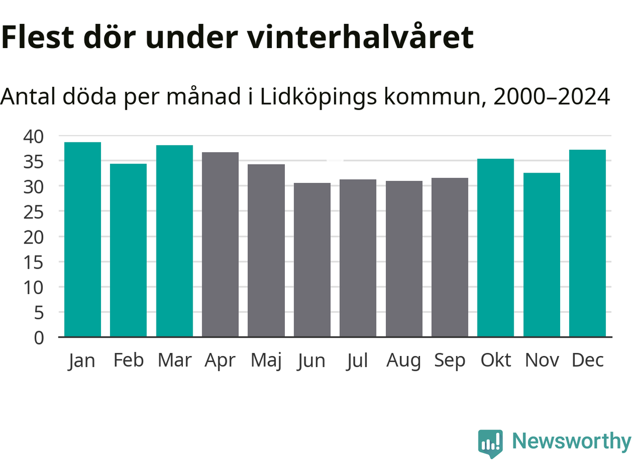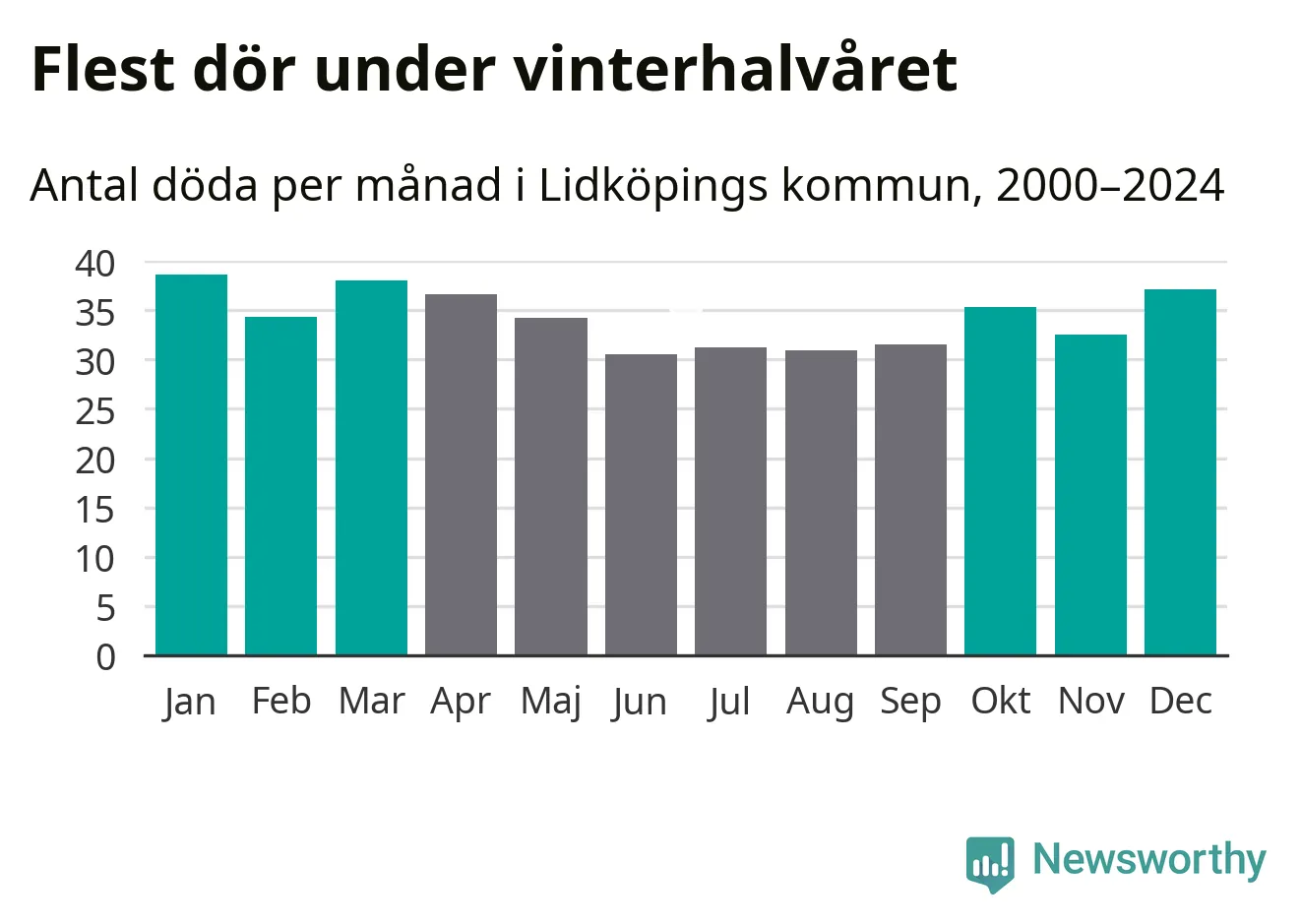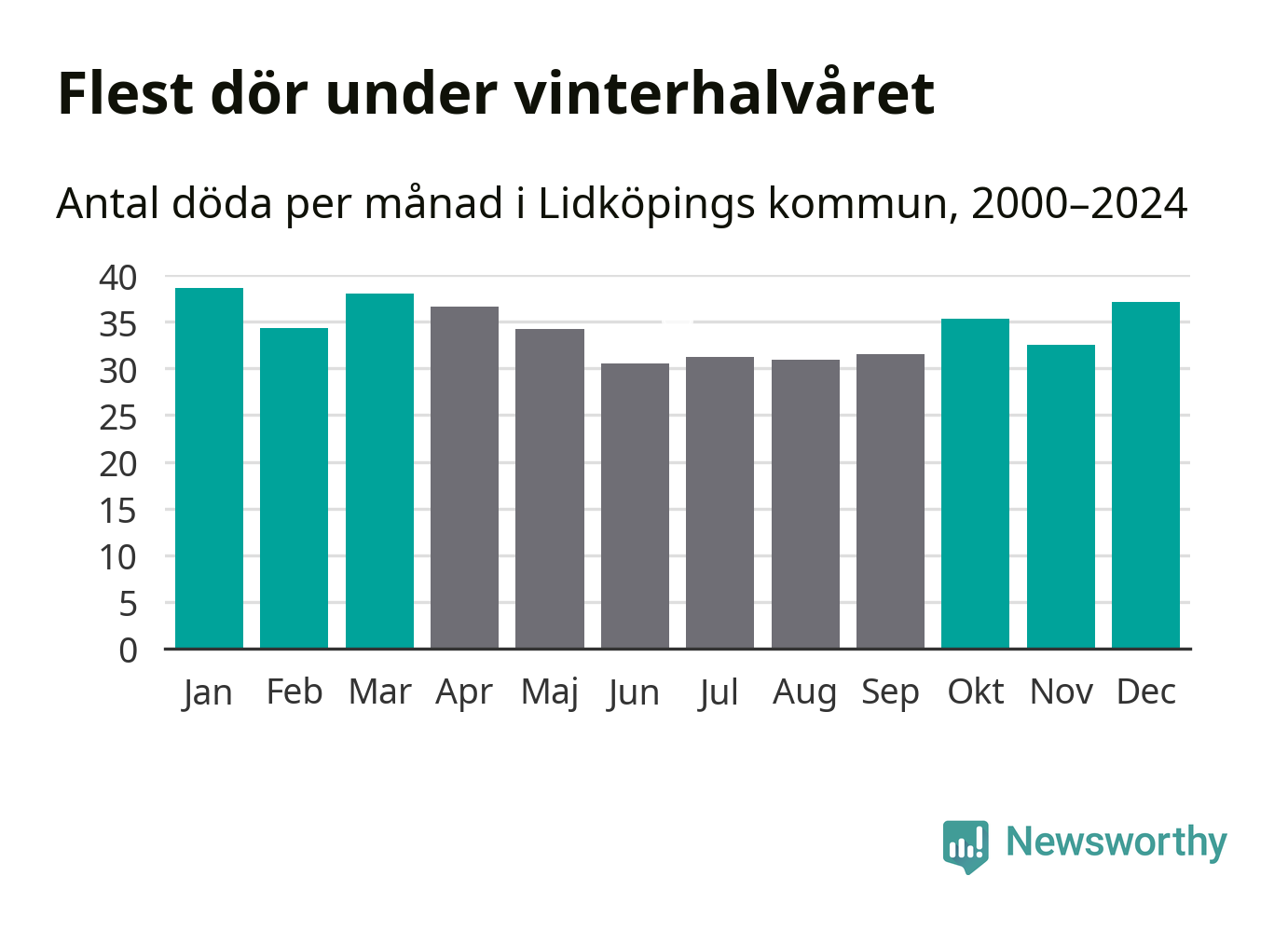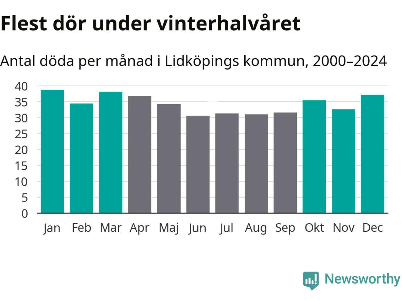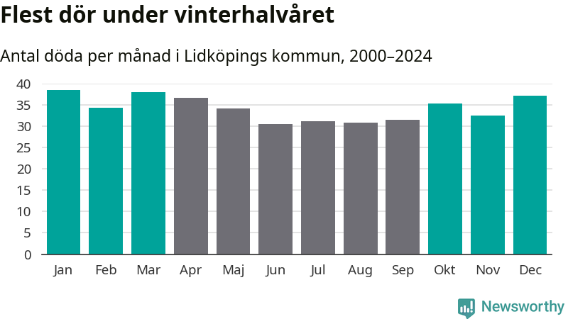 Så är det även i Lidköping. Under de senaste 25 åren har 5 380 personer dött i kommunen under vinterhalvåret, jämfört med 4 770 personer under sommarhalvåret – alltså 13 procent fler.