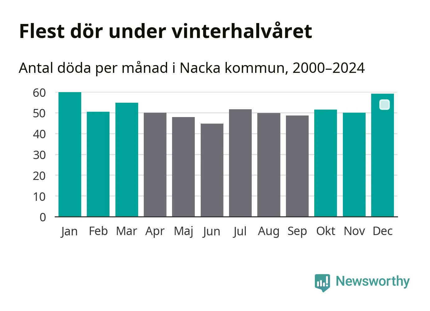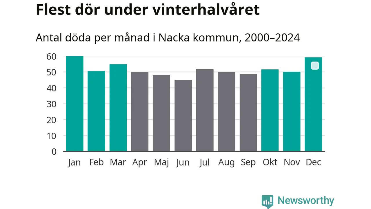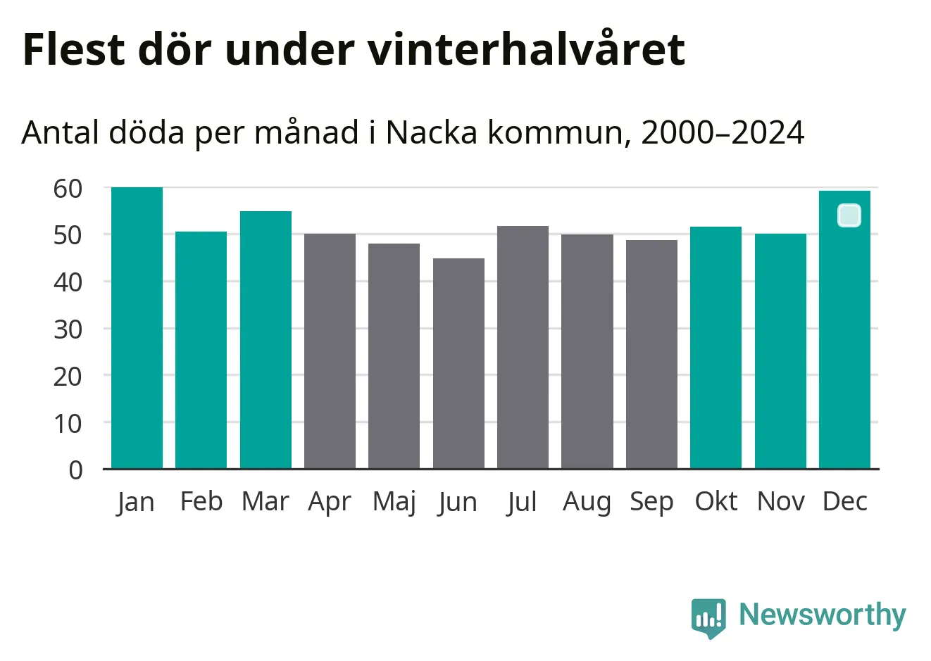 Så är det även i Nacka. Under de senaste 25 åren har 8 019 personer dött i kommunen under vinterhalvåret, jämfört med 7 303 personer under sommarhalvåret – alltså tio procent fler.