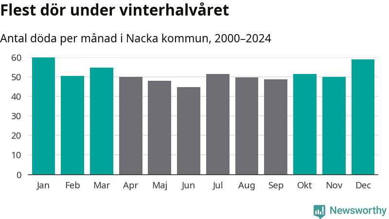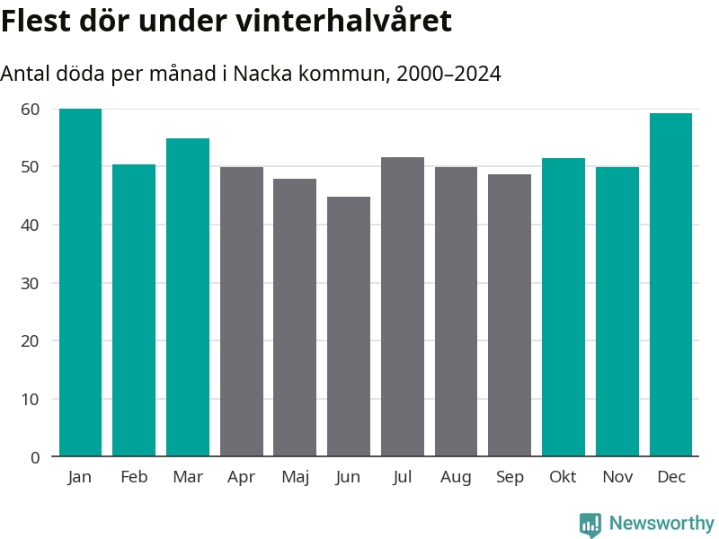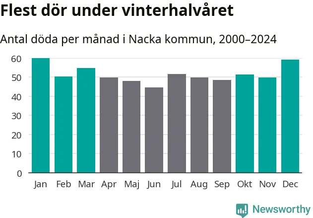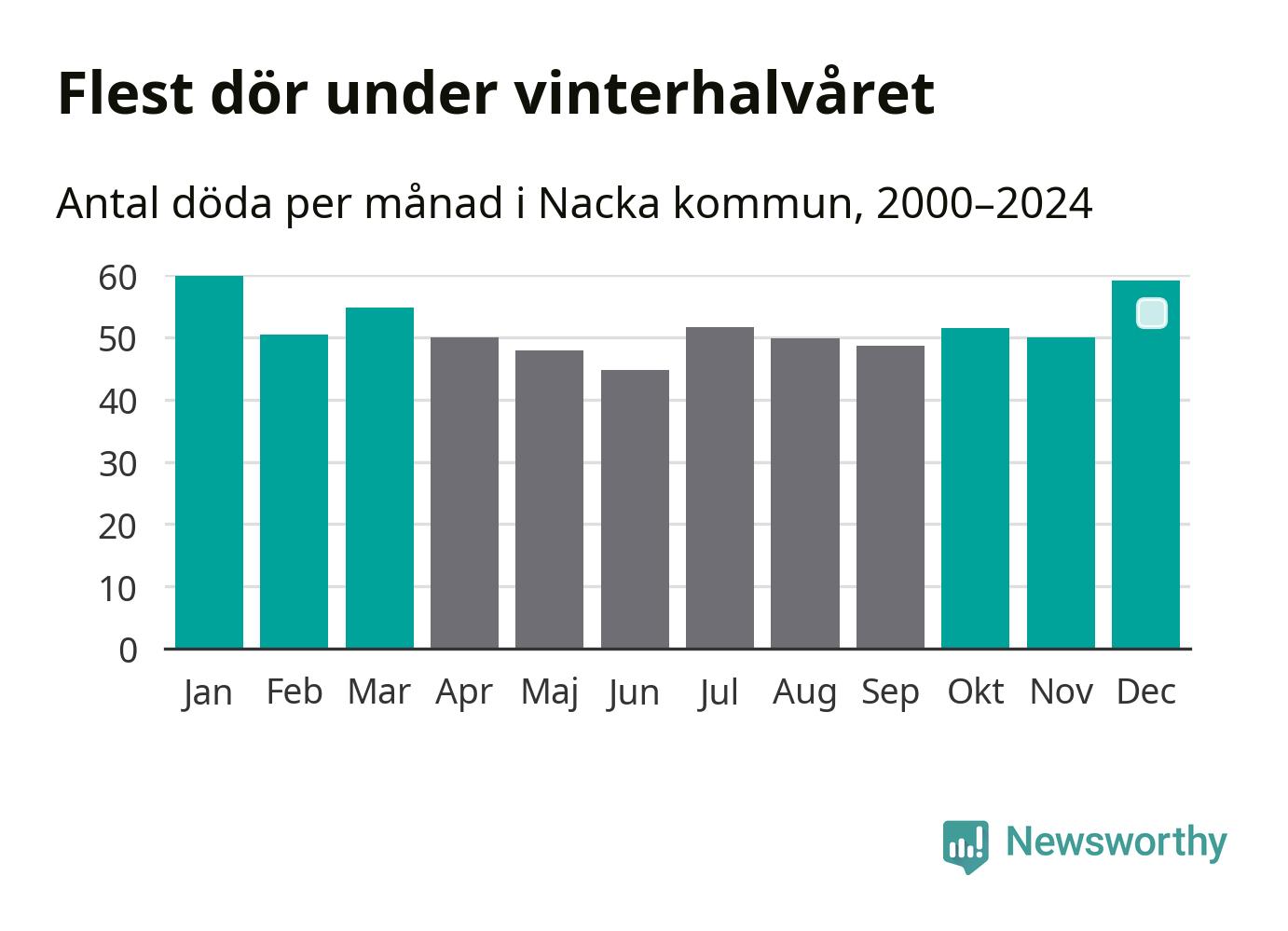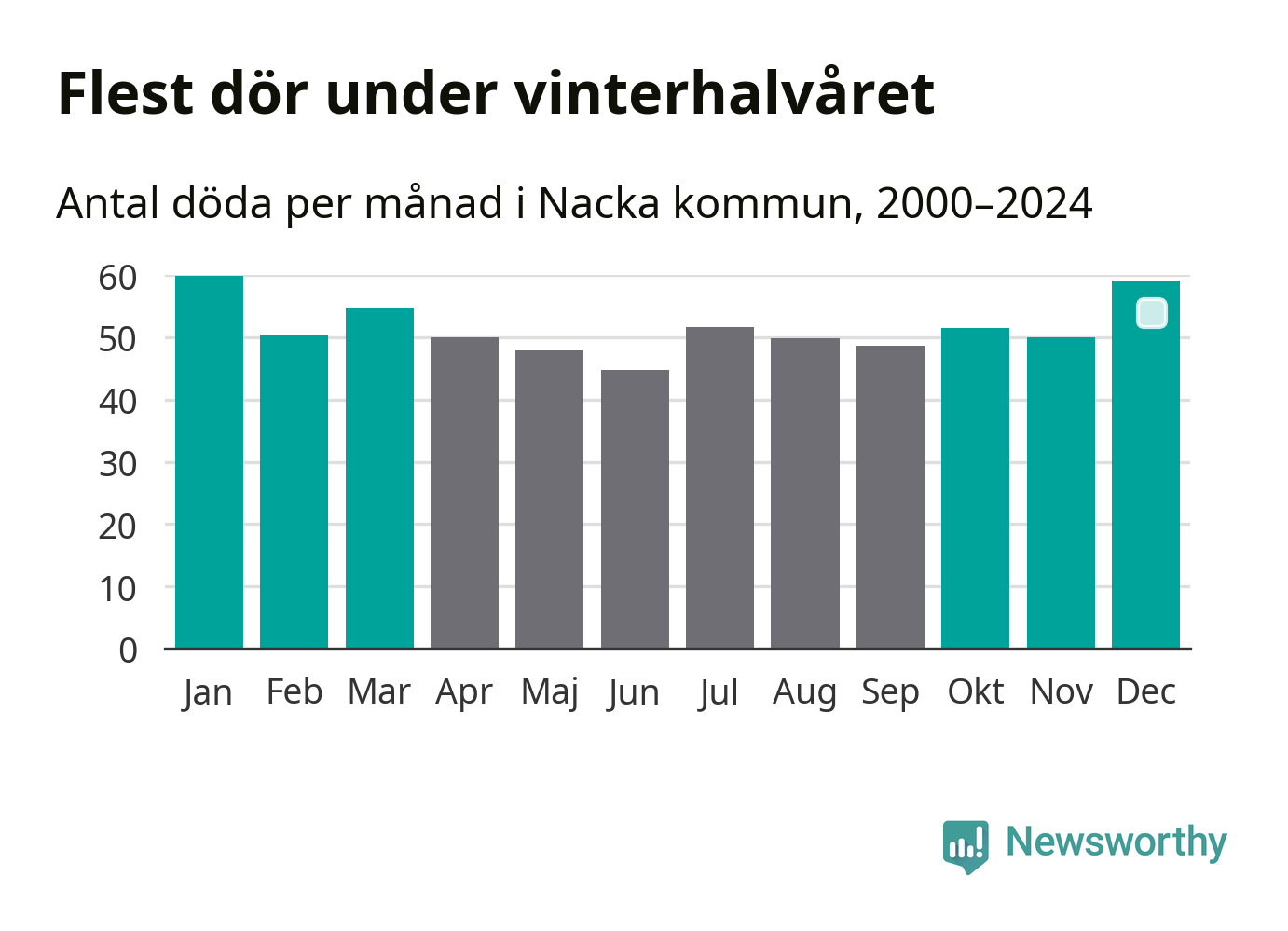 Så är det även i Nacka. Under de senaste 25 åren har 8 019 personer dött i kommunen under vinterhalvåret, jämfört med 7 303 personer under sommarhalvåret – alltså tio procent fler.