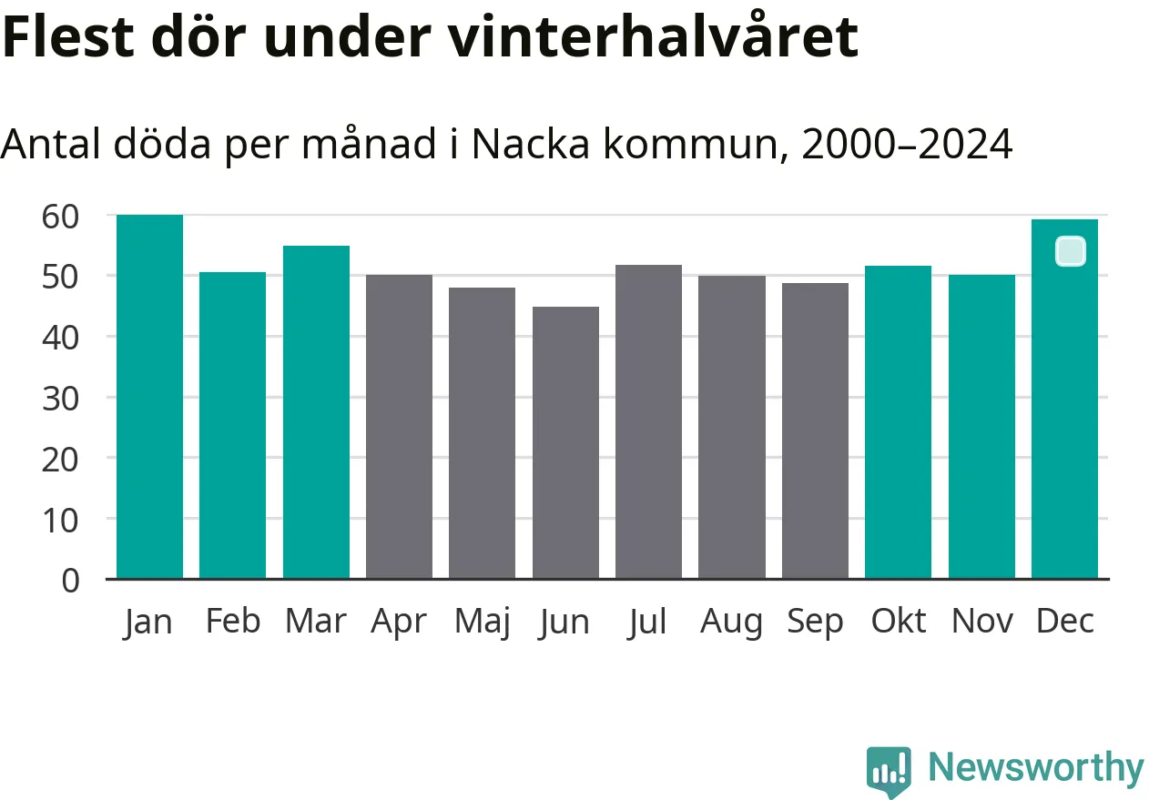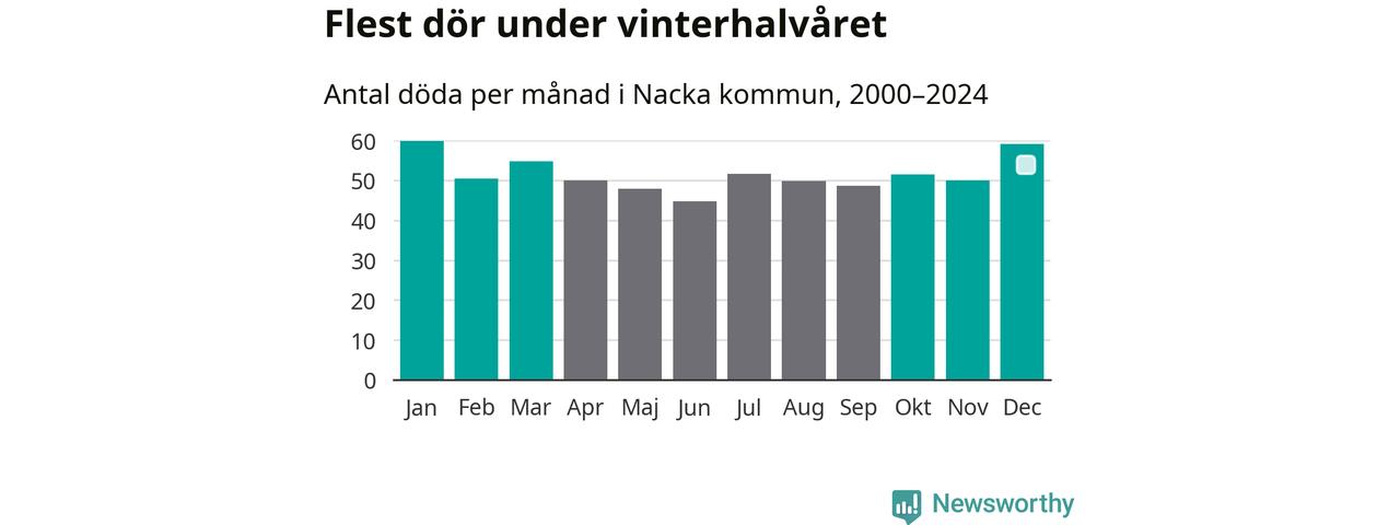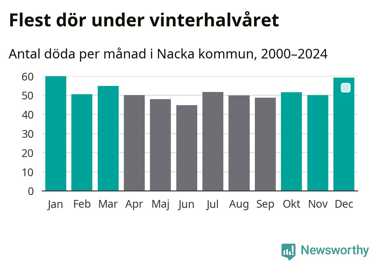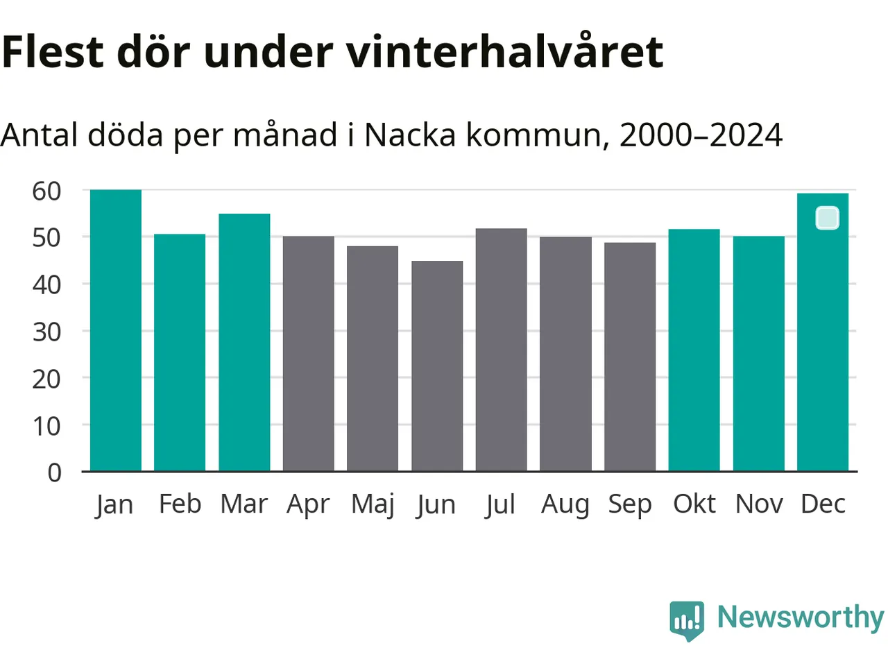 I landet som helhet är det veckorna kring årsskiftet som är de allra dödligaste. Så är det även i Nacka, där den dödligaste perioden infaller under vecka 52, enligt statistik för de senaste 25 åren. Sammanlagt handlar det om 362 personer , vilket är 23 procent fler än snittet för resten av året.