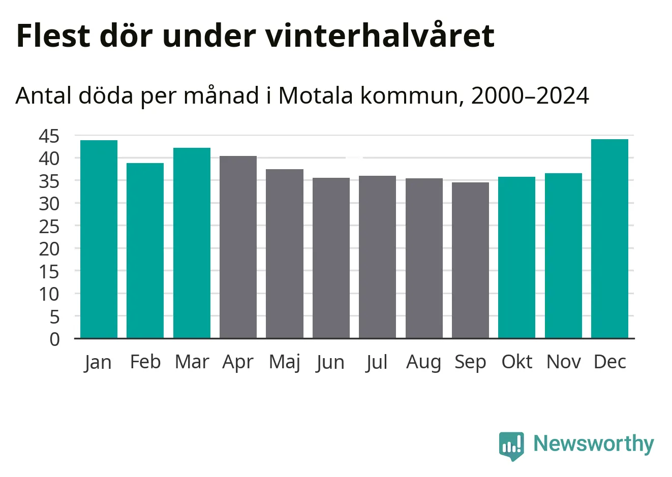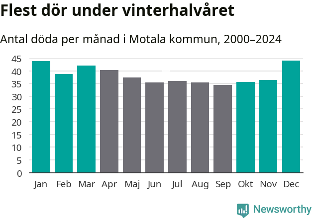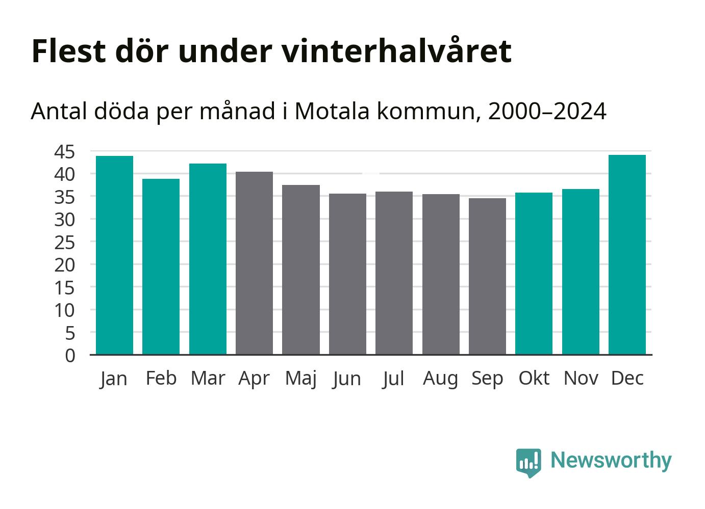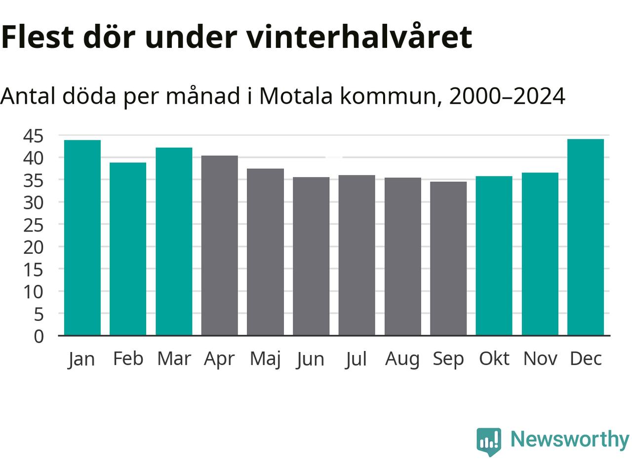 I landet som helhet är det veckorna kring årsskiftet som är de allra dödligaste. I Motala har flest istället dött vecka 51. Sammanlagt under de senaste 25 åren handlar det om 263 personer, vilket är 21 procent fler än snittet för resten av året.