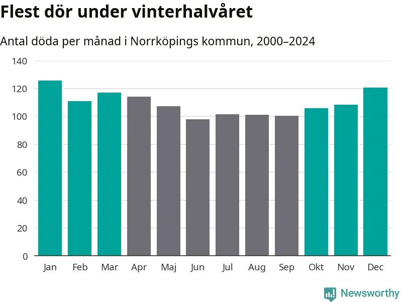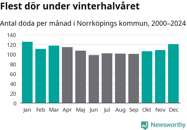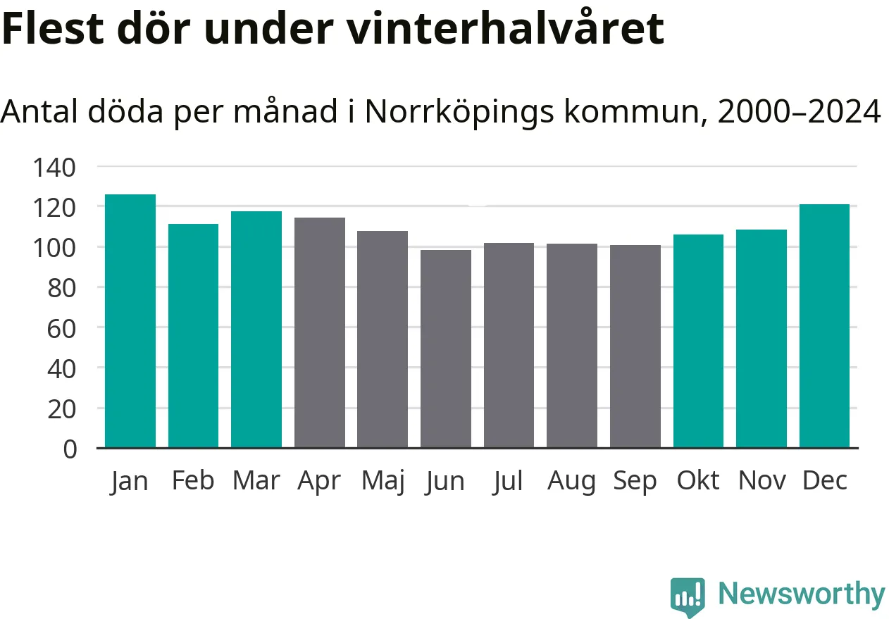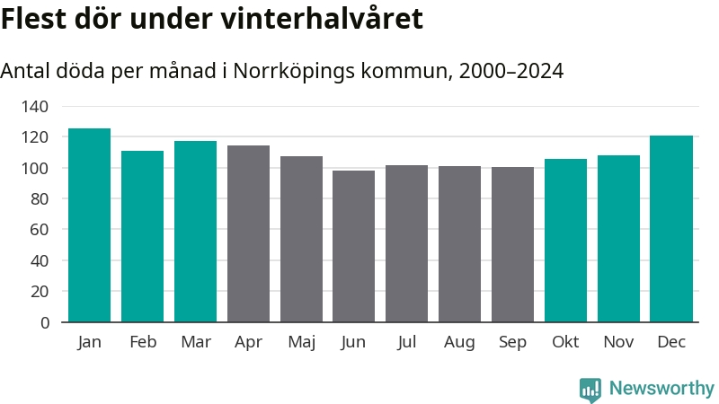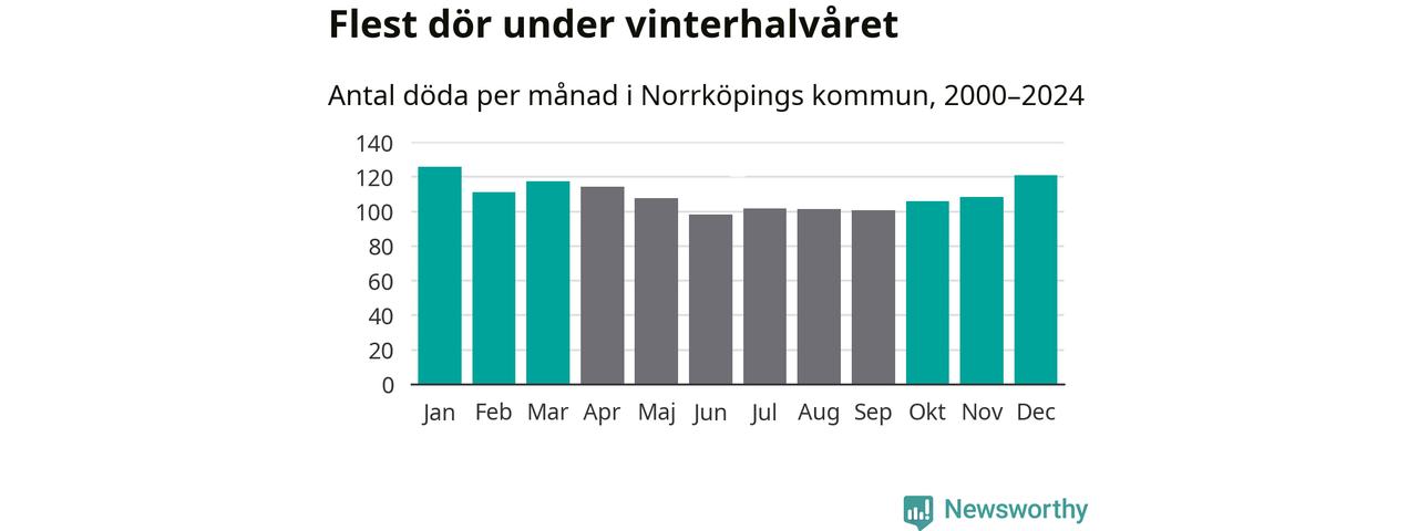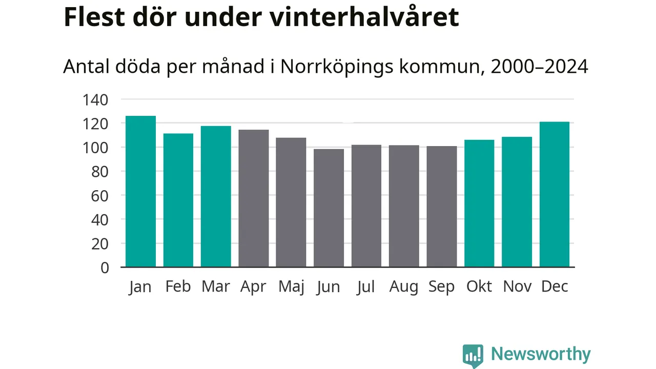 Så är det även i Norrköping. Under de senaste 25 åren har 17 149 personer dött i kommunen under vinterhalvåret, jämfört med 15 119 personer under sommarhalvåret – alltså 13 procent fler.