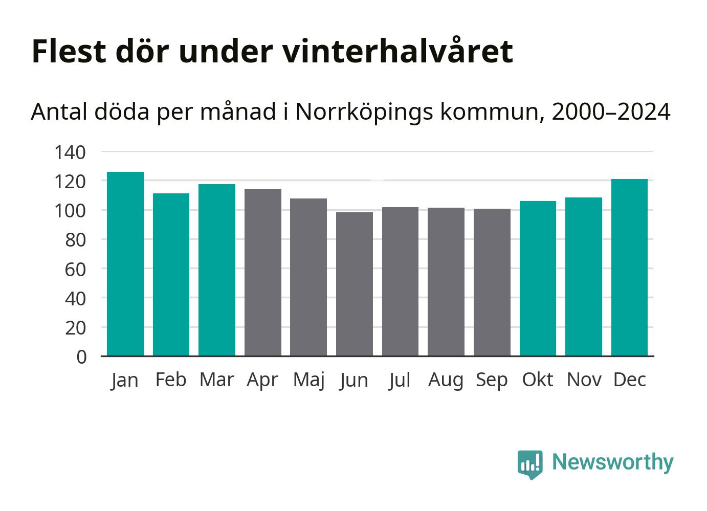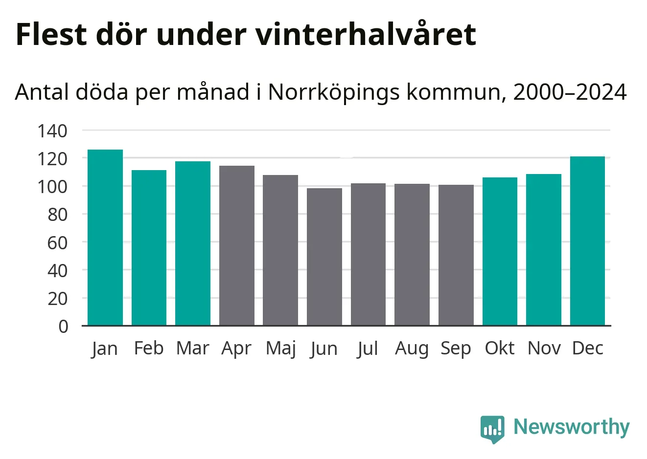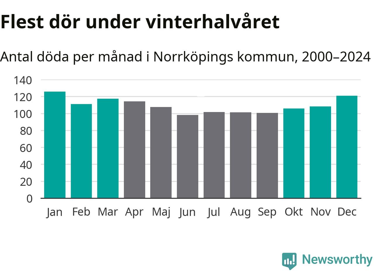 Så är det även i Norrköping. Under de senaste 25 åren har 17 149 personer dött i kommunen under vinterhalvåret, jämfört med 15 119 personer under sommarhalvåret – alltså 13 procent fler.