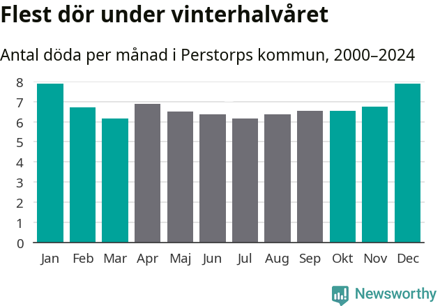 Så är det även i Perstorp. Under de senaste 25 åren har 1 018 personer dött i kommunen under vinterhalvåret, jämfört med 944 personer under sommarhalvåret – alltså åtta procent fler.