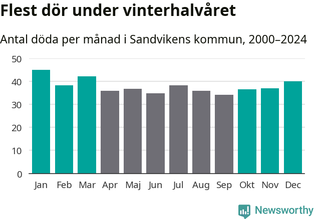 Så är det även i Sandviken. Under de senaste 25 åren har 5 878 personer dött i kommunen under vinterhalvåret, jämfört med 5 325 personer under sommarhalvåret – alltså tio procent fler.