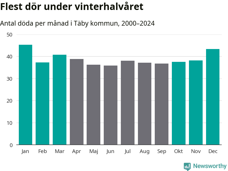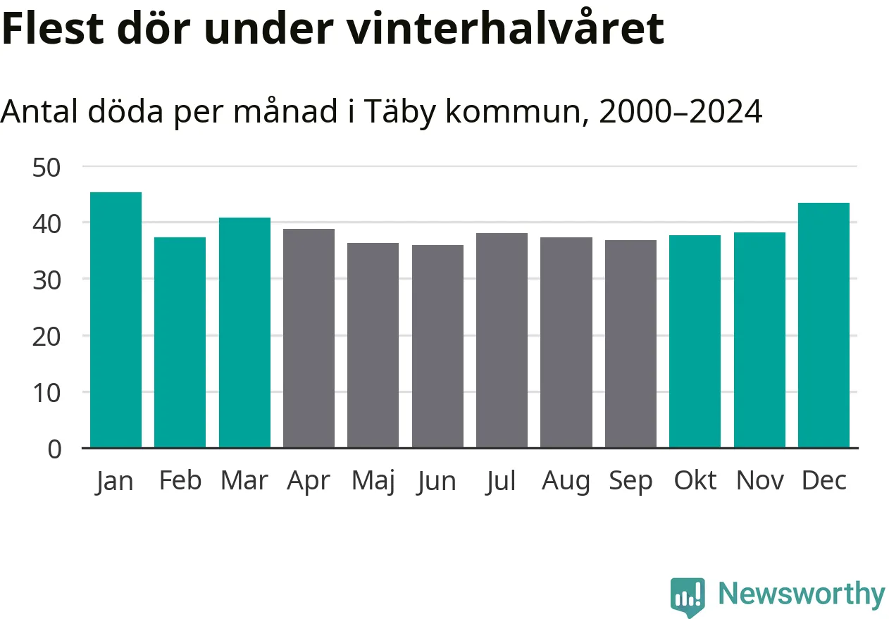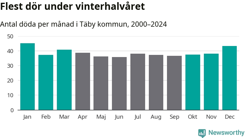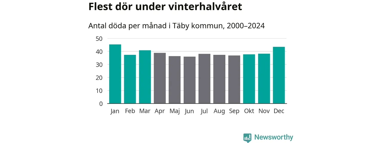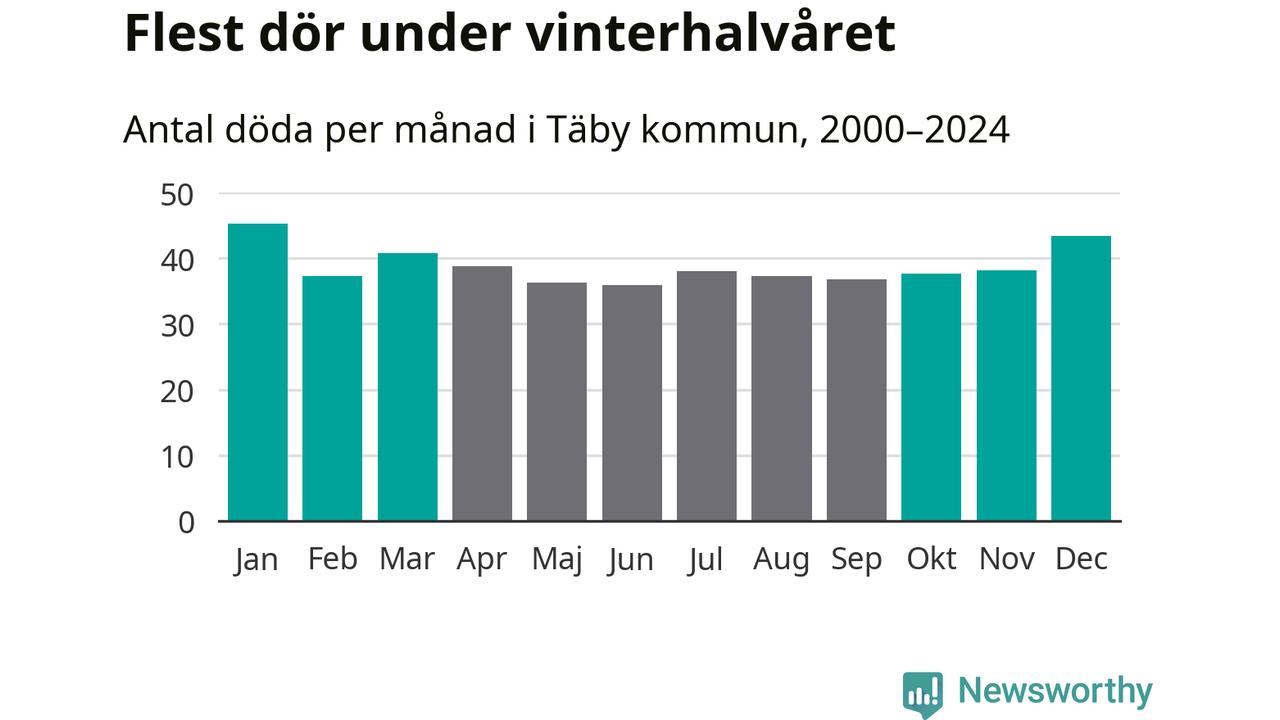 I landet som helhet är det veckorna kring årsskiftet som är de allra dödligaste. Så är det även i Täby, där den dödligaste perioden infaller under vecka 1, enligt statistik för de senaste 25 åren. Sammanlagt handlar det om 279 personer , vilket är 26 procent fler än snittet för resten av året.