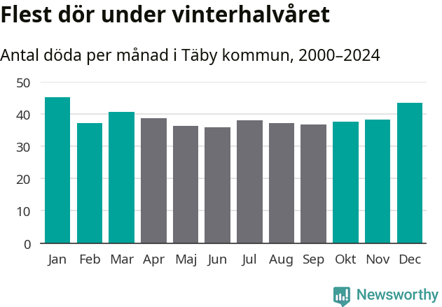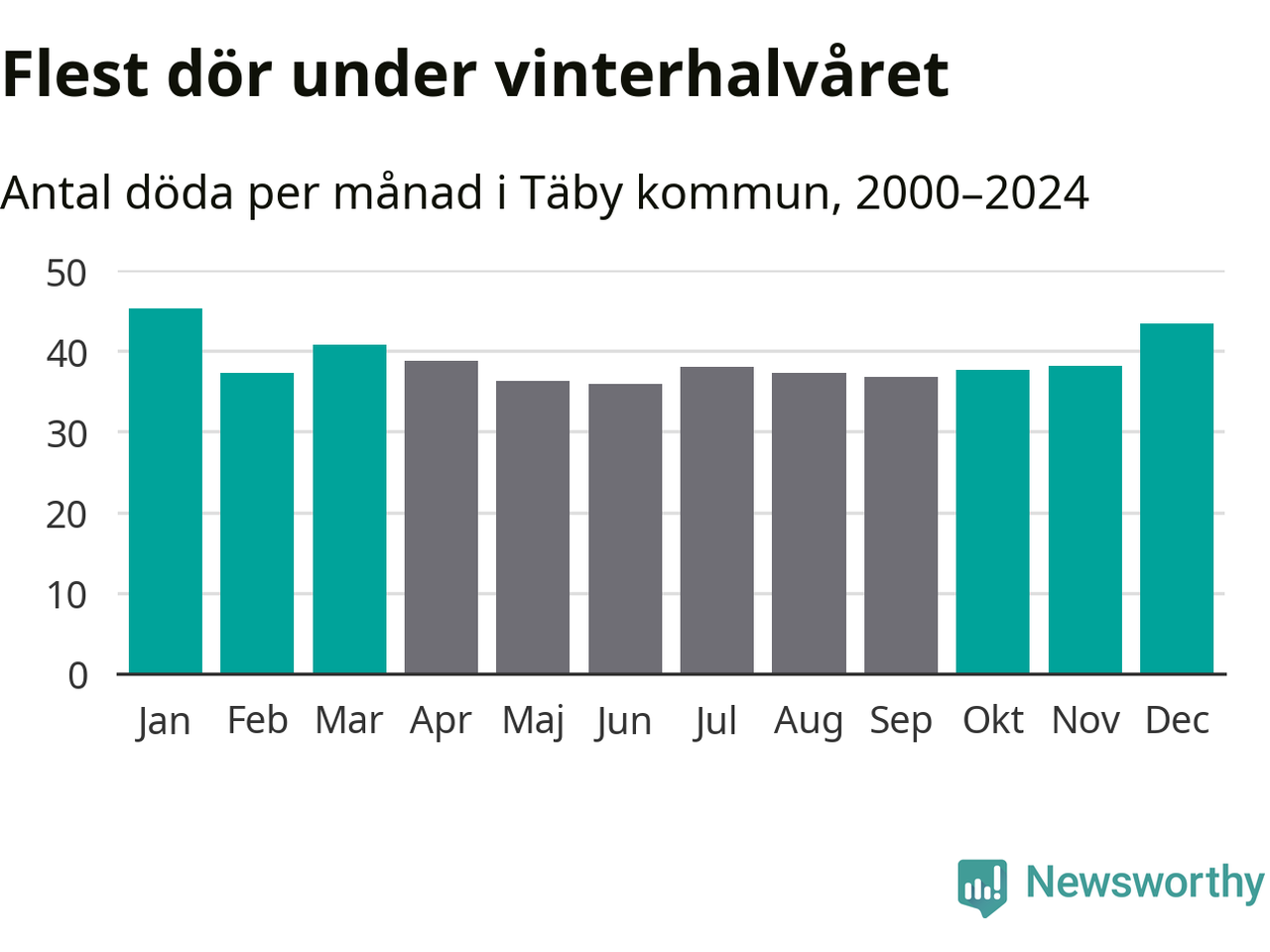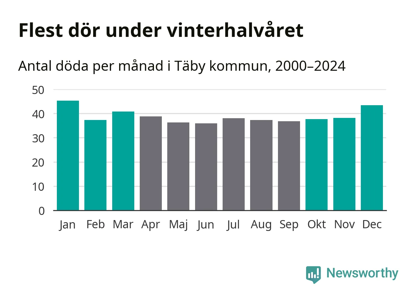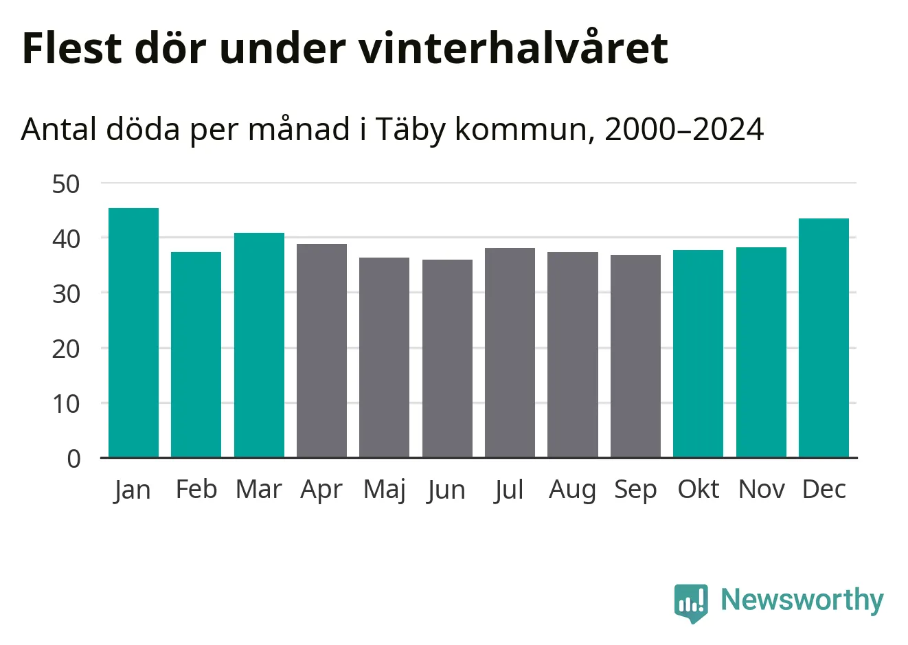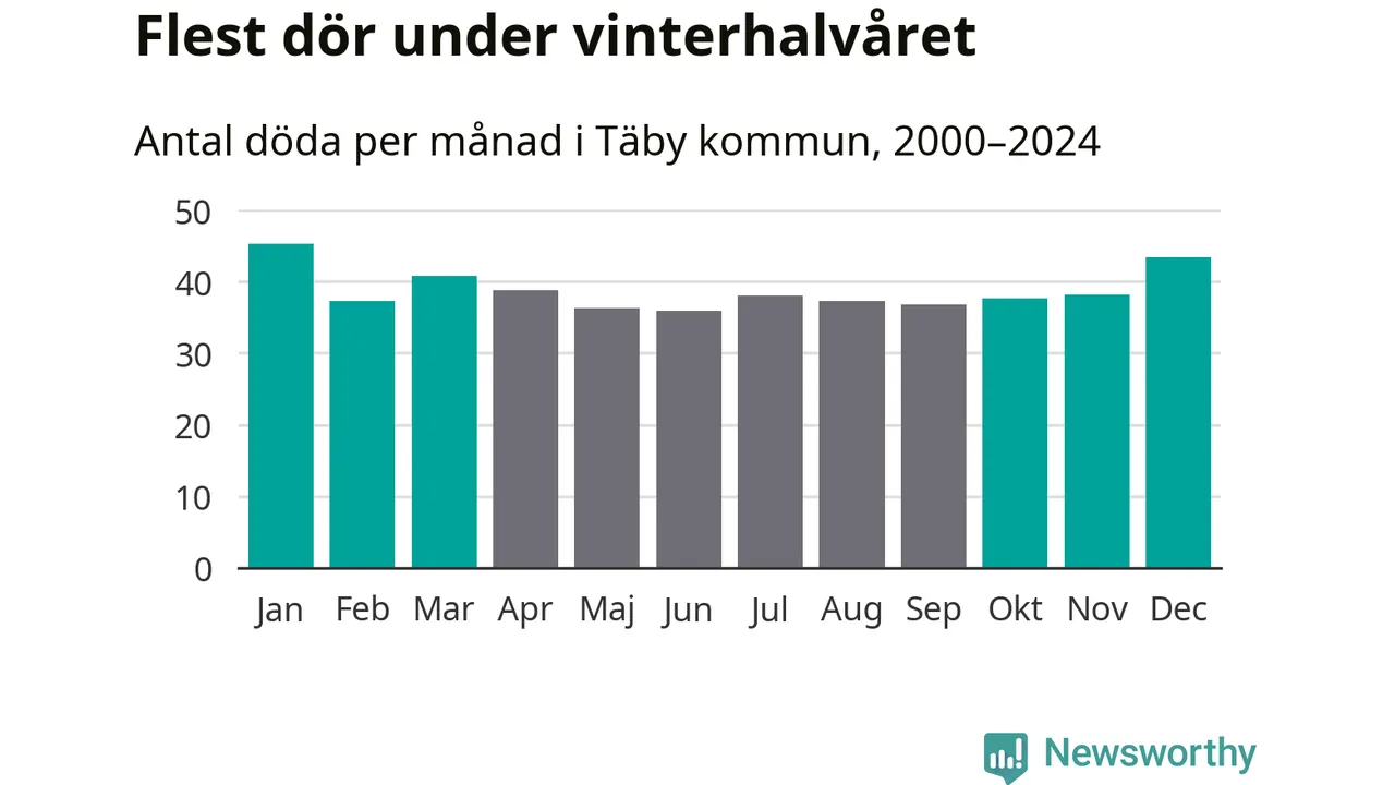 Så är det även i Täby. Under de senaste 25 åren har 6 037 personer dött i kommunen under vinterhalvåret, jämfört med 5 518 personer under sommarhalvåret – alltså nio procent fler.