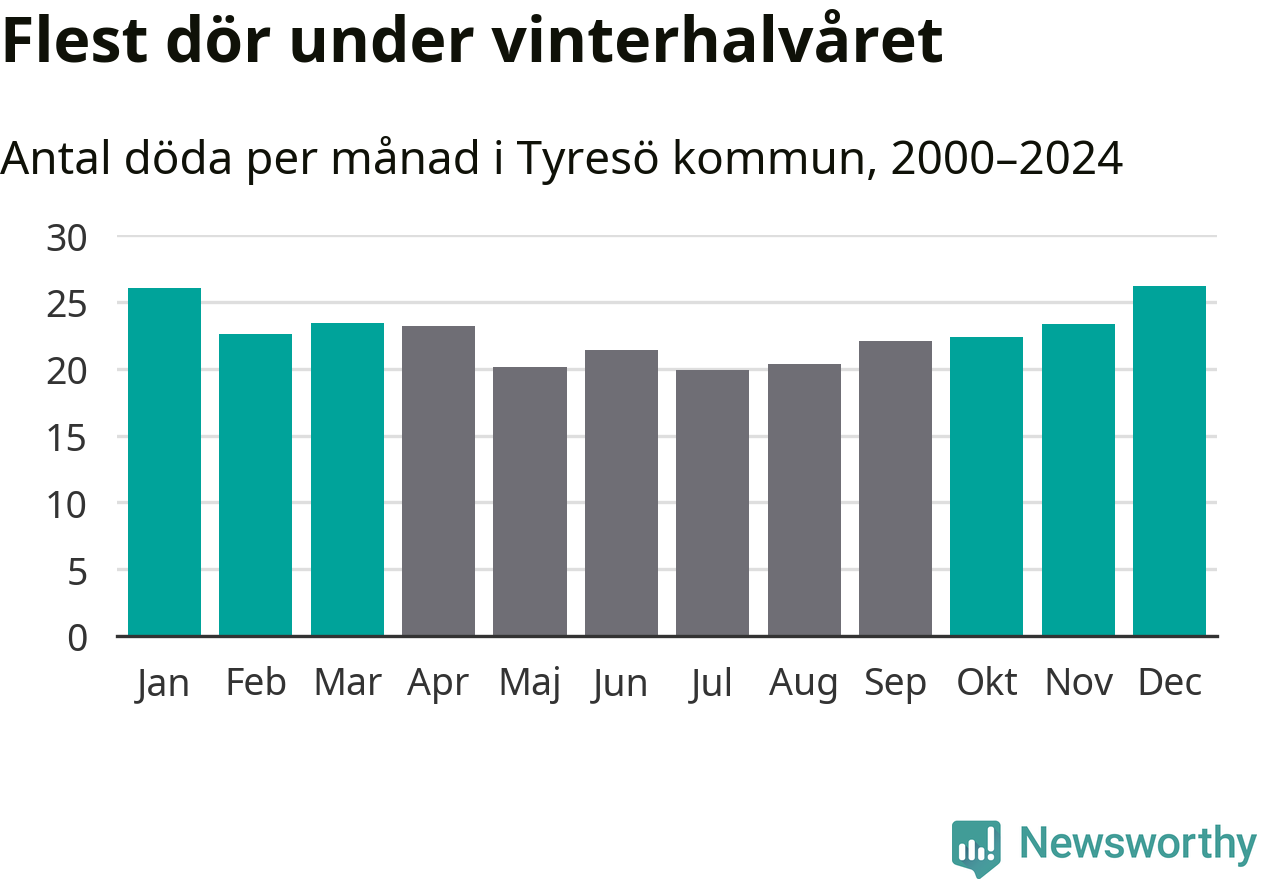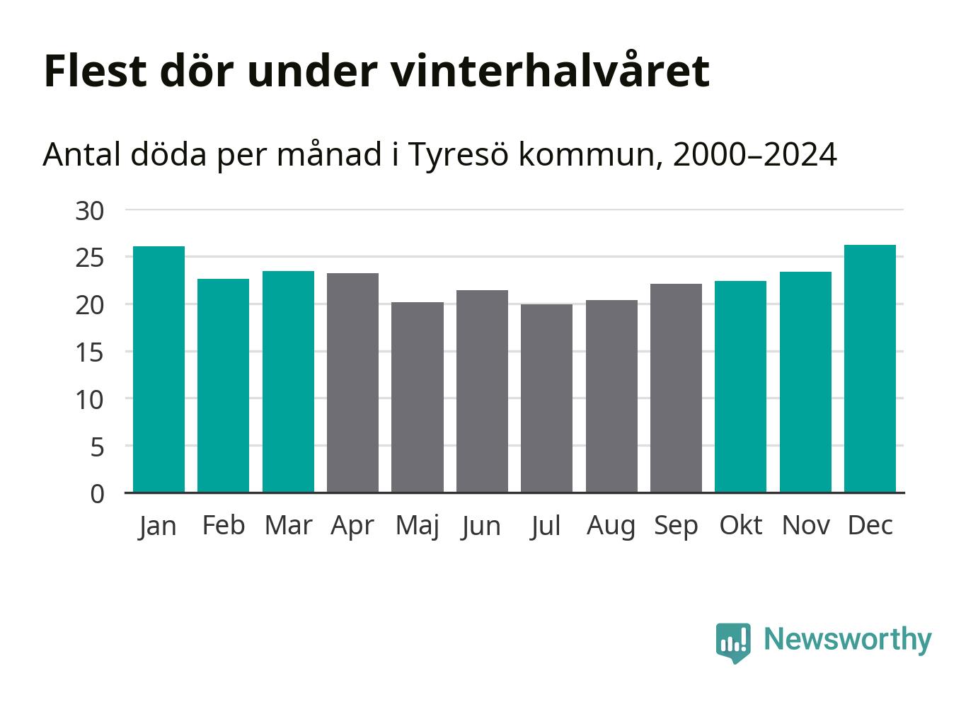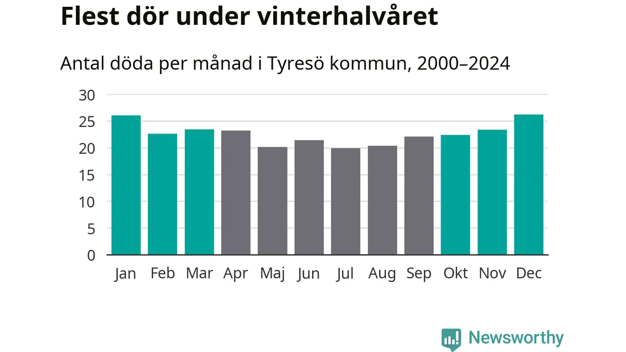 Så är det även i Tyresö. Under de senaste 25 åren har 3 572 personer dött i kommunen under vinterhalvåret, jämfört med 3 143 personer under sommarhalvåret – alltså 14 procent fler.