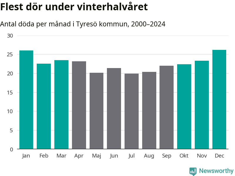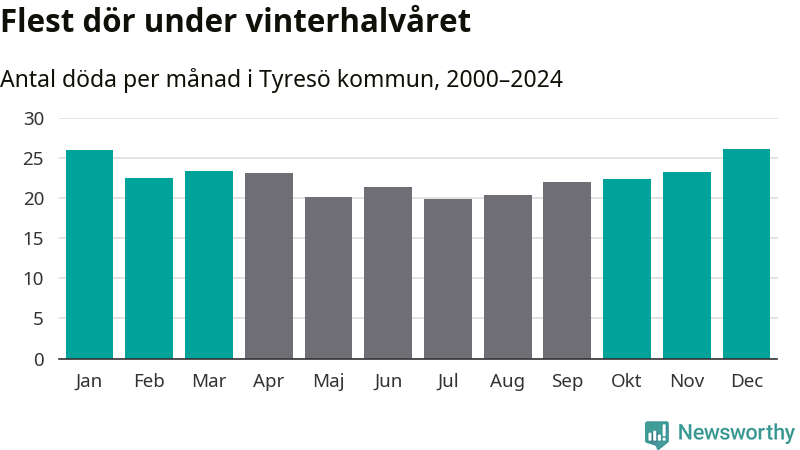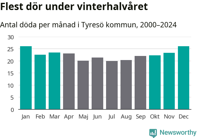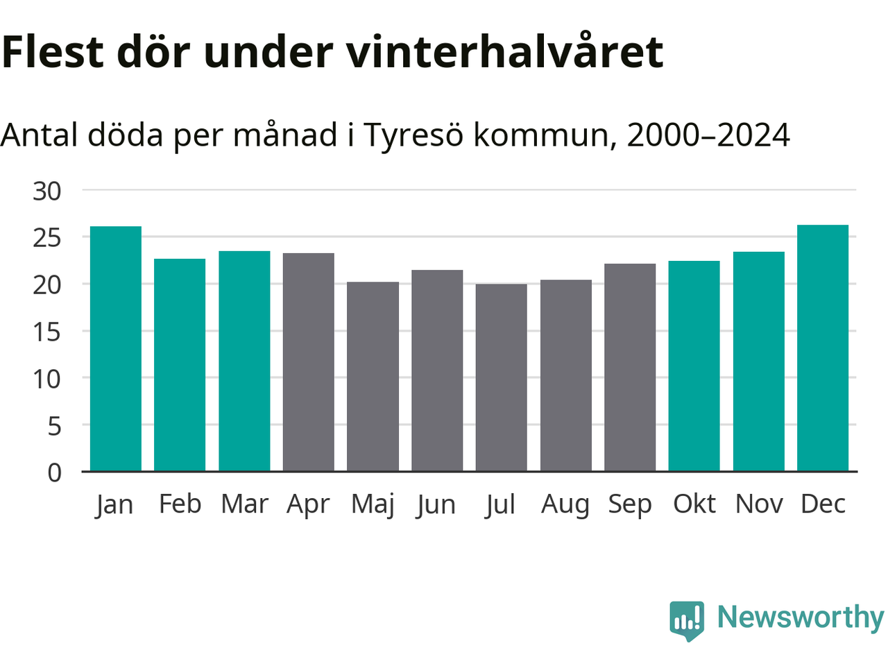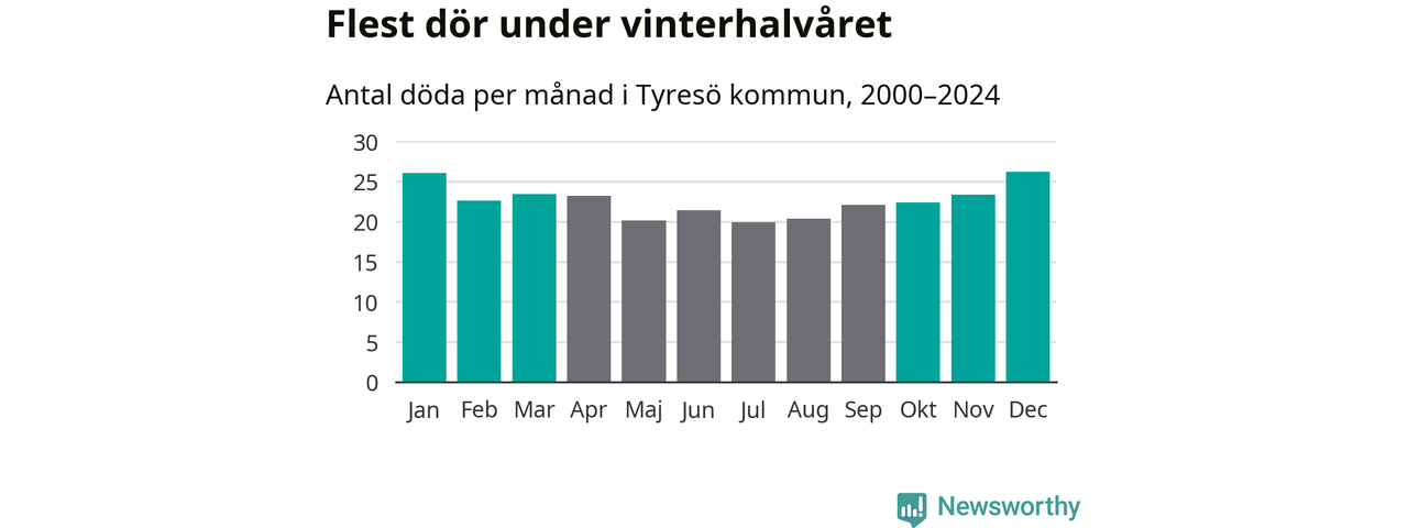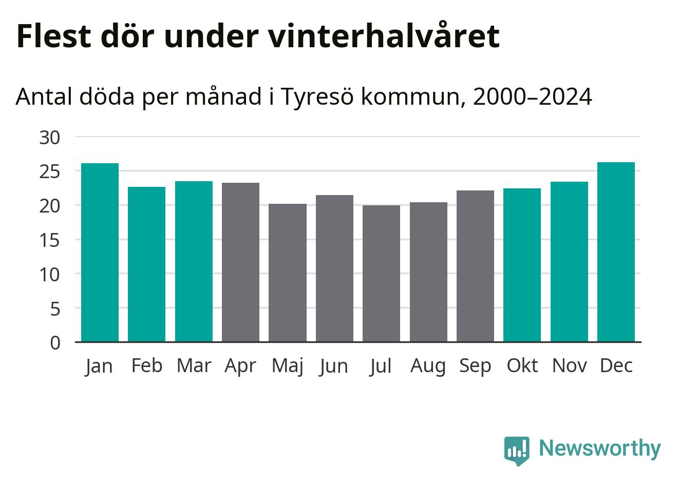 Så är det även i Tyresö. Under de senaste 25 åren har 3 572 personer dött i kommunen under vinterhalvåret, jämfört med 3 143 personer under sommarhalvåret – alltså 14 procent fler.