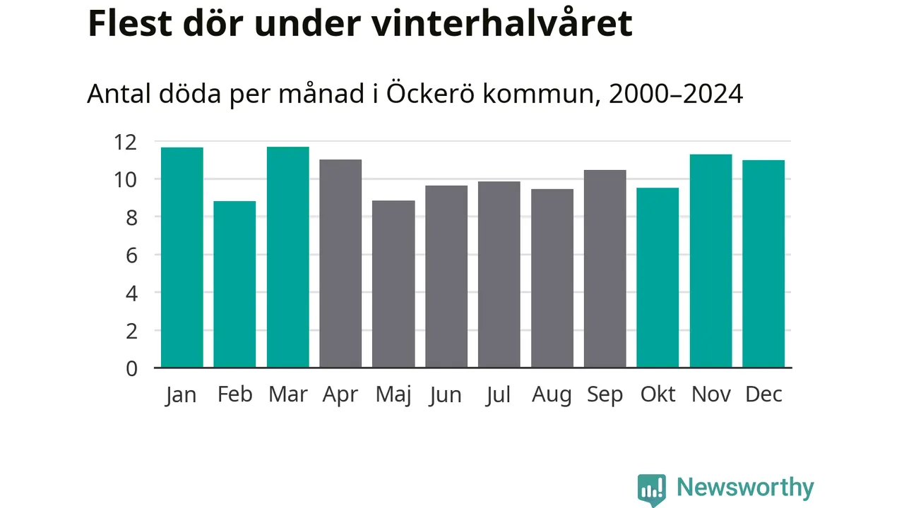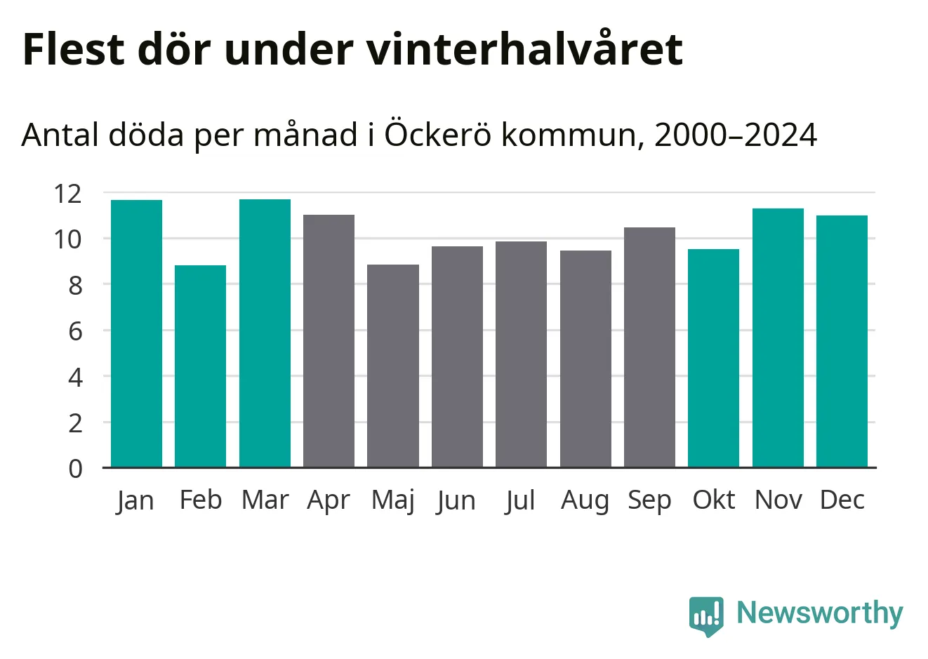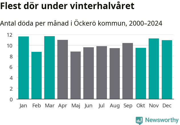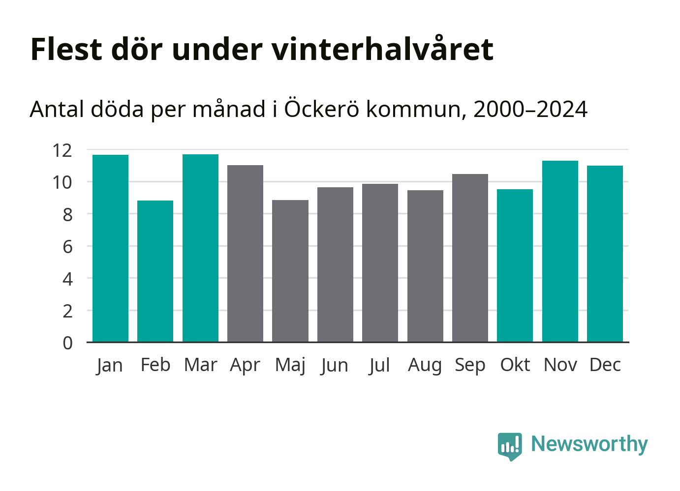 Så är det även på Öckerö. Under de senaste 25 åren har 1 601 personer dött i kommunen under vinterhalvåret, jämfört med 1 432 personer under sommarhalvåret – alltså tolv procent fler.