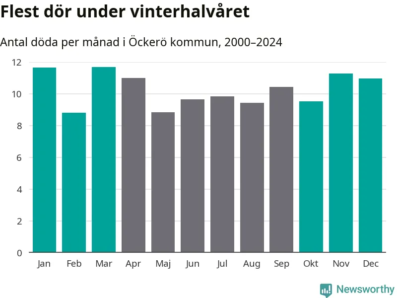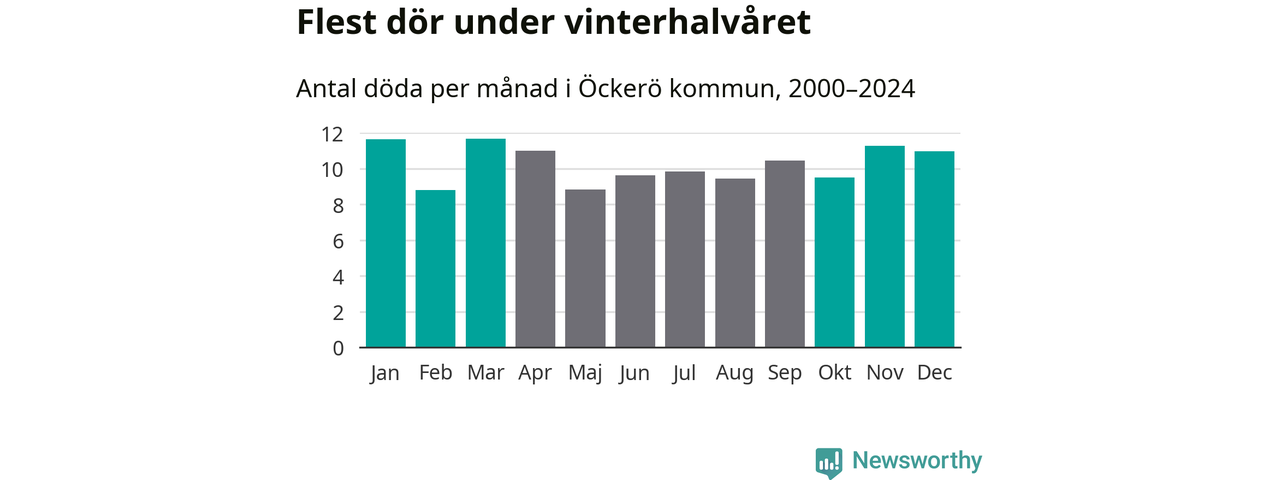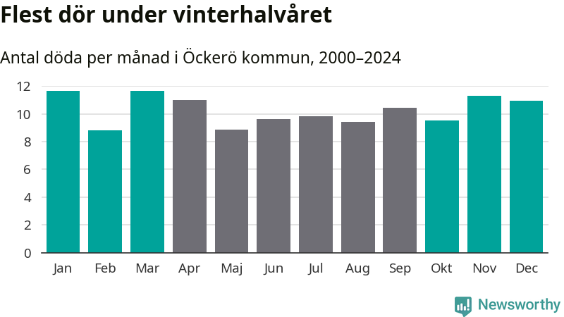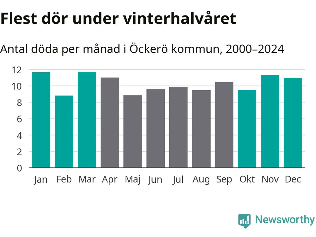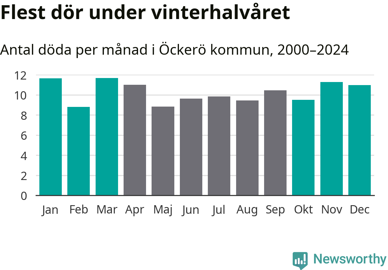 Så är det även på Öckerö. Under de senaste 25 åren har 1 601 personer dött i kommunen under vinterhalvåret, jämfört med 1 432 personer under sommarhalvåret – alltså tolv procent fler.